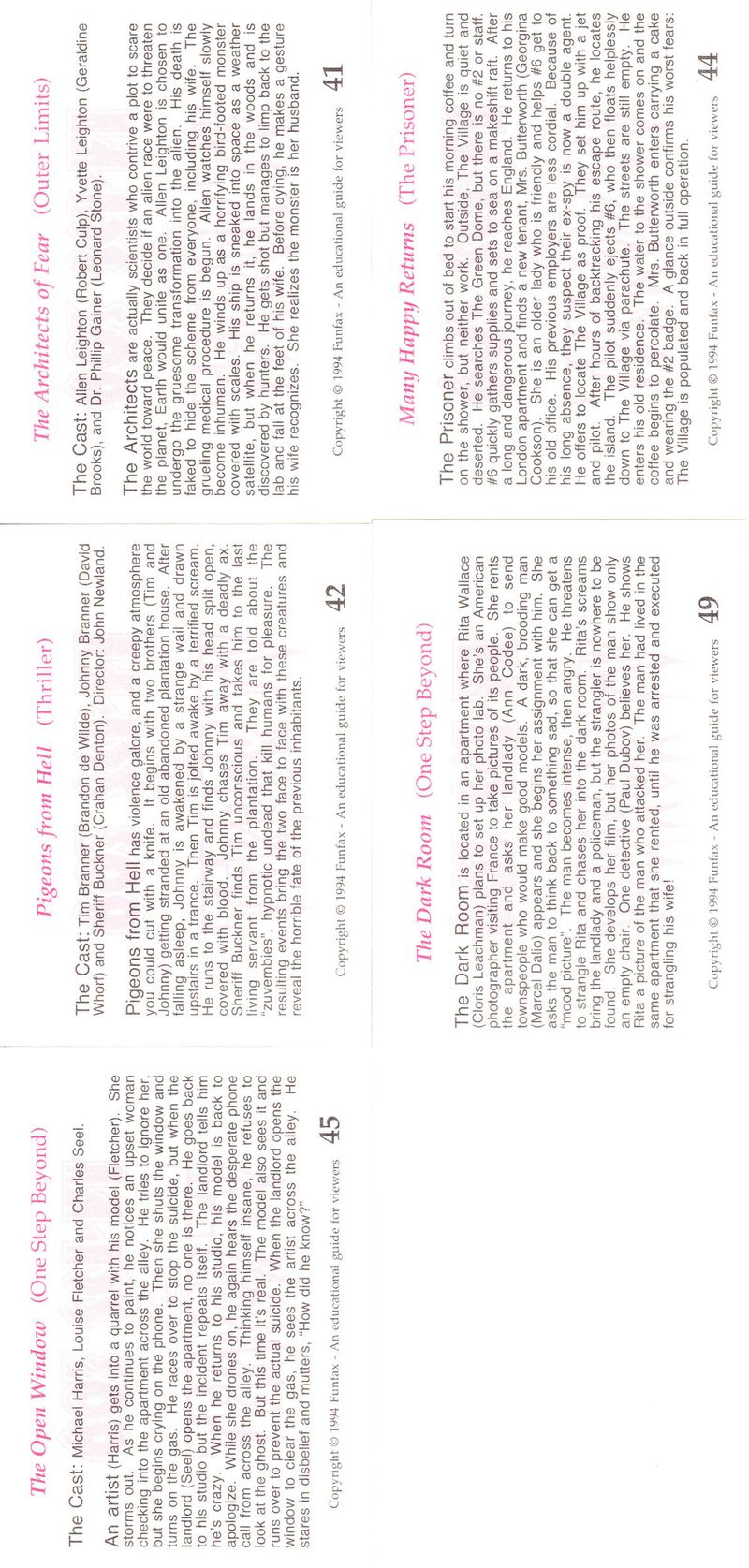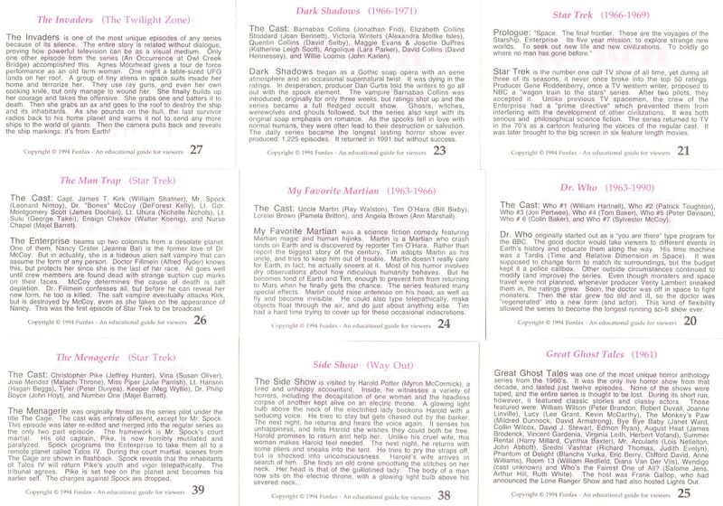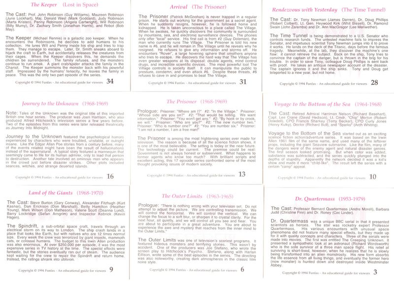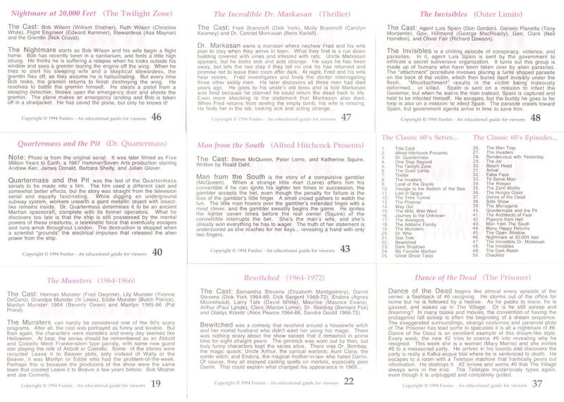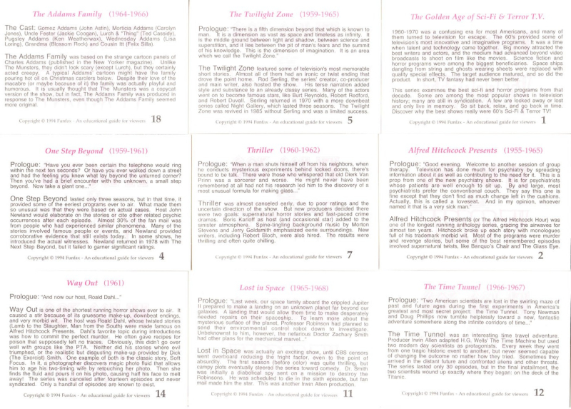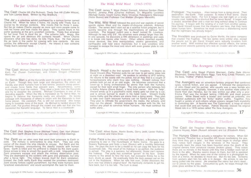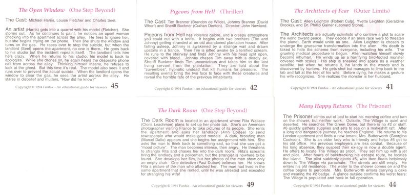 This is a wonderful set of 50 cards, ‘an educational guide for viewers,’ from Funfax, copyright 1994. This series ‘examines the best sci-fi and horror programs from that decade’ [1960 to 1970]. Click to enlarge. You will find the information on the back of each card nostalgic and interesting, and a very good selection of unforgettable episodes.