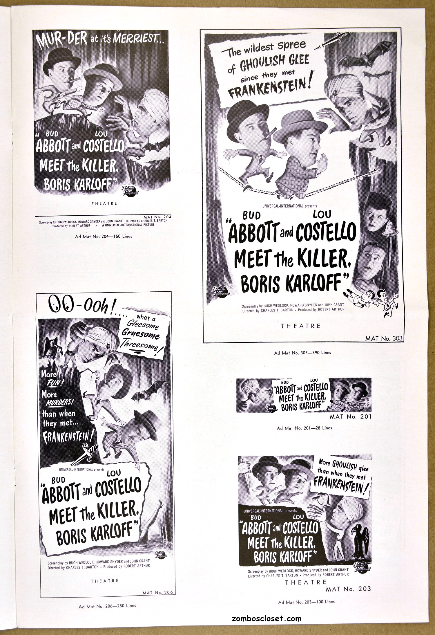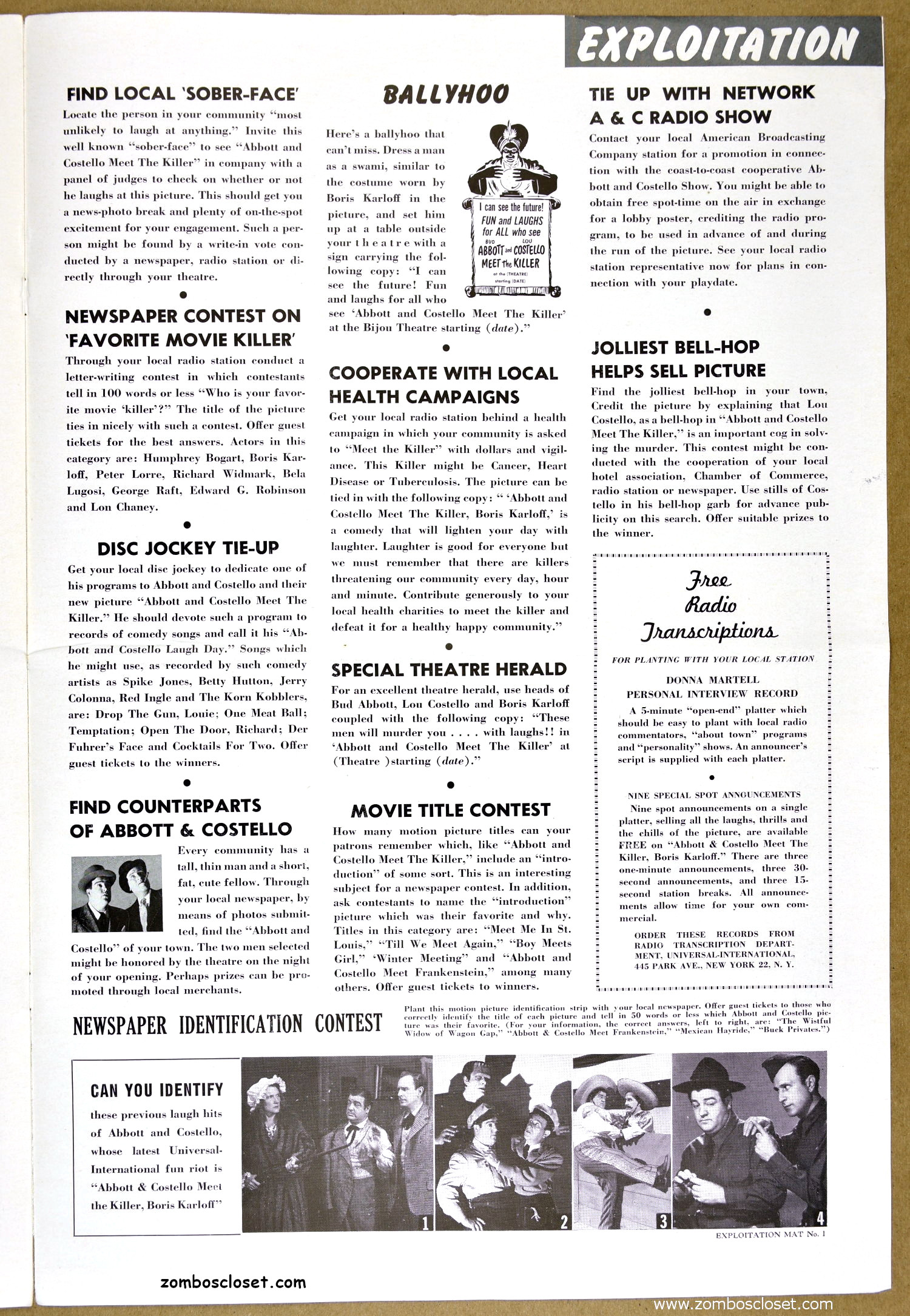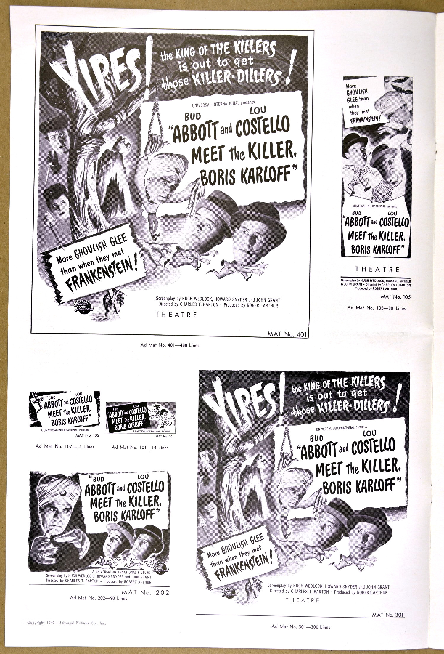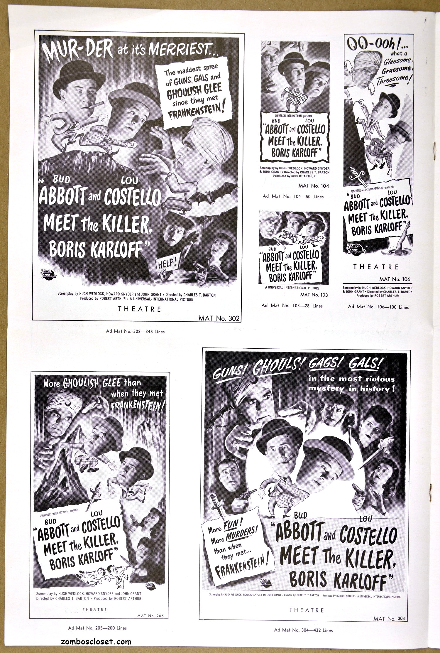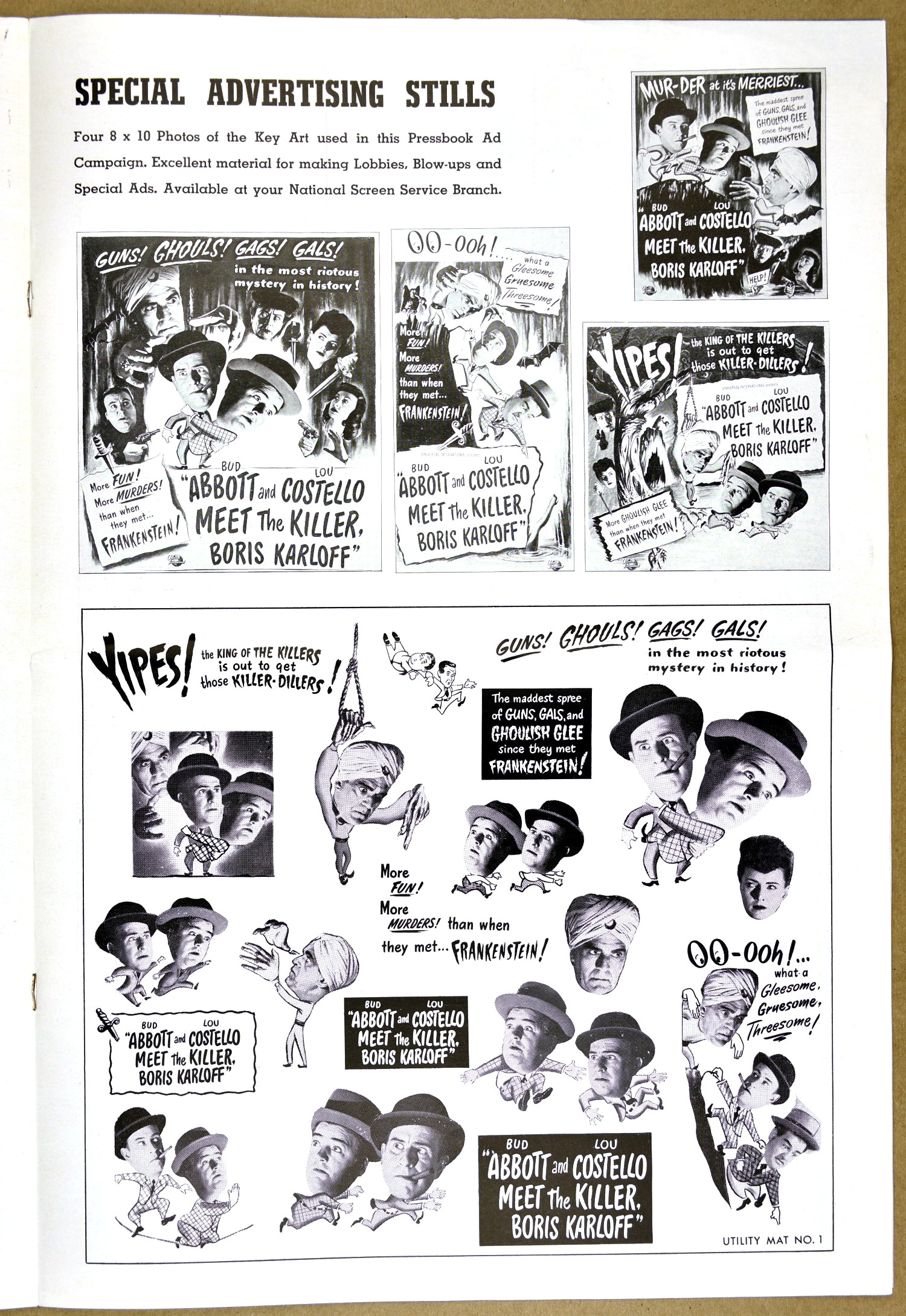 I was watching Abbott and Costello Meet the Invisible Man last night. I still chuckle at the silly gags. That made me start thinking I’d like to catch Abbott and Costello Meet the Killer, Boris Karloff, so I pulled out the pressbook to prepare. There is nothing more so 1940s than seeing Boris Karloff or Bela Lugosi wearing a turban and tux. The article titled Karloff Still Haunted by Monster Role is worth a gander.