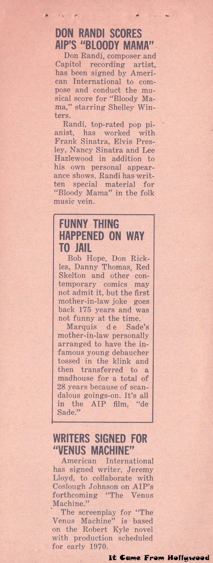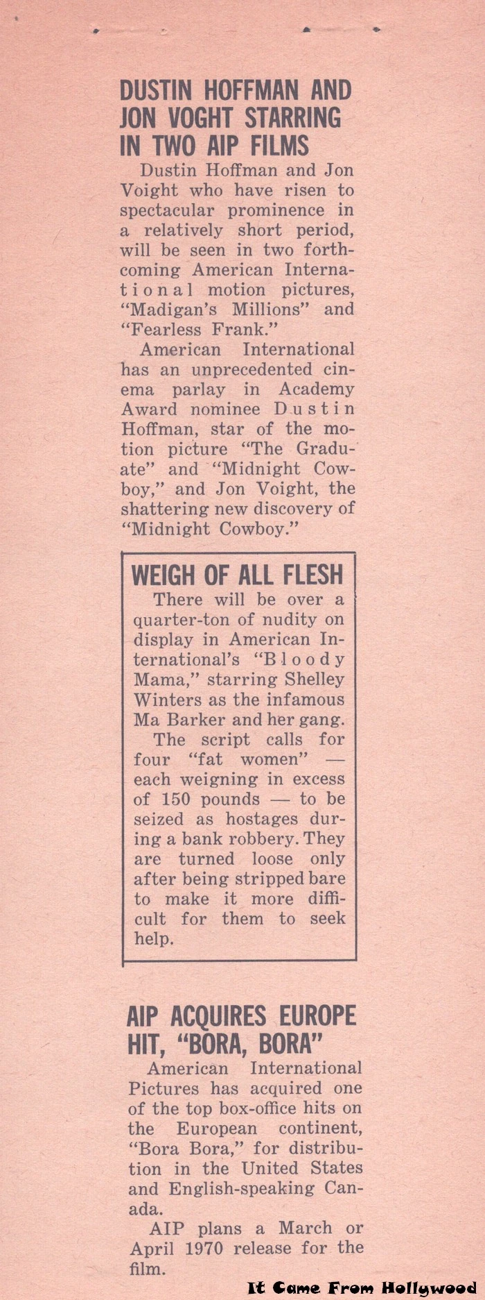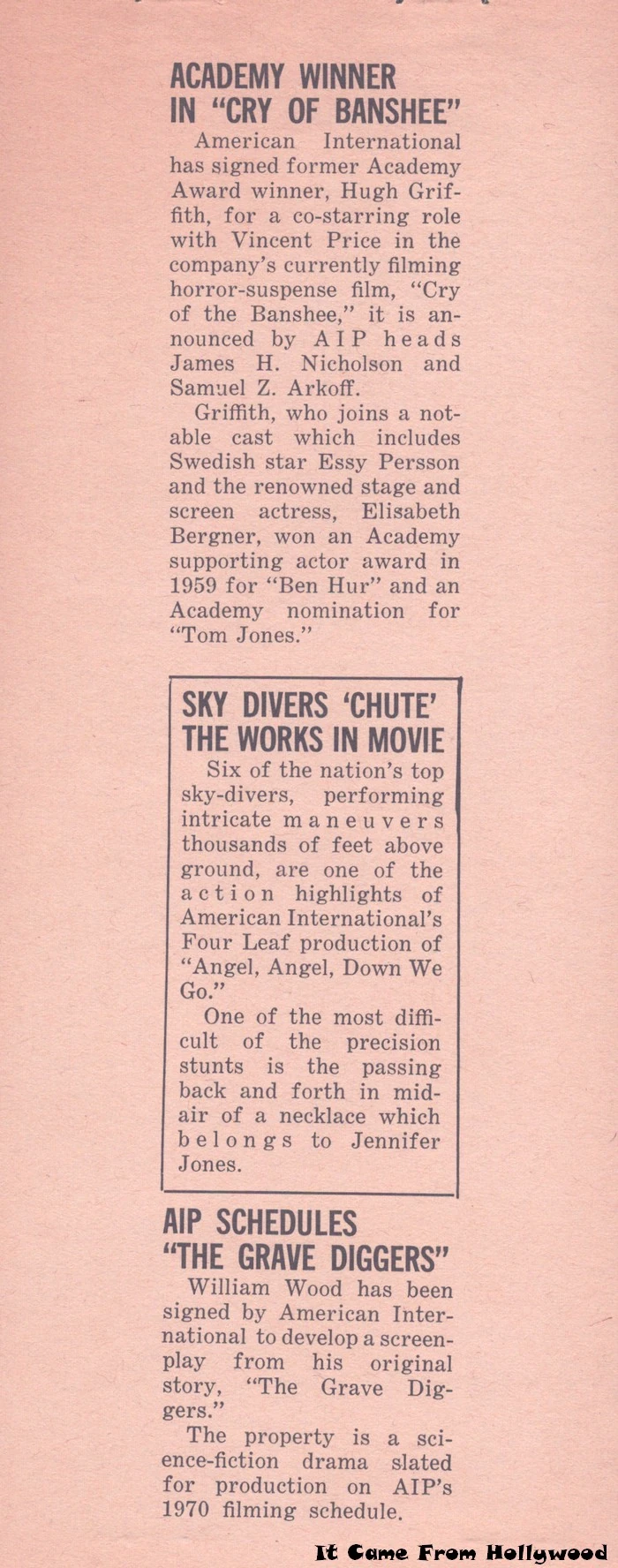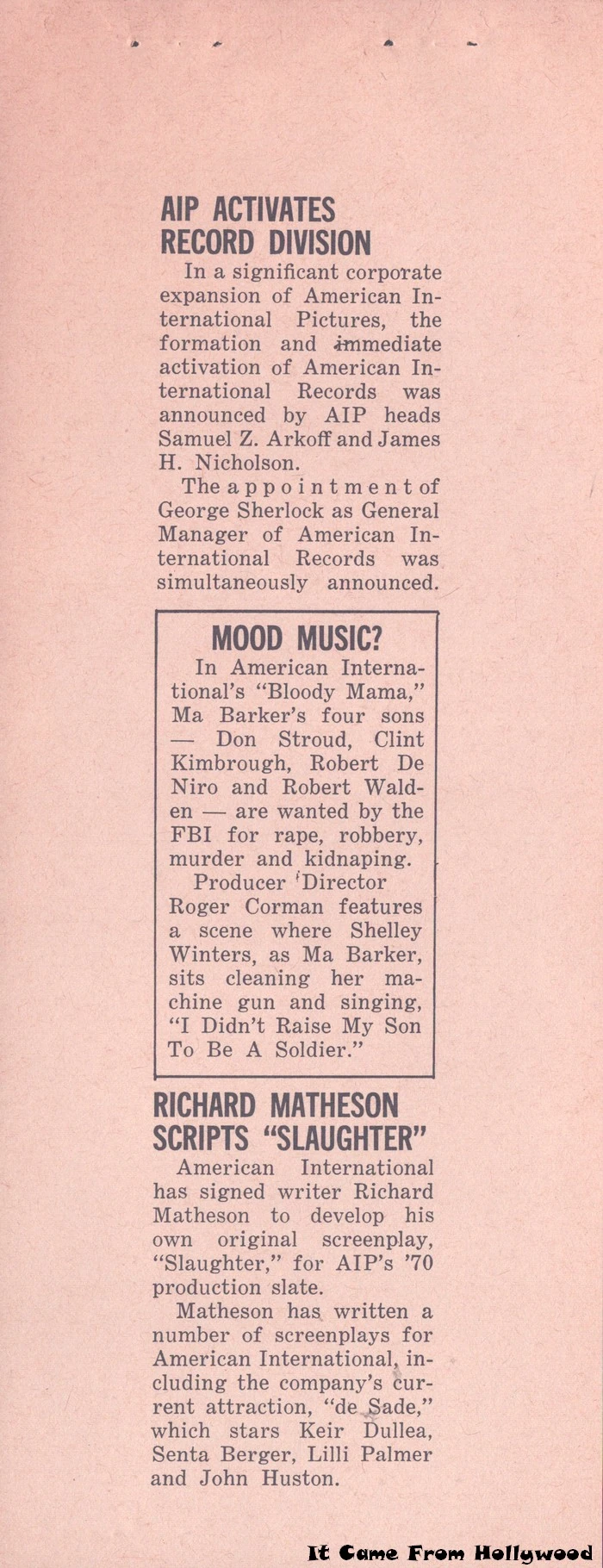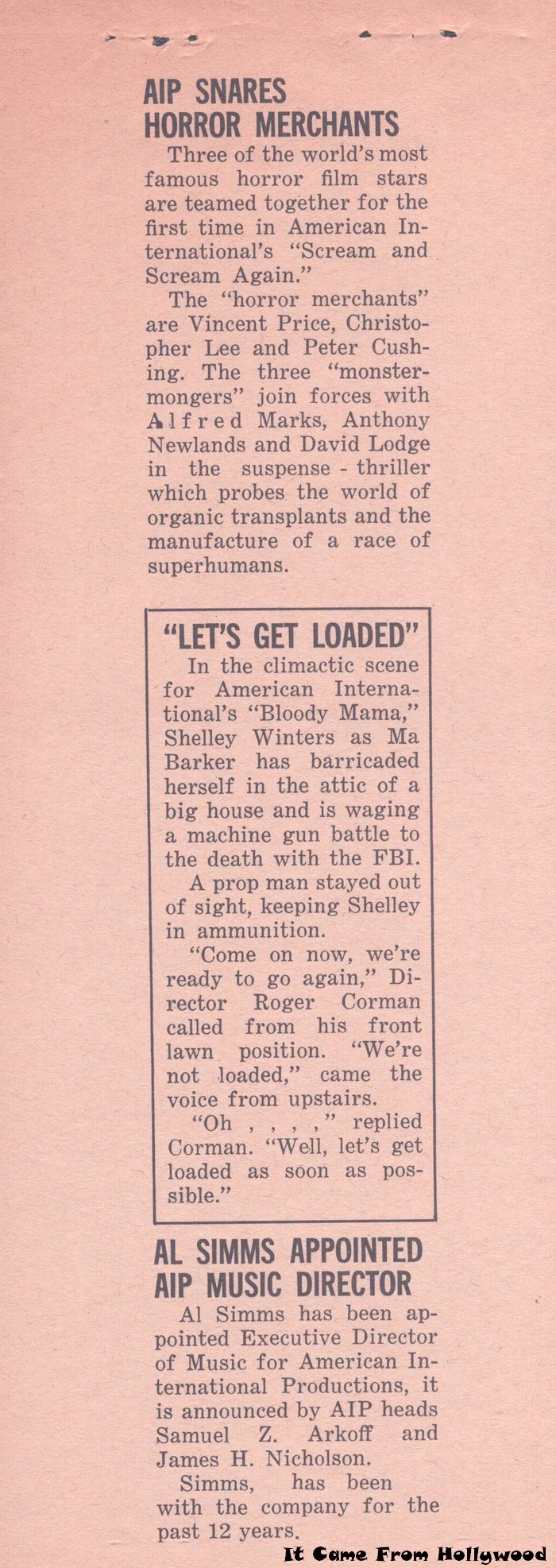 It Came From Hollywood sends more news clips from AIP. This time Horror Merchants, Cry of the Banshee, and Slaughter scripting as well as others soon to be in glorious newsprint.