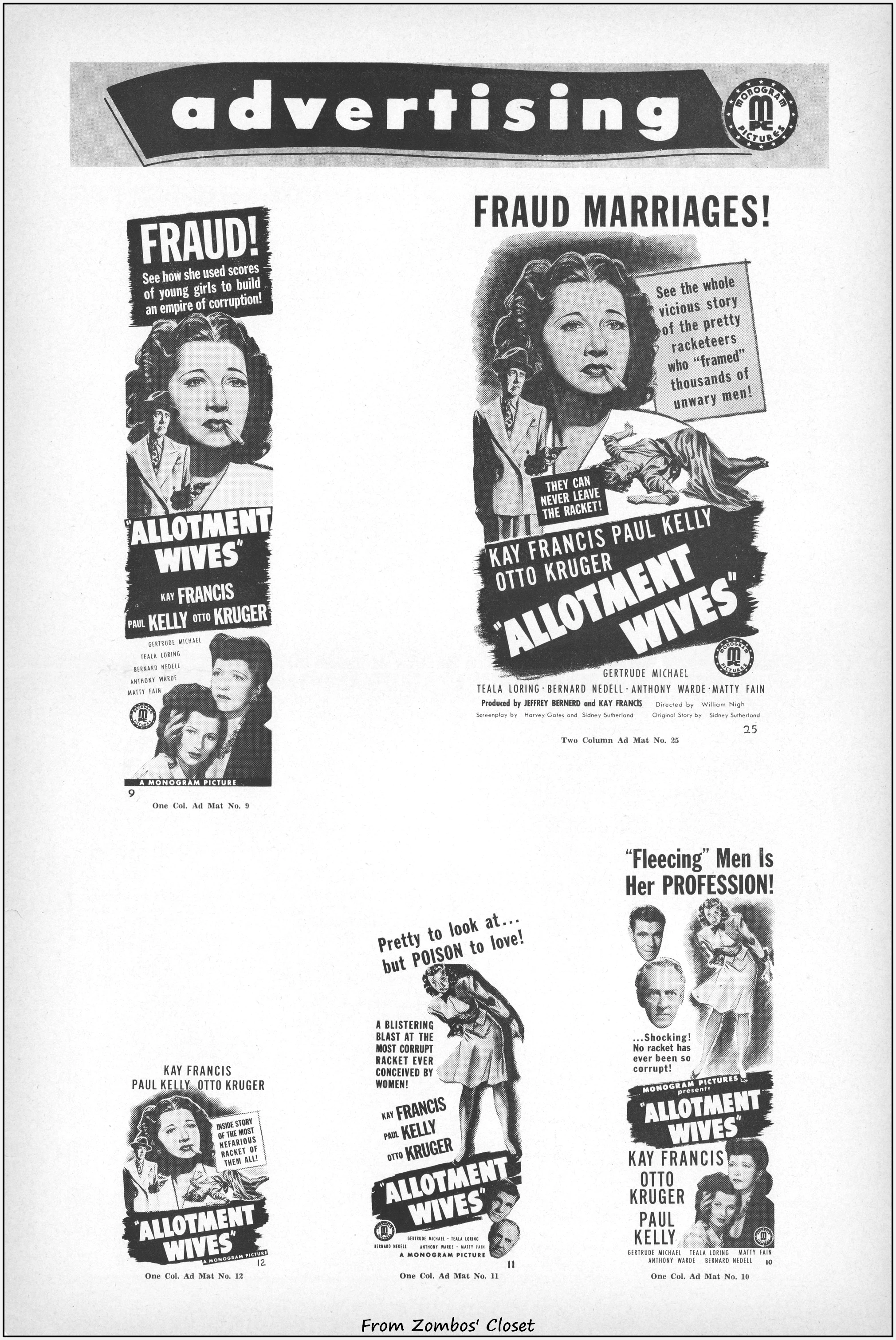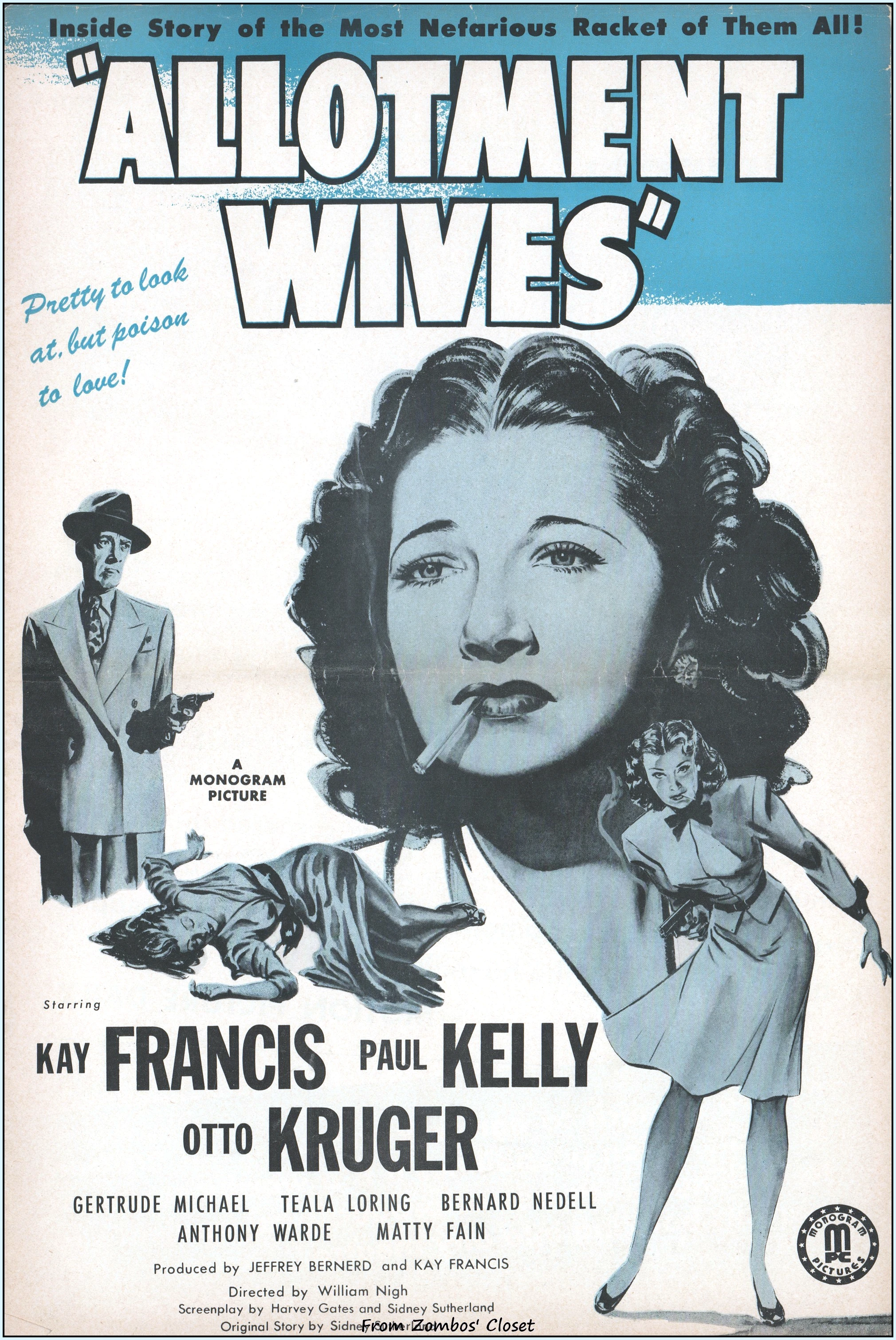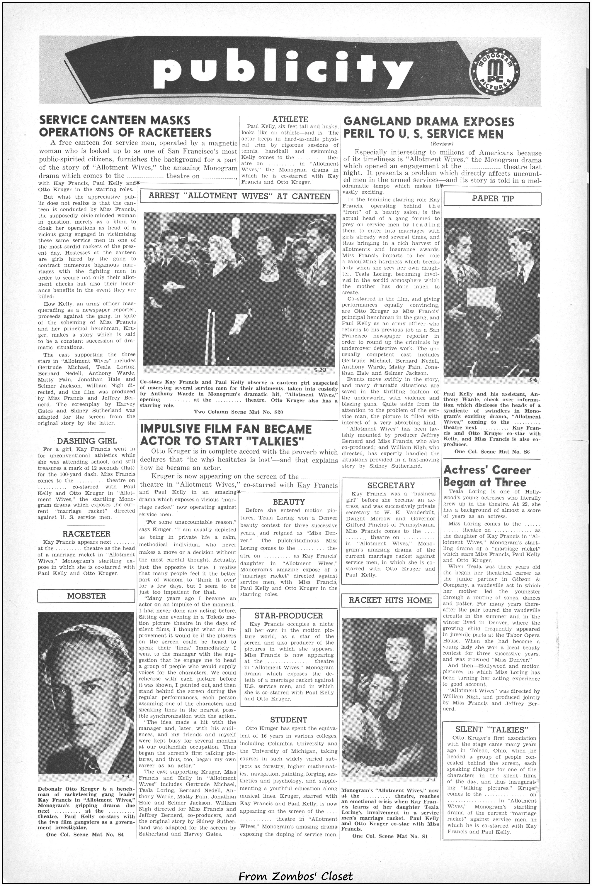 A Monogram studio B movie, Allotment Wives notably starred Kay Francis, Otto Kruger, and Paul Kelly. From the poverty row studio that brought us wonderful pop culture Bs like Charlie Chan, the Bowery Boys, Bela Lugosi’s weird but wonderful horrors, and more than a tumbling tumble-weeds’ worth of westerns, came this military insurance scam film noir. Kay Francis was the highest paid actress for Warner Brothers of the 1930s, after a successful run at Paramount. When she openly disagreed with the quality of the work she was getting from Warner Brothers, they relegated her to the backlot for speaking out. Picture deals became harder to find and she eventually signed with Monogram. The term ‘poverty row’ evolved from the smaller B movie studios that produced movies during the 1920s through 1950s, with a lot less money, lesser known actors (or known actors on a downward spiral), and production schedules that didn’t allow for retakes and elaborate staging. But many of those movies remain endearing to movie fans today, especially this one. This pressbook is a more prestigious example of a Monogram pressbook mostly due to Kay Francis’s presence.
