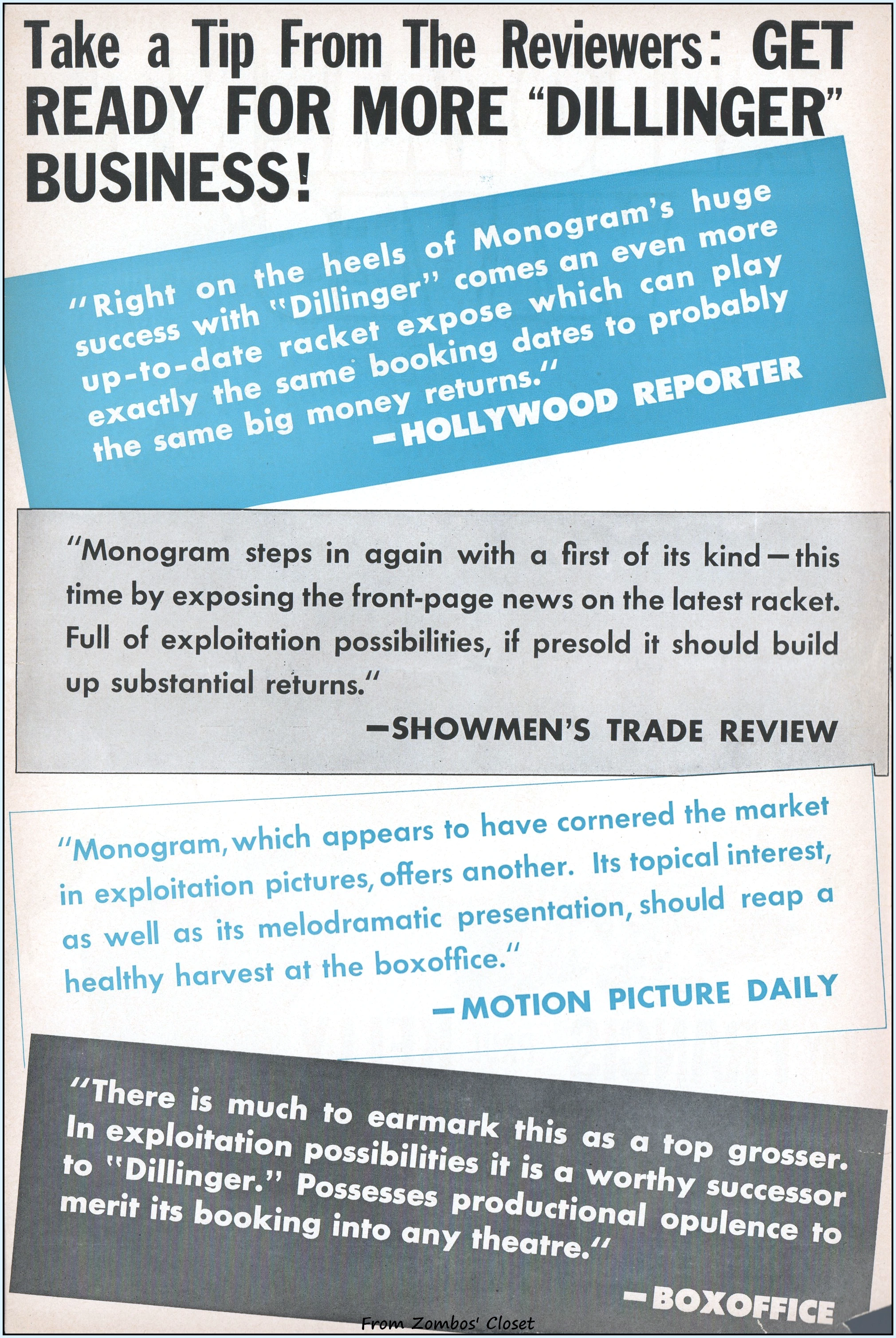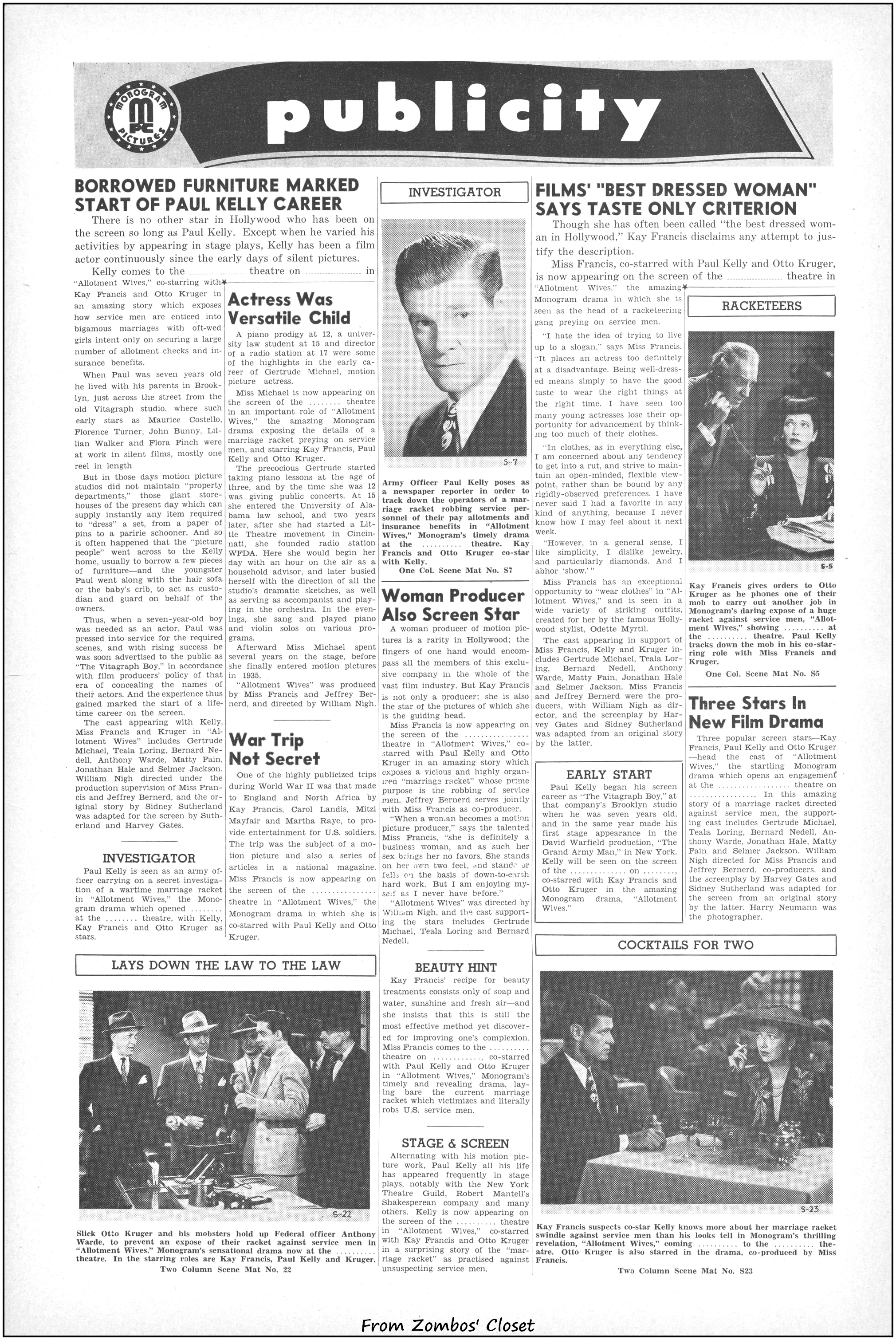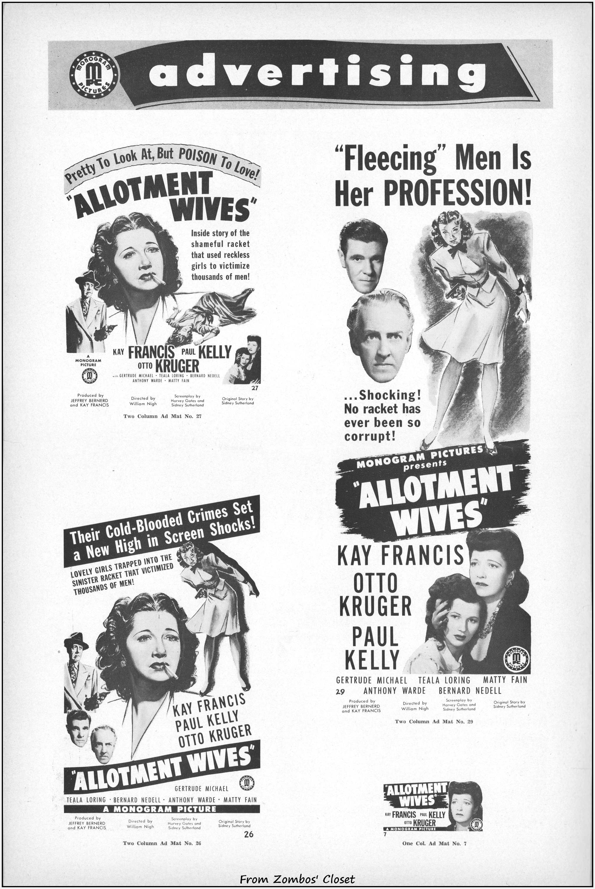 A Monogram studio B movie, Allotment Wives notably starred Kay Francis, Otto Kruger, and Paul Kelly. From the poverty row studio that brought us wonderful pop culture Bs like Charlie Chan, the Bowery Boys, Bela Lugosi’s weird but wonderful horrors, and more than a tumbling tumble-weeds’ worth of westerns, came this military insurance scam film noir. Kay Francis was the highest paid actress for Warner Brothers of the 1930s, after a successful run at Paramount. When she openly disagreed with the quality of the work she was getting from Warner Brothers, they relegated her to the backlot for speaking out. Picture deals became harder to find and she eventually signed with Monogram. The term ‘poverty row’ evolved from the smaller B movie studios that produced movies during the 1920s through 1950s, with a lot less money, lesser known actors (or known actors on a downward spiral), and production schedules that didn’t allow for retakes and elaborate staging. But many of those movies remain endearing to movie fans today, especially this one. This pressbook is a more prestigious example of a Monogram pressbook mostly due to Kay Francis’s presence.