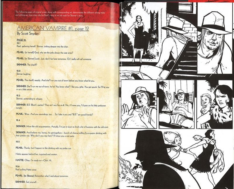 I was surprised to see how concise Scott Snyder and Stephen King's script pages are. Comprised mostly of dialog, they leave ample room for Alburquerque's interpretive embellishments with visual characterization to imbue emotional energy into each panel. Snyder's story begins in 1925 Los Angeles where Pearl and Hattie, two yearning-for-stardom actors in Hollywood, become intimately acquainted with the blood-thirsty–thirstier than usual, anyway–movie moguls running the studio. Stephen King's story begins in the 1800s to tell how Sweet's taste for sweet candy turns to the sour-sweet taste for warm blood.