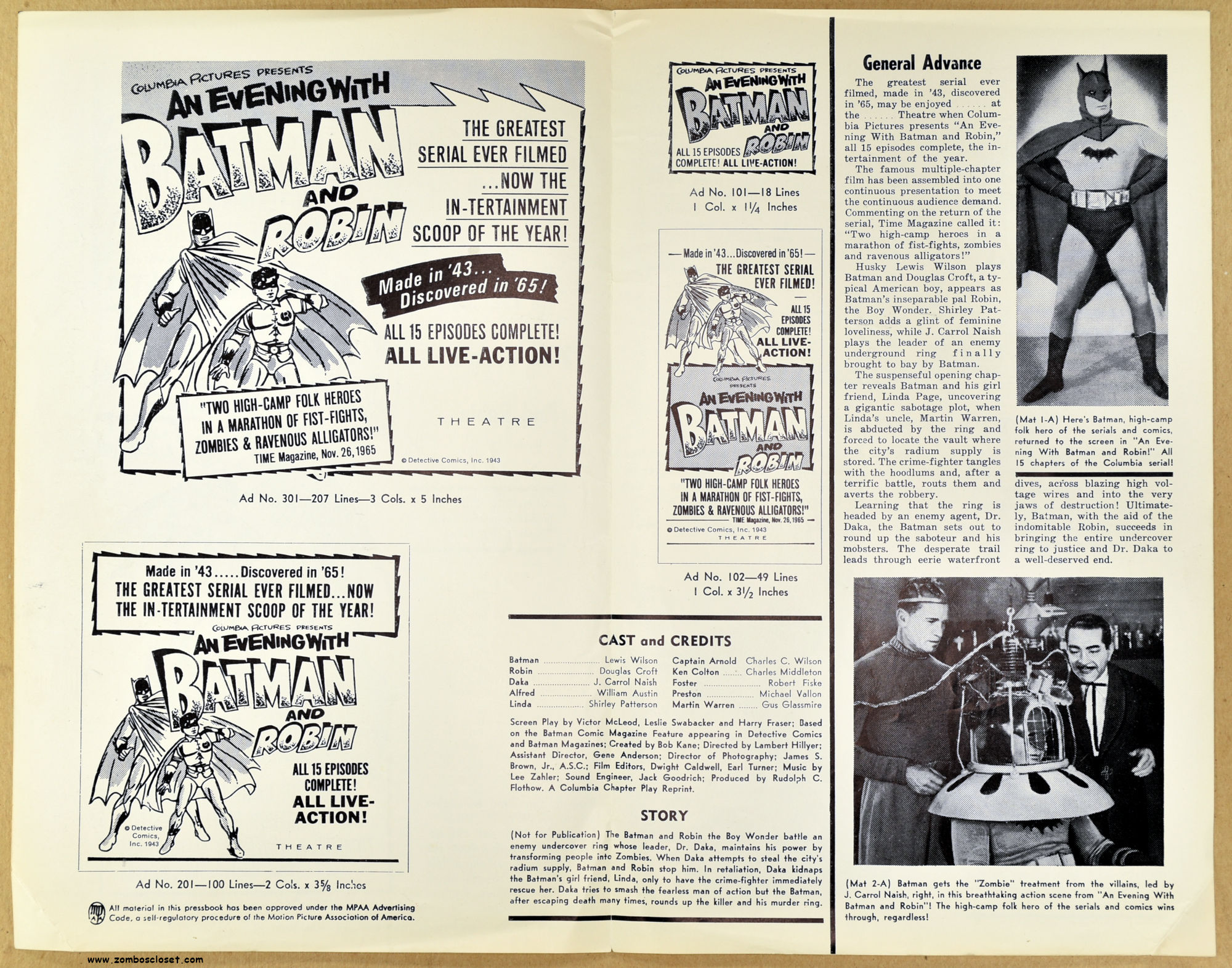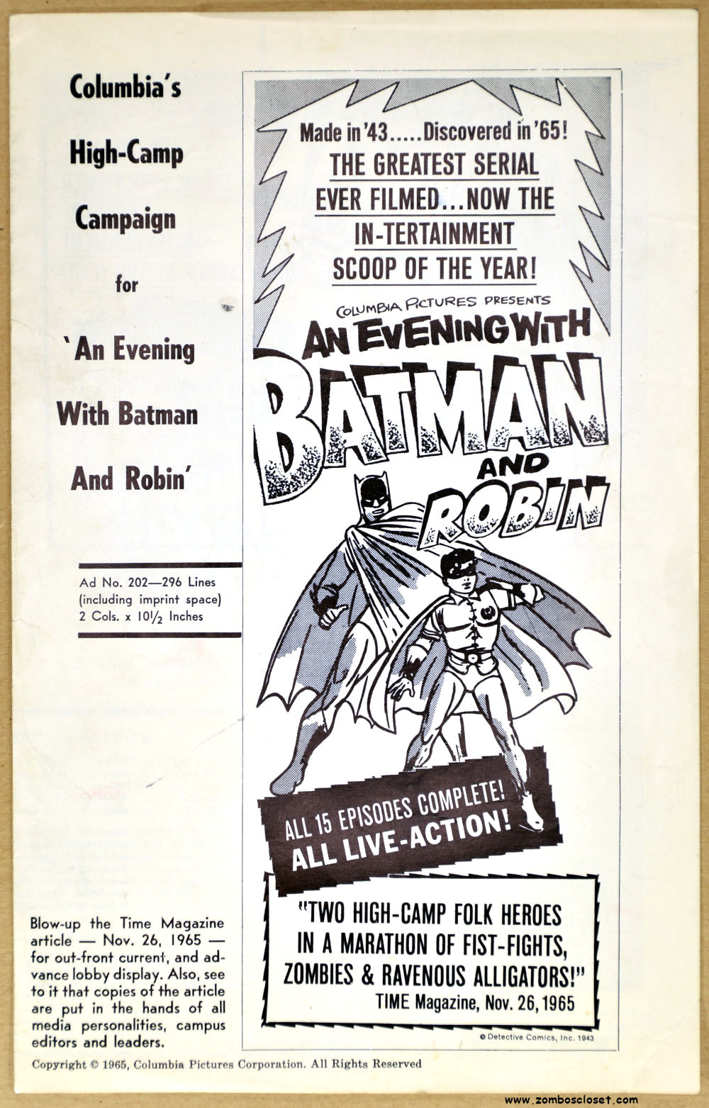 Here's an interesting promotional piece for Columbia's college crowd push for the 1943 Batman serial. Adam West's Batman appeared in 1966. This pressbook appears dated 1965, a year before the television show aired.