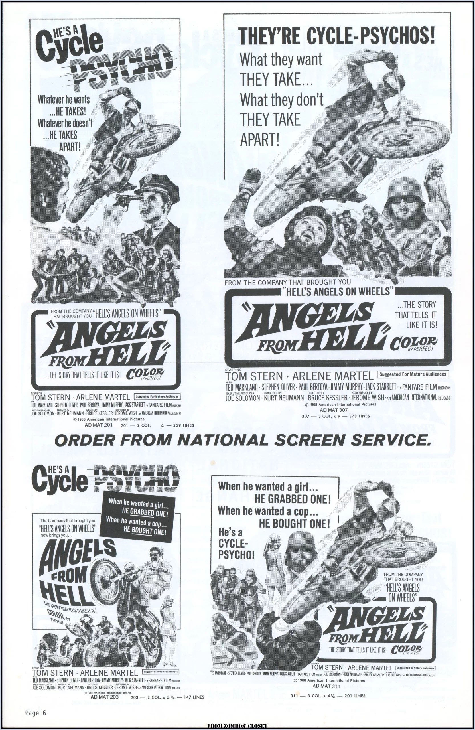 An AIP double-bill (that ran like the wind for drive-ins everywhere) with The Mini-Skirt Mob (an all-girl biker rumble). The New York Times critic gave a succinct “two reels of celluloid junk” to both movies, and sums up with “Mini-Skirt is sickening and Angels is merely dull.” Okay, so you can’t please everyone. But toss these two babies onto a drive-in screen and add some snack shack goodies and I’ll bet a good time would commence. Vroom! Vroom!
