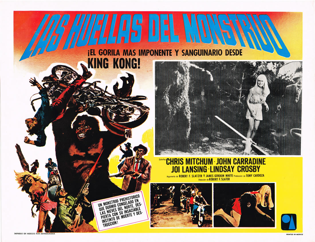 Why do apes and ape-like monsters always go for the girls? Just asking. It’s staggering how many gut-wrenchingly bad movies John Carradine acted in. He deserved better. This Mexican lobby card for Bigfoot (1970) at least promotes the King Kong tie-in (although there isn’t any), and highlights the proper way a monster should carry a girl: over the shoulder; the arms tire too quickly, no matter how big and hairy you are.
