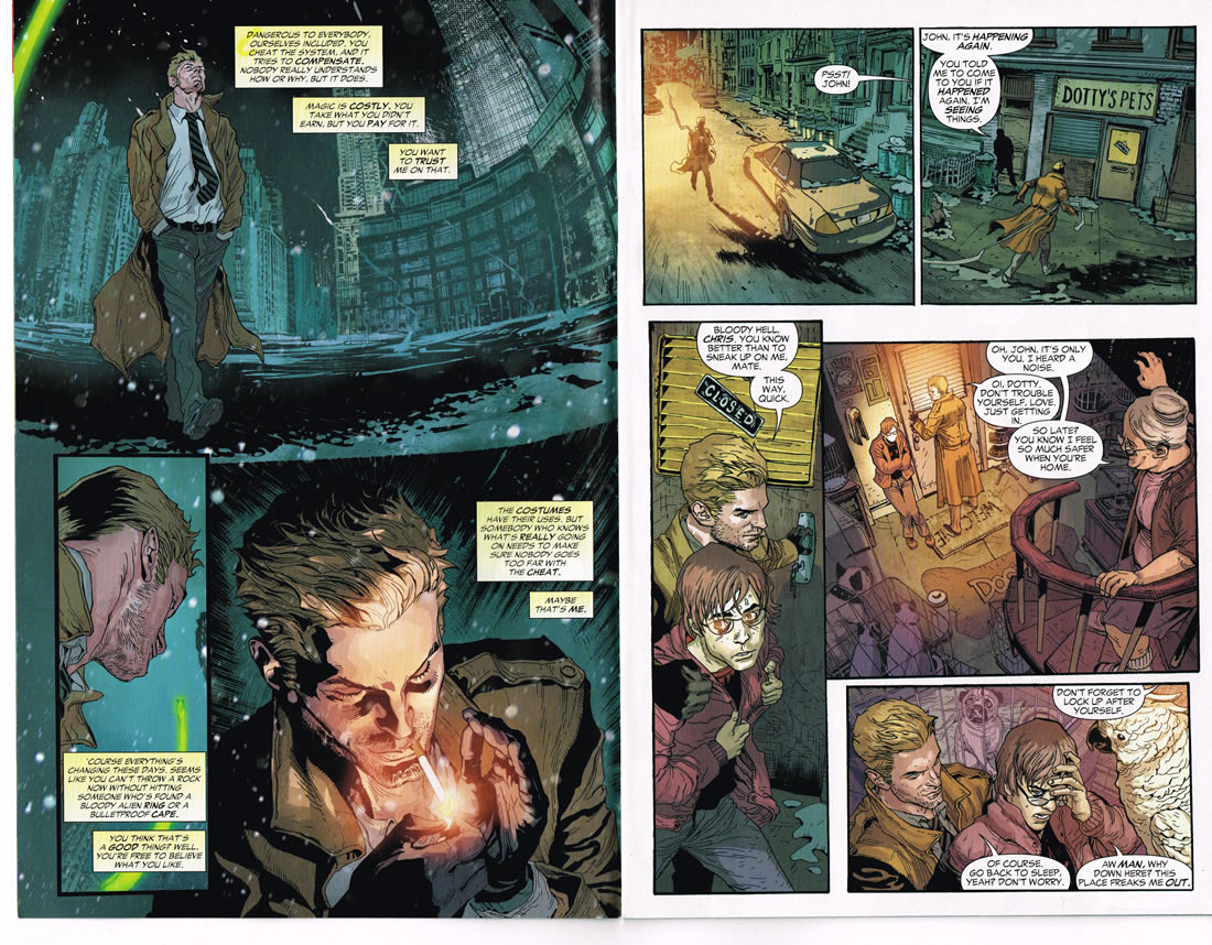 But Constantine is now in New York City, with spiffy new occult digs, down the stairs in Dotty's Pet store. His double-breasted trench coat looks less rumpled (more Prince than Columbo), his hair more fashionable, and his demeanor less like a cigarette aftertaste and more like a Jack Daniel's sipped over ice with a Heineken chaser.