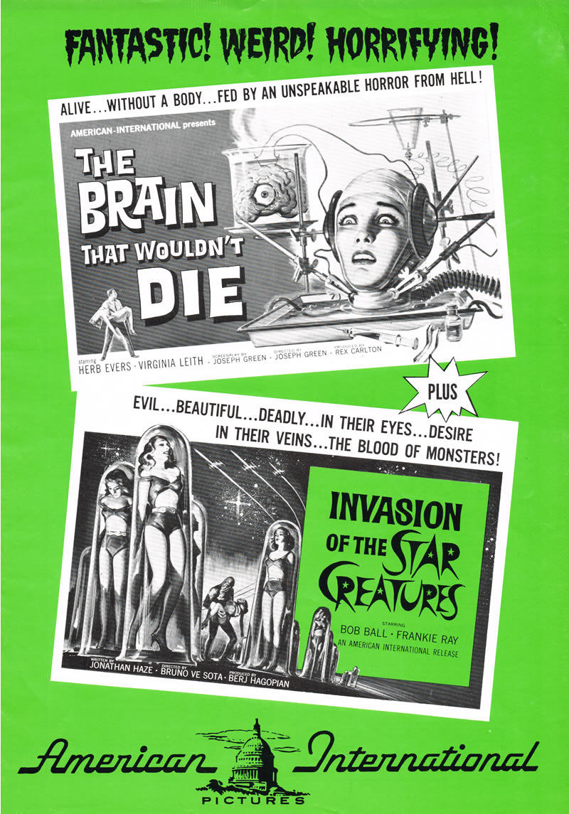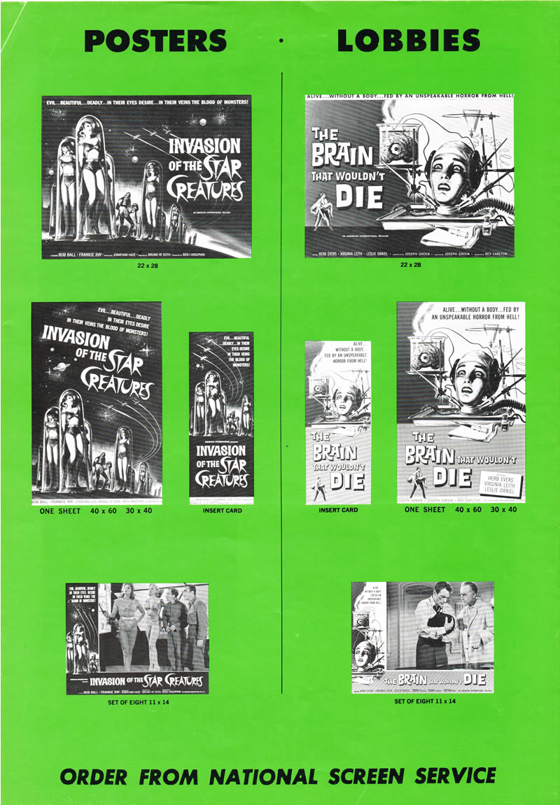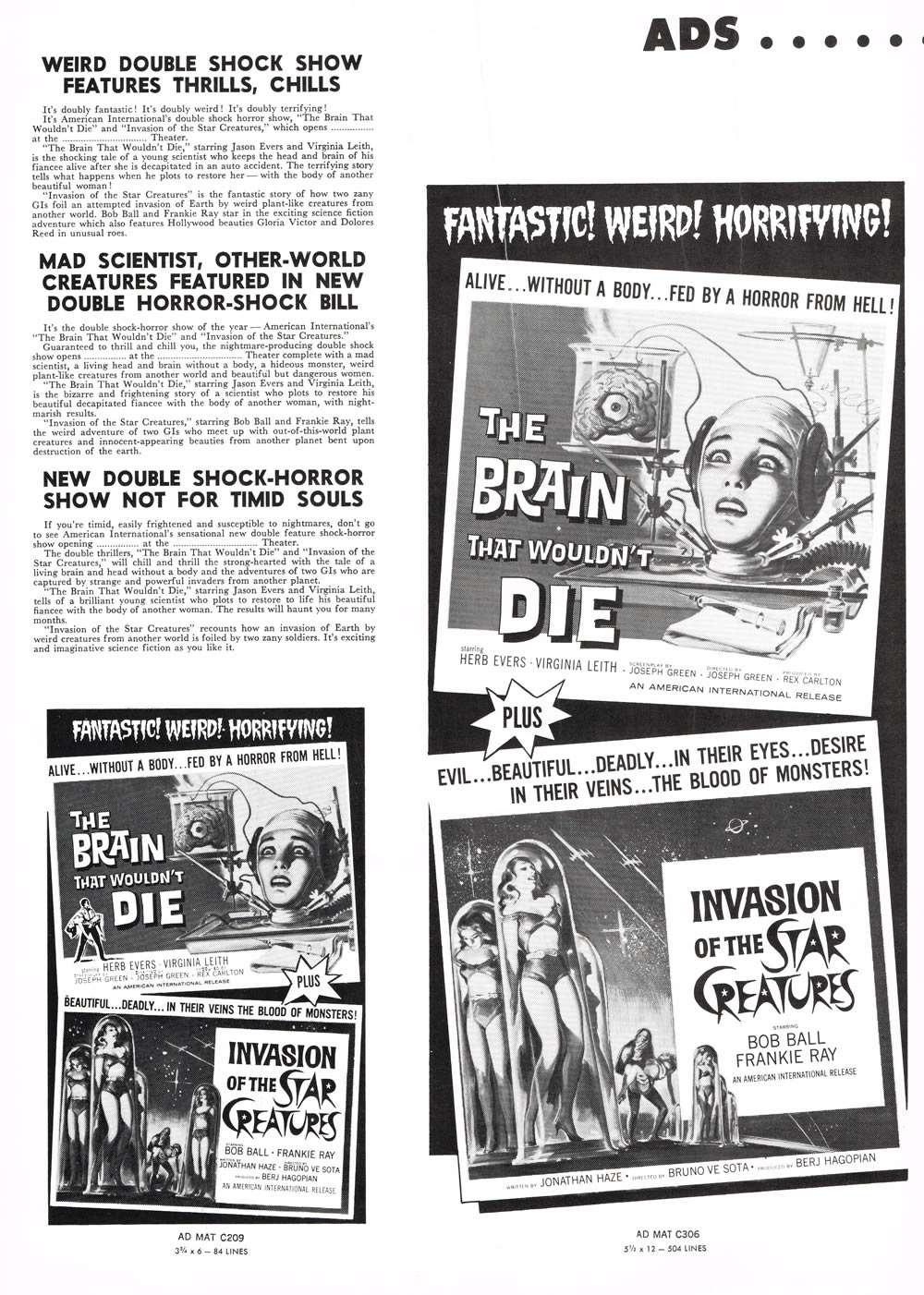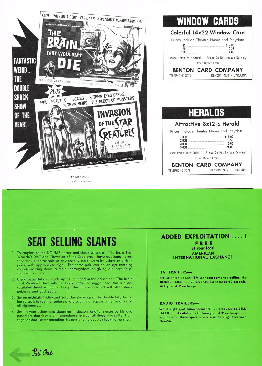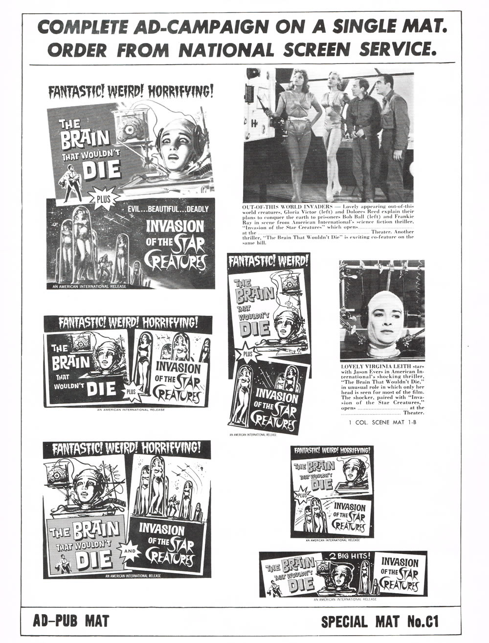 I left out a few pages of poster admats. These American International pressbooks usually run around 11" x 14," and have pull-out pages to highlight the various sized posters for each movie. The Brain That Wouldn't Die was another B-movie staple seen on television during the 1960s and 1970s horror hosted and hostless shows.