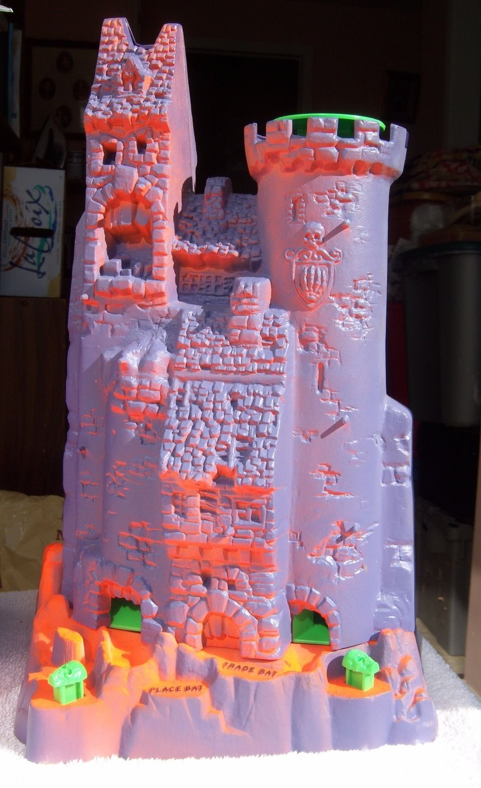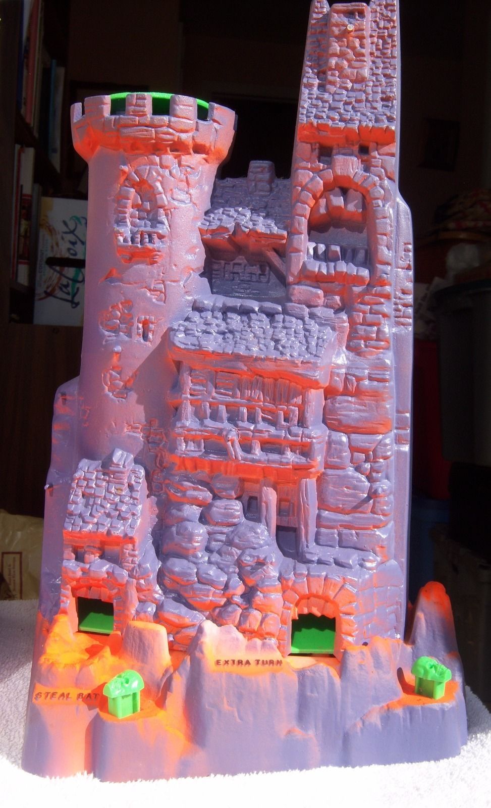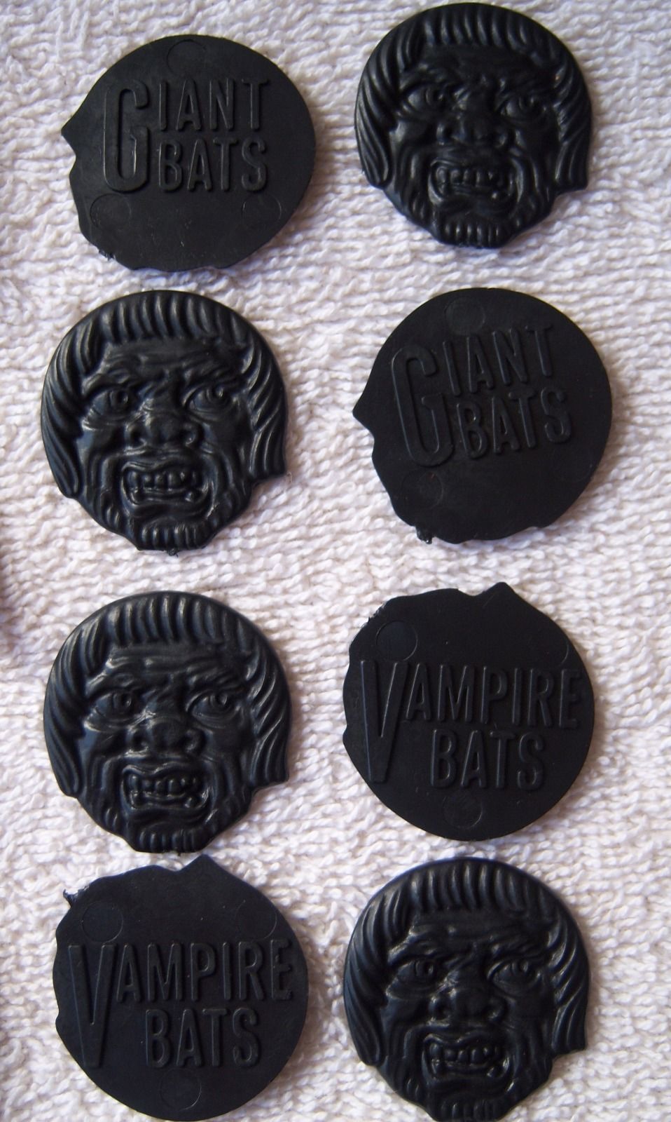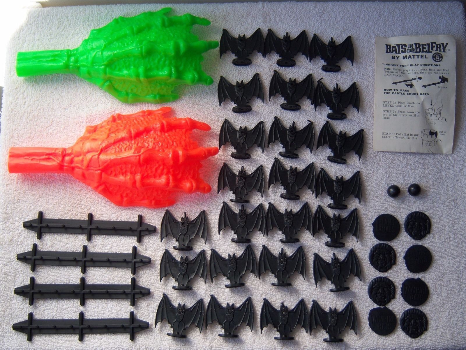 Main portion of game consists of 15" tall molded plastic castle w/spring-loaded launchpad that would toss any of the 24 included plastic "Vampire Bats" into the sky. Object of the game was to drop one of the two included heavy metal balls into castle to activate spring-loaded mechanism and catch as many bats as possible w/the two provided plastic skeleton hand scoops. Castle has exterior pegs to hold bats and comes w/eight "Diet Tokens," plastic discs w/monster face on one side and either "Vampire Bats" or "Giant Bats" text on reverse. Game is for up to four players and comes w/four pegged racks to place your bats on.