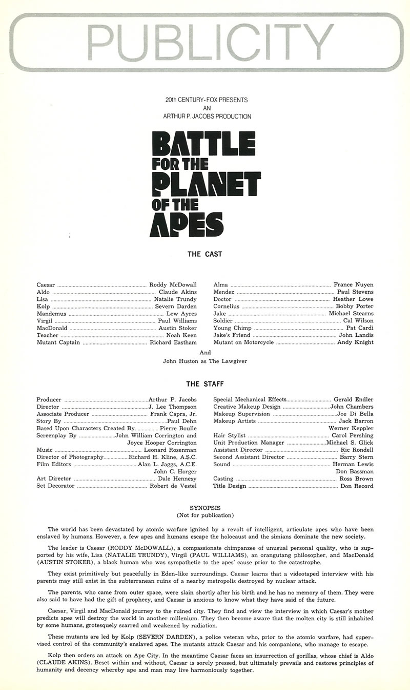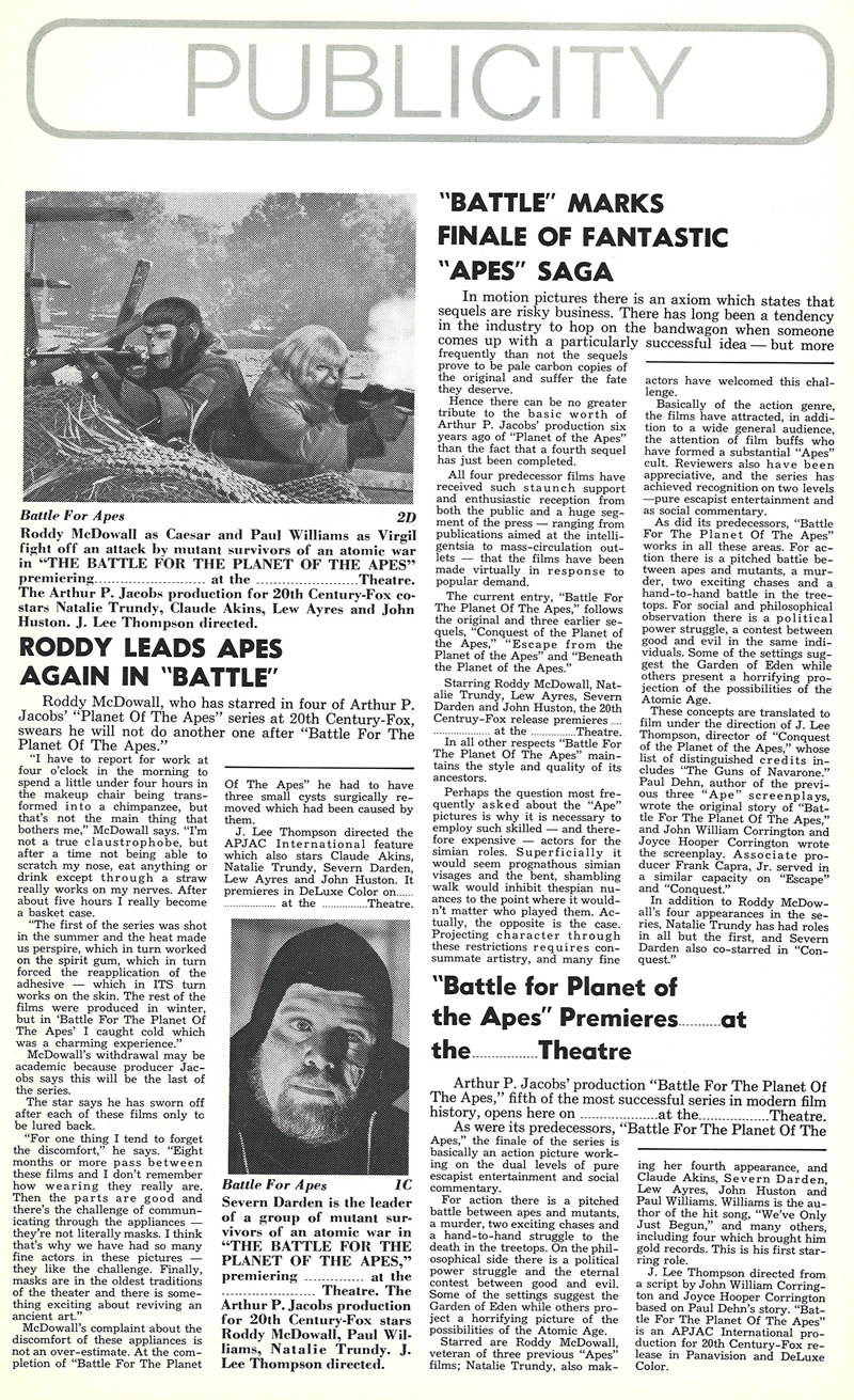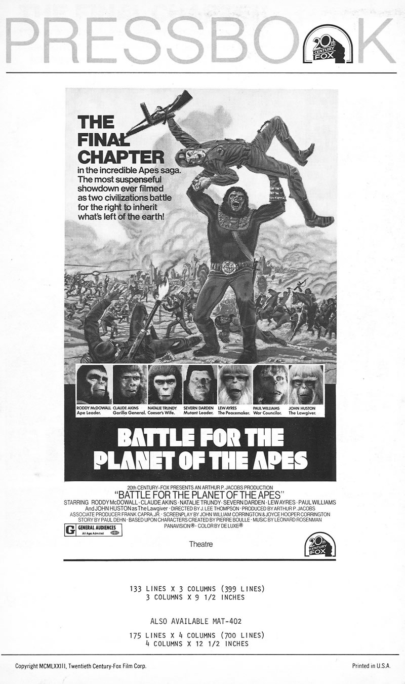 Battle For The Planet Of The Apes (1973) Pressbook Leave a Comment / Pressbooks (Horror, Sci Fi, Fantasy) / By JM Cozzoli The final chapter? Who are they kidding? Like this:Like Loading... Share this post Facebook Twitter Pinterest Linkedin