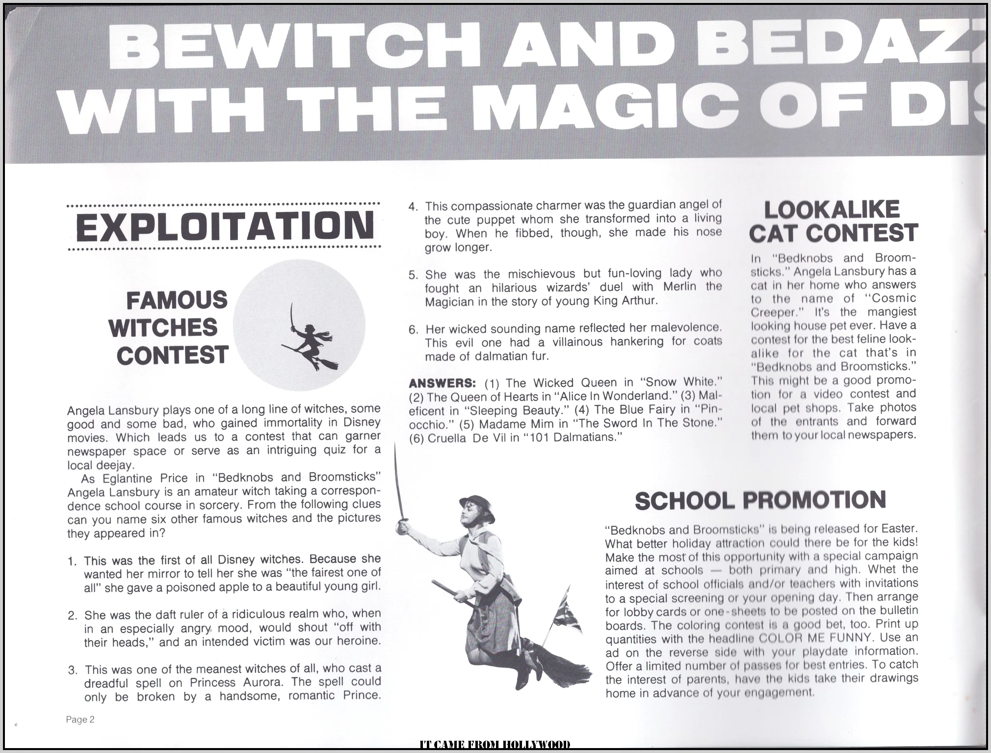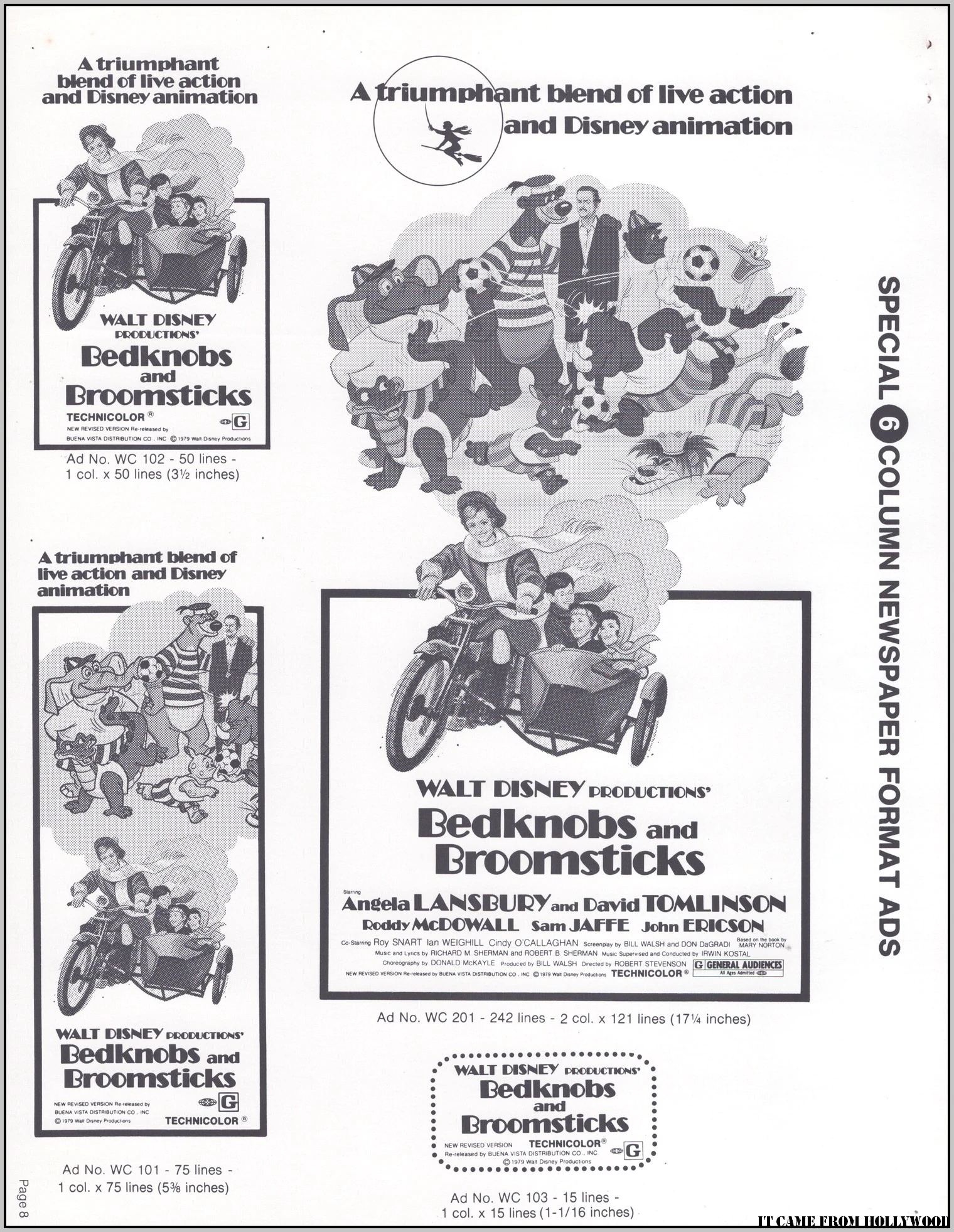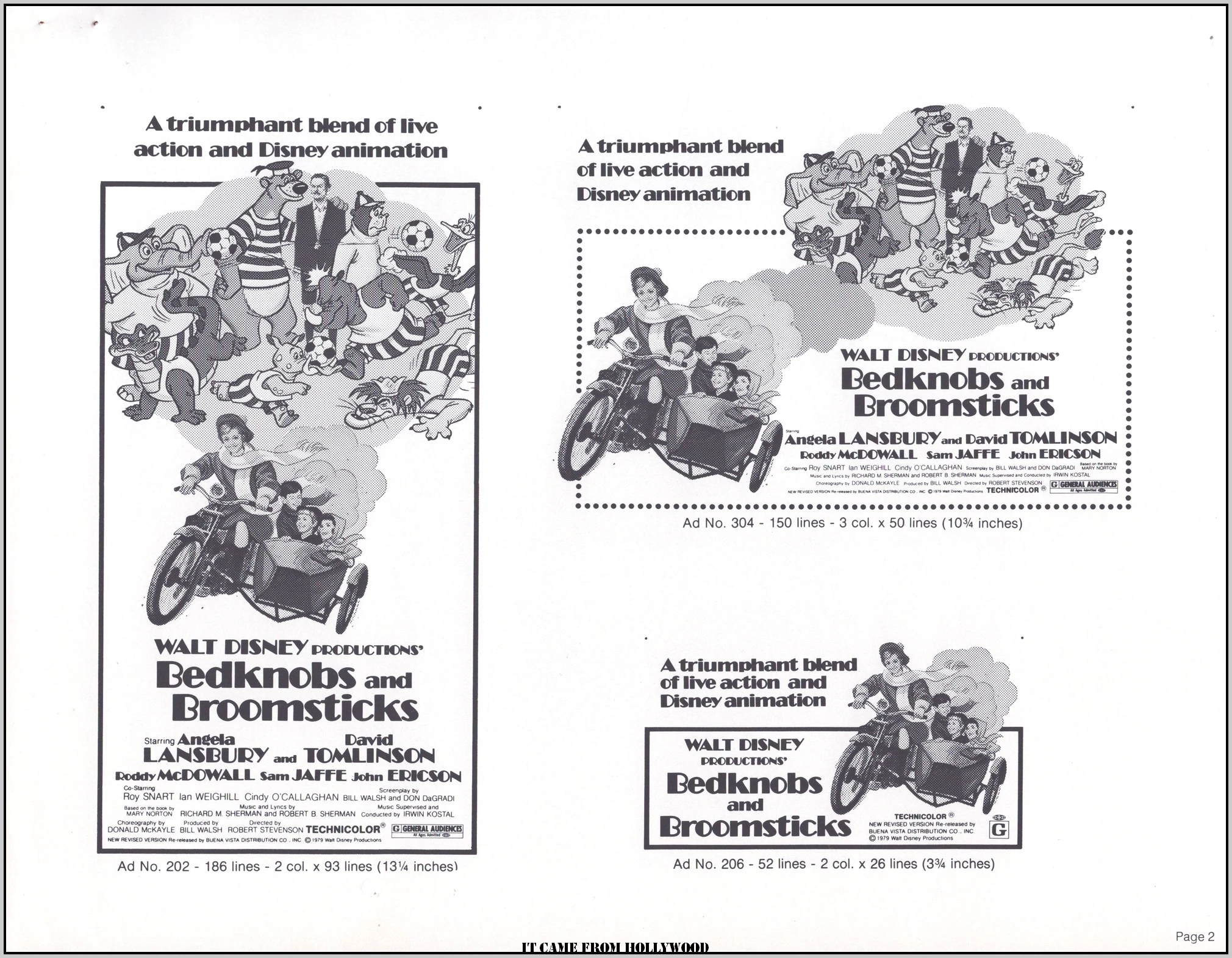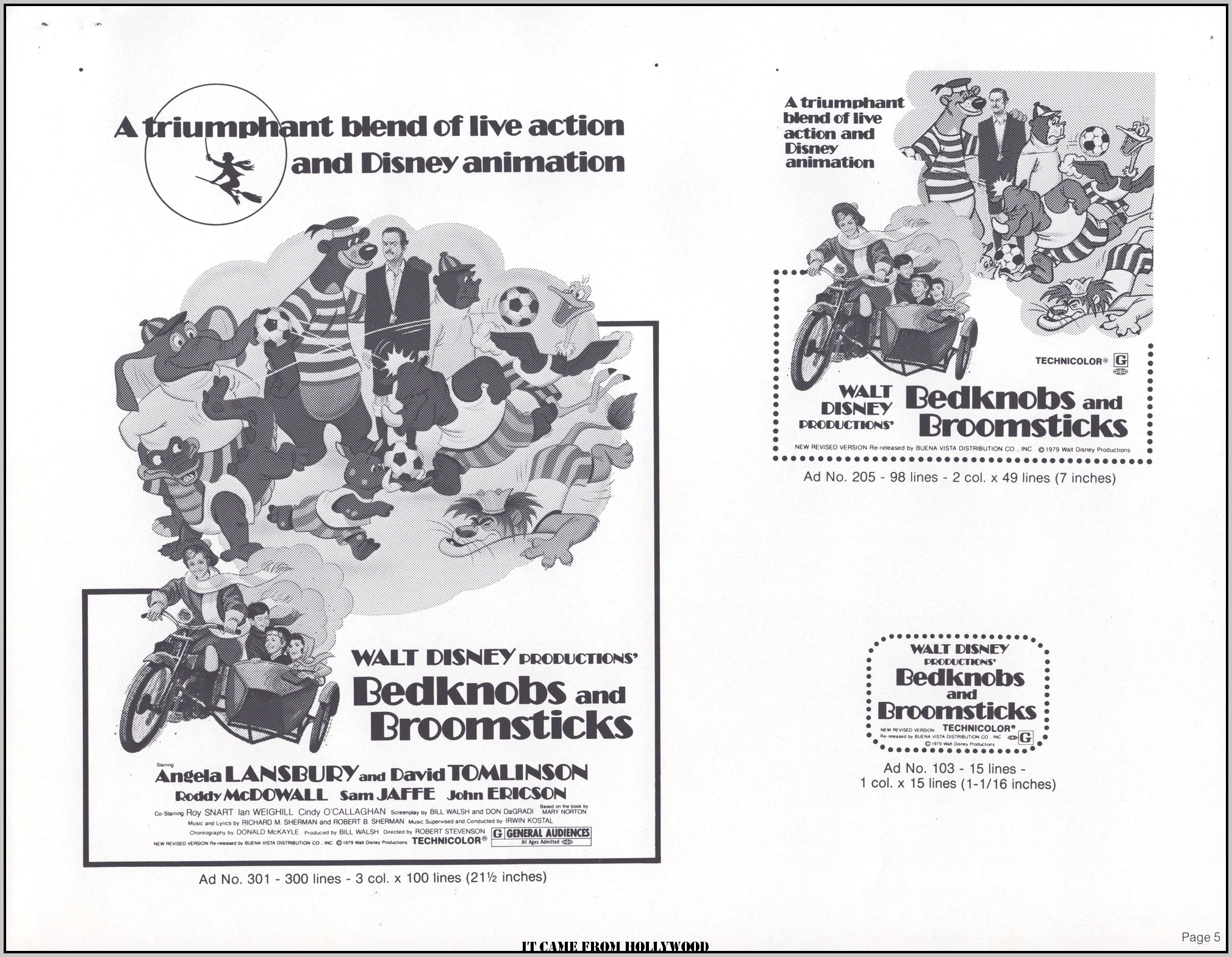 Courtesy of It Came From Hollywood…the re-release 1979 pressbook for Bedknobs and Broomsticks. The Sherman Brothers, who wrote the songs for Mary Poppins, Chitty Chitty Bang Bang, The Jungle Book, and many others, wrote the songs for this movie. They also wrote It’s a Small World After All, so nobody’s perfect. My favorite work of theirs would be Mary Poppins, which reaches sublime heights of melody and heartstrings’ tugging. The rights to Bedknobs and Broomsticks were acquired before those of Mary Poppins, but it was shelved a few years to make way for Mary Poppins, since the stories were somewhat similar. Julie Andrews was the preferred witch for Bedknobs, but feared typecasting and demurred. Angela Lansbury eventually took the role. The movie won the 1972 academy award for Best Visual Effects over its competition, When Dinosaurs Ruled the Earth. (Click each image to expand it–you will need a BIG screen–or right-click the expanded image to download it. And you don’t need witchcraft to find more pressbooks, just rummage through our categories.)