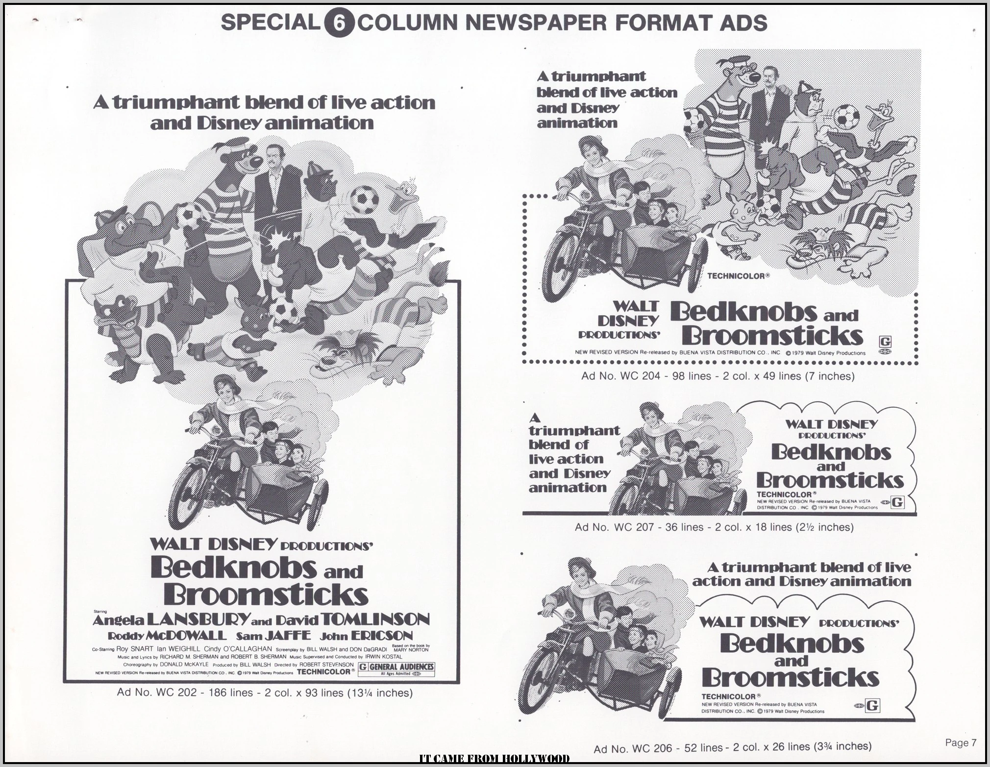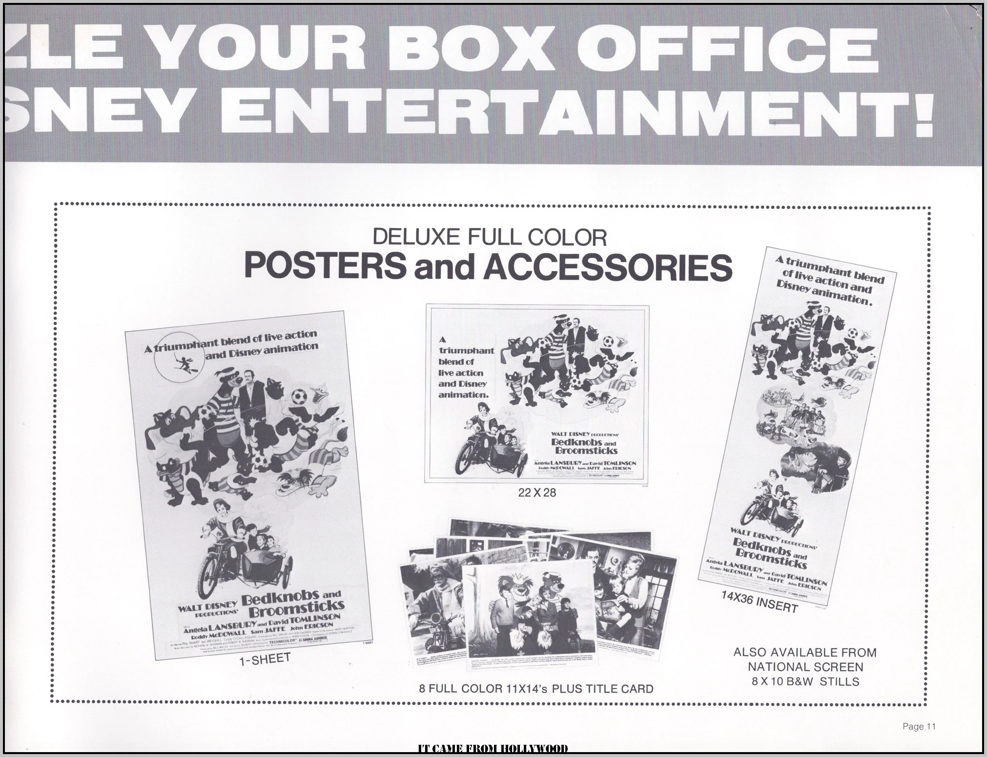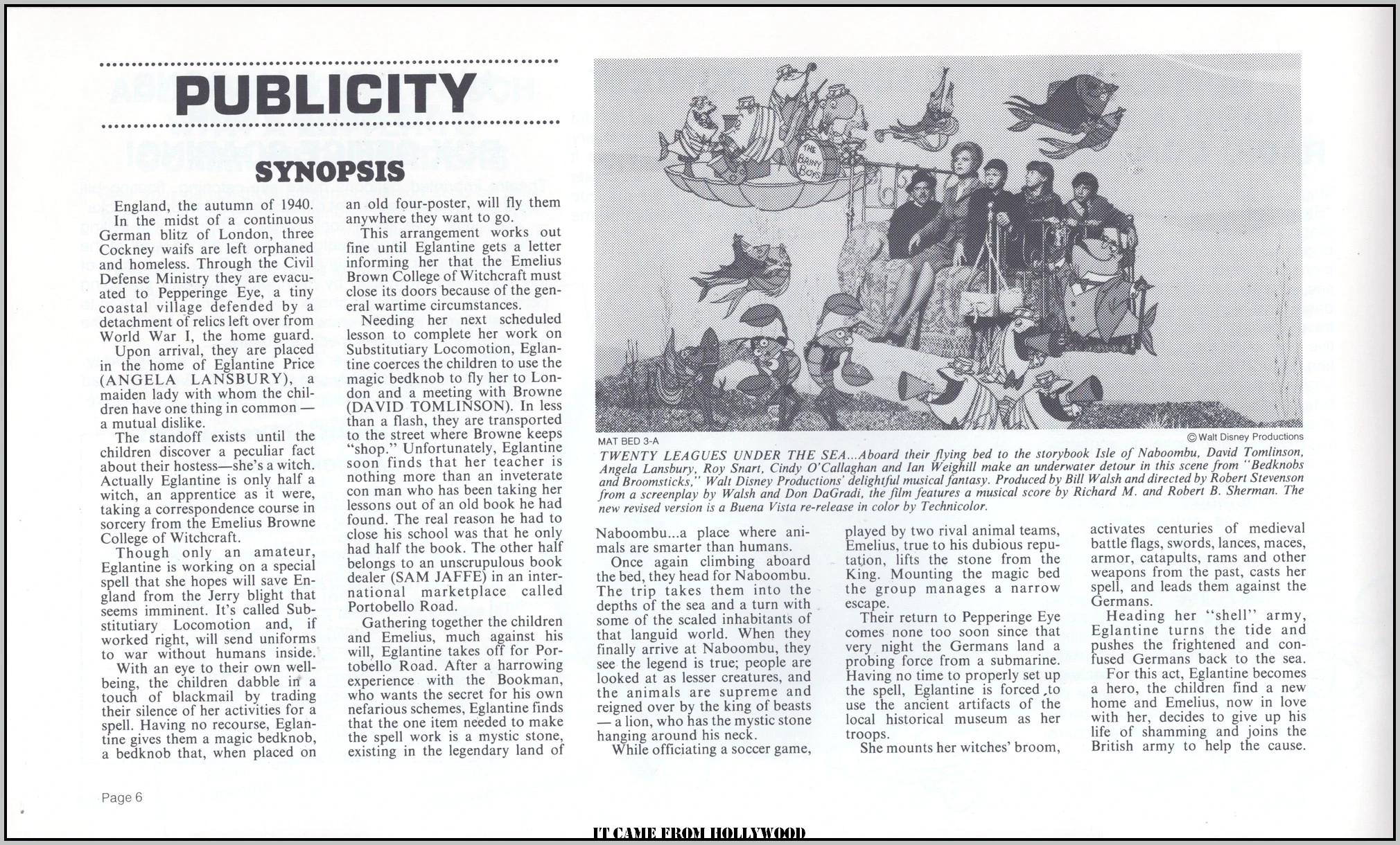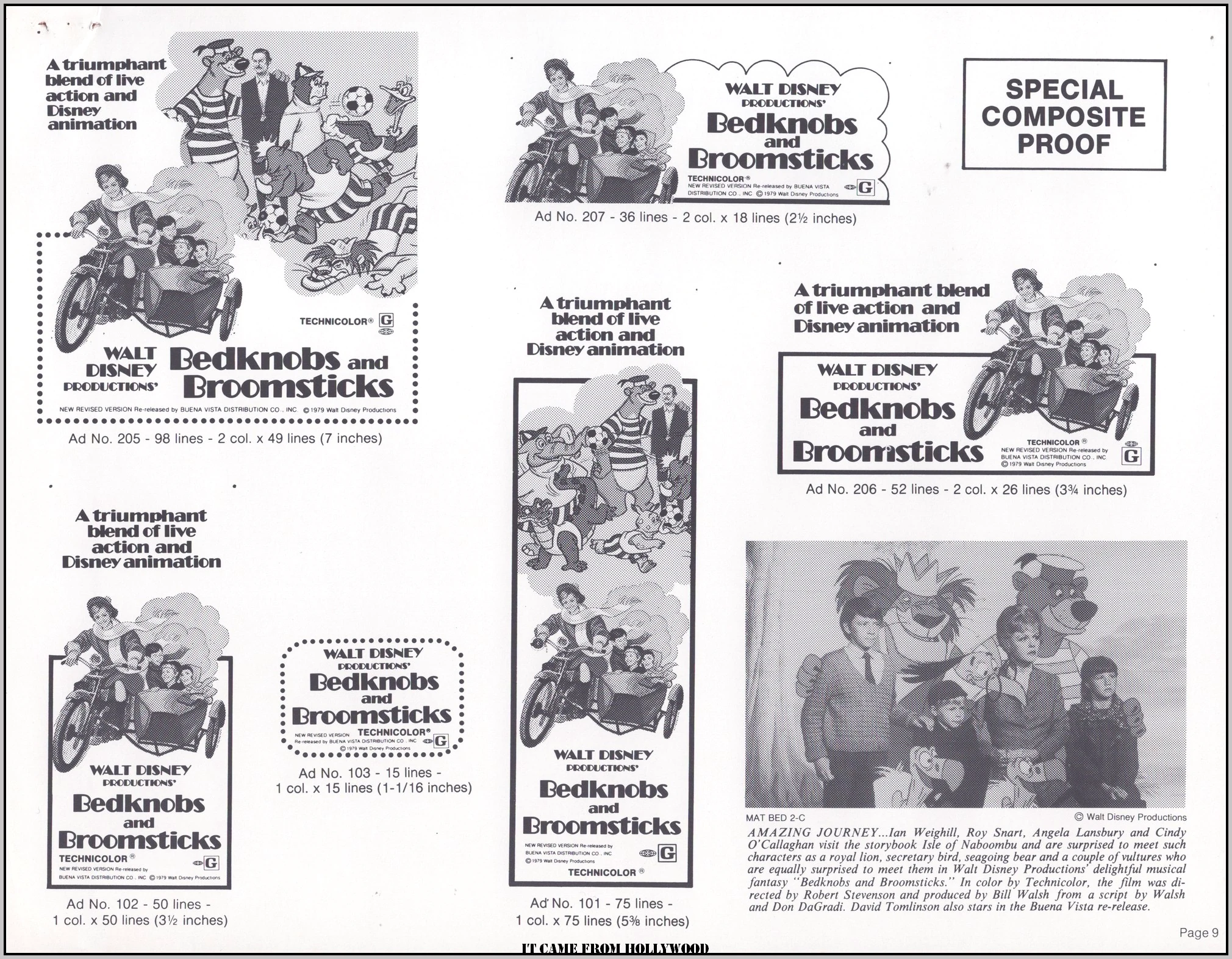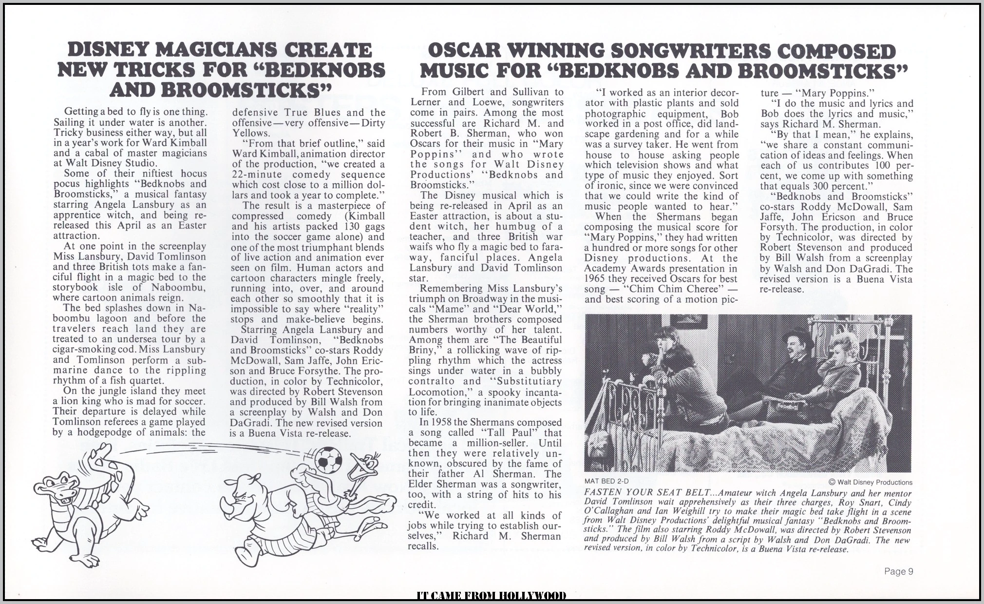 Courtesy of It Came From Hollywood…the re-release 1979 pressbook for Bedknobs and Broomsticks. The Sherman Brothers, who wrote the songs for Mary Poppins, Chitty Chitty Bang Bang, The Jungle Book, and many others, wrote the songs for this movie. They also wrote It’s a Small World After All, so nobody’s perfect. My favorite work of theirs would be Mary Poppins, which reaches sublime heights of melody and heartstrings’ tugging. The rights to Bedknobs and Broomsticks were acquired before those of Mary Poppins, but it was shelved a few years to make way for Mary Poppins, since the stories were somewhat similar. Julie Andrews was the preferred witch for Bedknobs, but feared typecasting and demurred. Angela Lansbury eventually took the role. The movie won the 1972 academy award for Best Visual Effects over its competition, When Dinosaurs Ruled the Earth. (Click each image to expand it–you will need a BIG screen–or right-click the expanded image to download it. And you don’t need witchcraft to find more pressbooks, just rummage through our categories.)