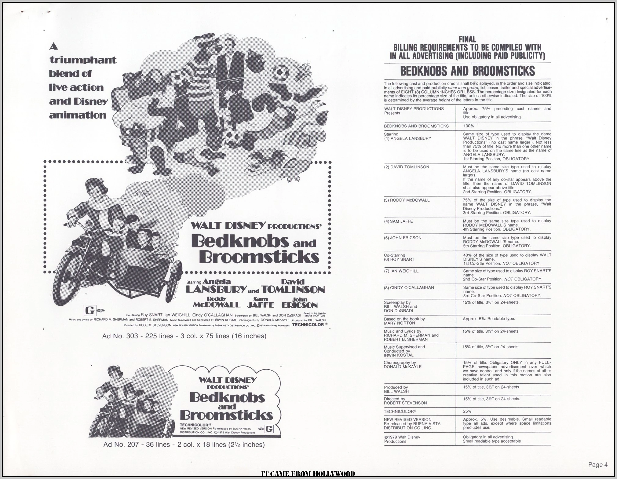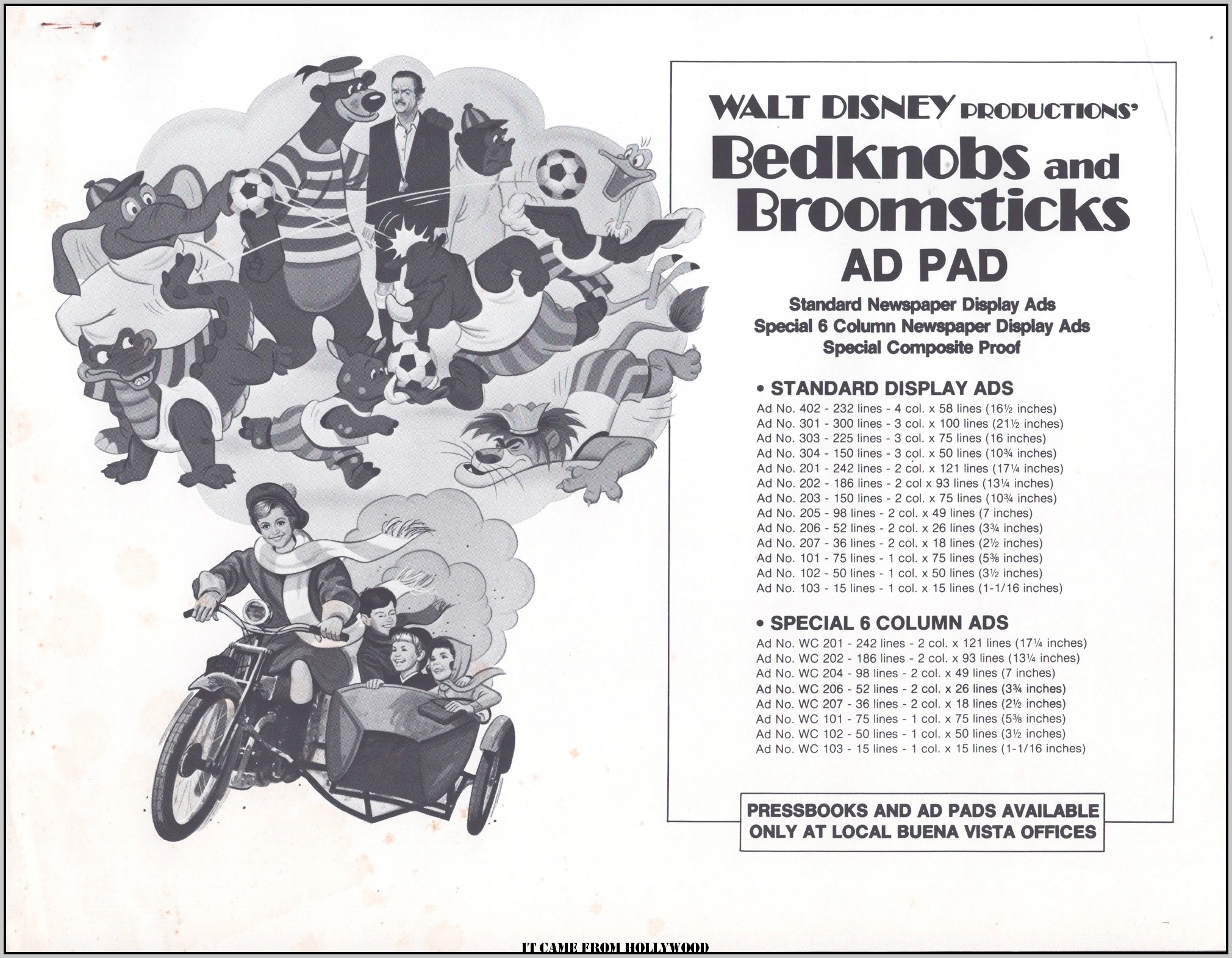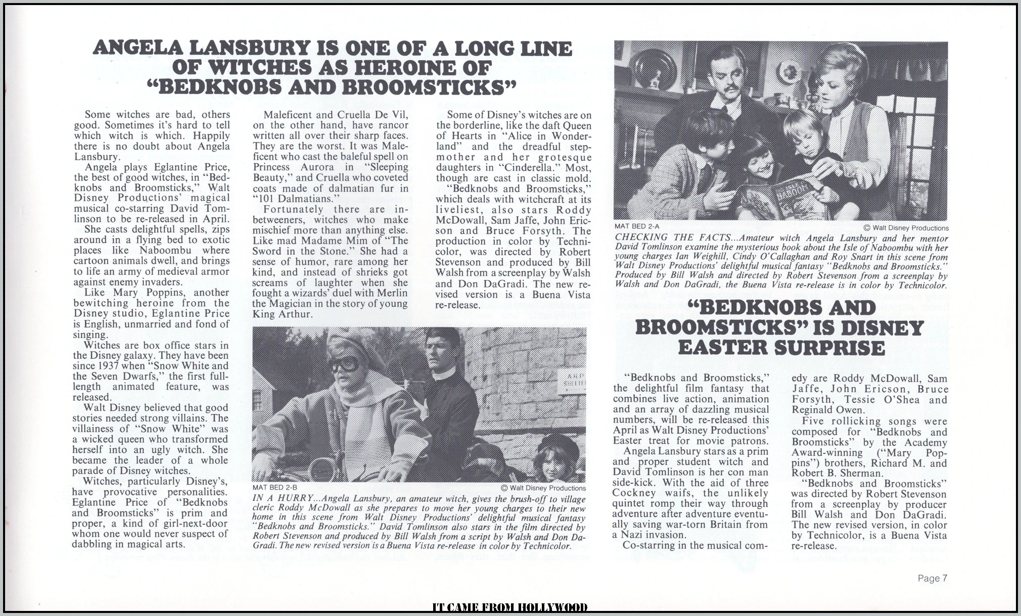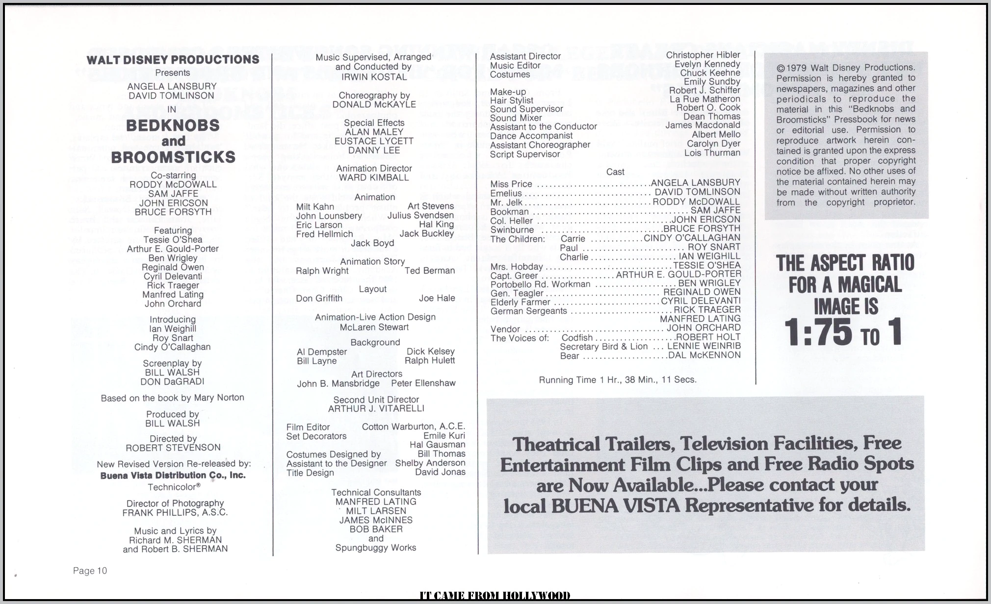 Courtesy of It Came From Hollywood…the re-release 1979 pressbook for Bedknobs and Broomsticks. The Sherman Brothers, who wrote the songs for Mary Poppins, Chitty Chitty Bang Bang, The Jungle Book, and many others, wrote the songs for this movie. They also wrote It’s a Small World After All, so nobody’s perfect. My favorite work of theirs would be Mary Poppins, which reaches sublime heights of melody and heartstrings’ tugging. The rights to Bedknobs and Broomsticks were acquired before those of Mary Poppins, but it was shelved a few years to make way for Mary Poppins, since the stories were somewhat similar. Julie Andrews was the preferred witch for Bedknobs, but feared typecasting and demurred. Angela Lansbury eventually took the role. The movie won the 1972 academy award for Best Visual Effects over its competition, When Dinosaurs Ruled the Earth. (Click each image to expand it–you will need a BIG screen–or right-click the expanded image to download it. And you don’t need witchcraft to find more pressbooks, just rummage through our categories.)