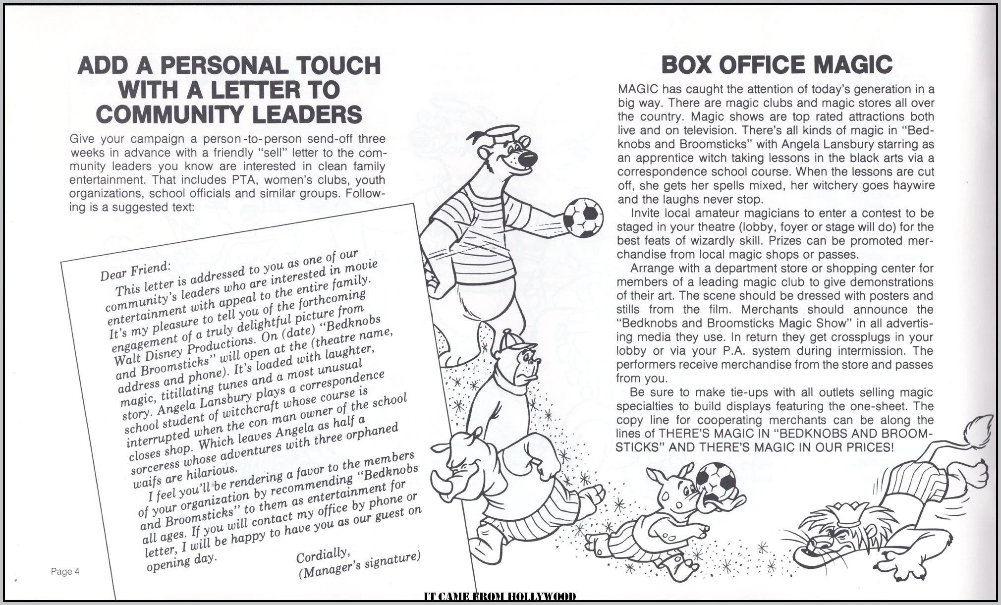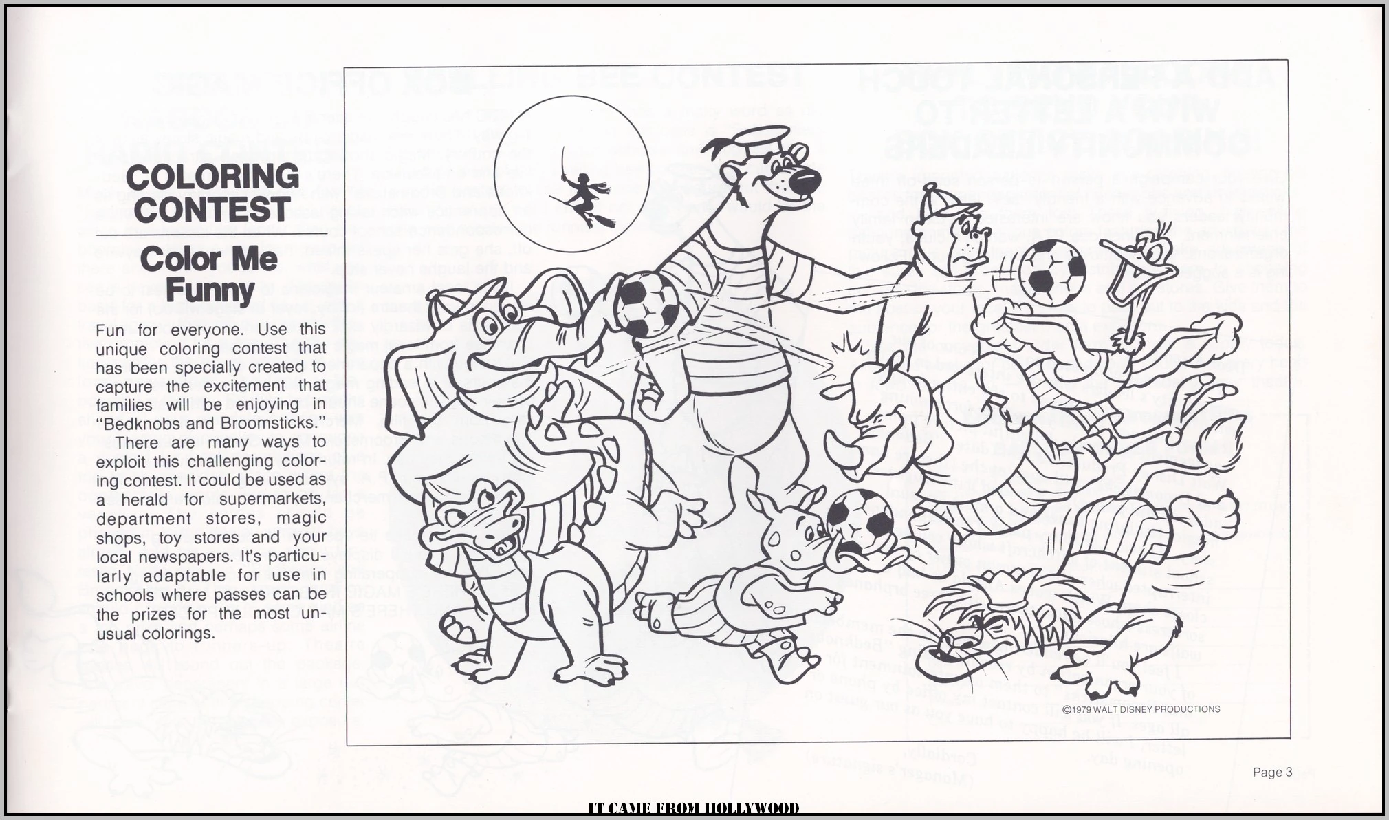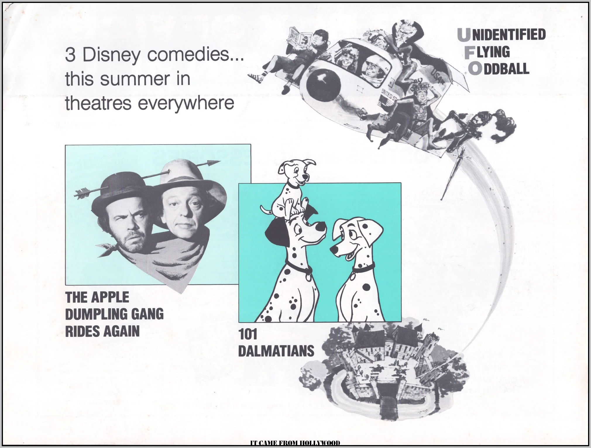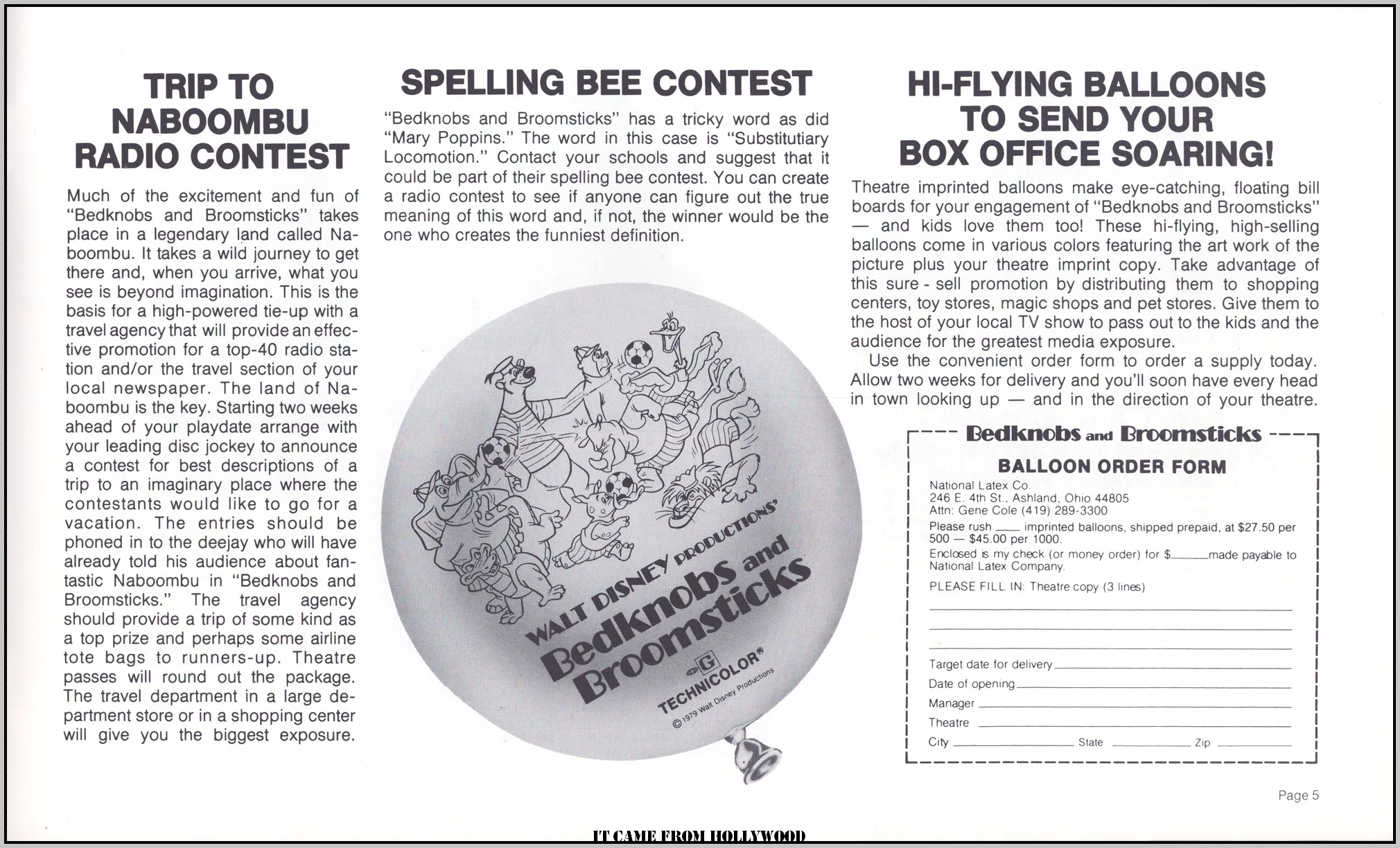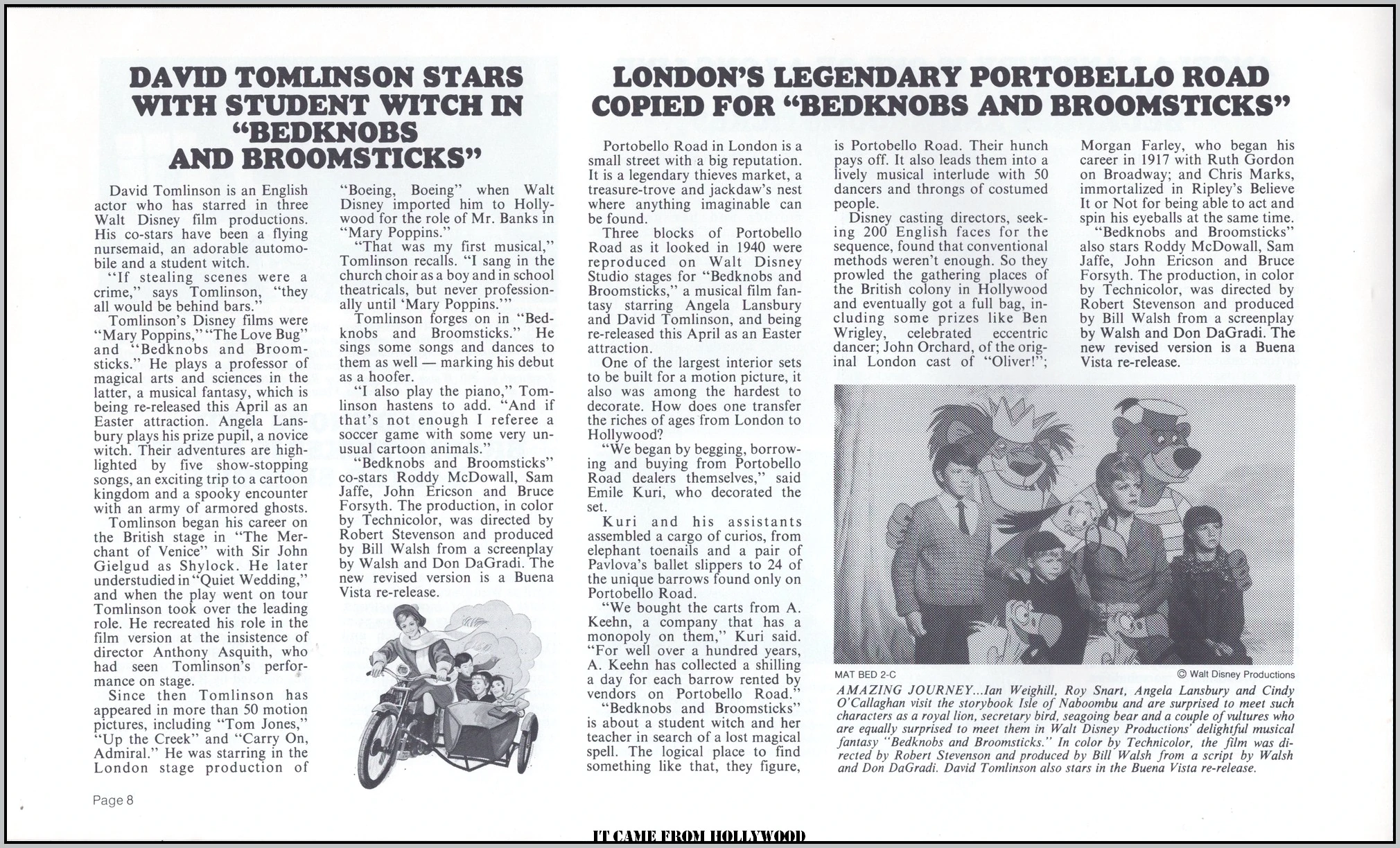 Courtesy of It Came From Hollywood…the re-release 1979 pressbook for Bedknobs and Broomsticks. The Sherman Brothers, who wrote the songs for Mary Poppins, Chitty Chitty Bang Bang, The Jungle Book, and many others, wrote the songs for this movie. They also wrote It’s a Small World After All, so nobody’s perfect. My favorite work of theirs would be Mary Poppins, which reaches sublime heights of melody and heartstrings’ tugging. The rights to Bedknobs and Broomsticks were acquired before those of Mary Poppins, but it was shelved a few years to make way for Mary Poppins, since the stories were somewhat similar. Julie Andrews was the preferred witch for Bedknobs, but feared typecasting and demurred. Angela Lansbury eventually took the role. The movie won the 1972 academy award for Best Visual Effects over its competition, When Dinosaurs Ruled the Earth. (Click each image to expand it–you will need a BIG screen–or right-click the expanded image to download it. And you don’t need witchcraft to find more pressbooks, just rummage through our categories.)