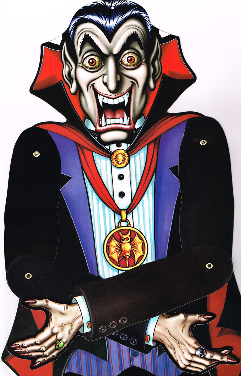 Here's a puzzle: this striking Beistle 36 inch jointed Dracula from 1998 with the wild eyes and toothy bite is not the one depicted on the packaging label below. Funny, but I just noticed that while scanning this sucker. I wonder why the design change? That dapper vampire on the label is definitely less in-biting, don't you think? He's more cartoony, while this Dracula is more mes…mer…izing… good lord!, don't stare into his eyesssssssssssssssssssssssssssssssssssssssssssssssssss………………………………………..