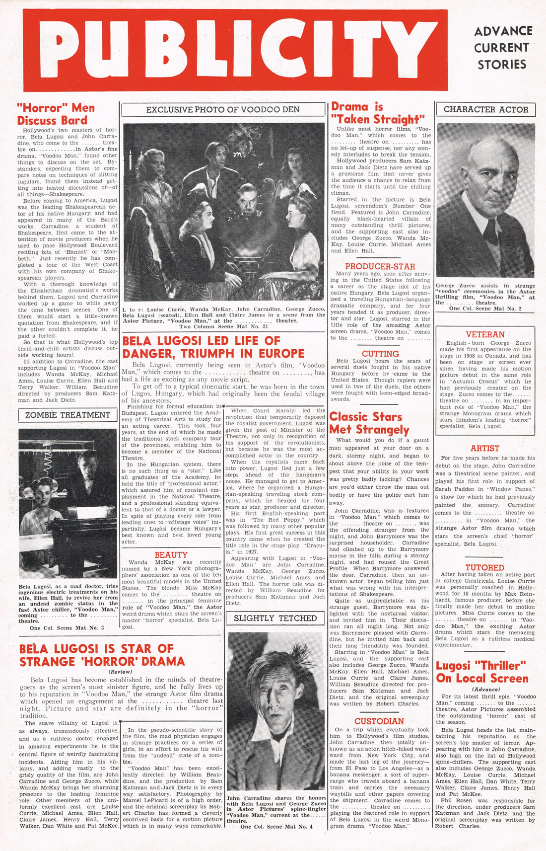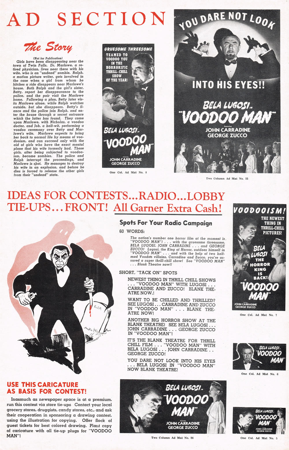 This 11×17 inches pressbook is four pages and hypes the presence of "the Horror King" Bela Lugosi. Cheap picture, big horror stars: Bela Lugosi, George Zucco, and John Carradine. I can watch any movie with Lugosi in it; he never budgeted his acting for any role.