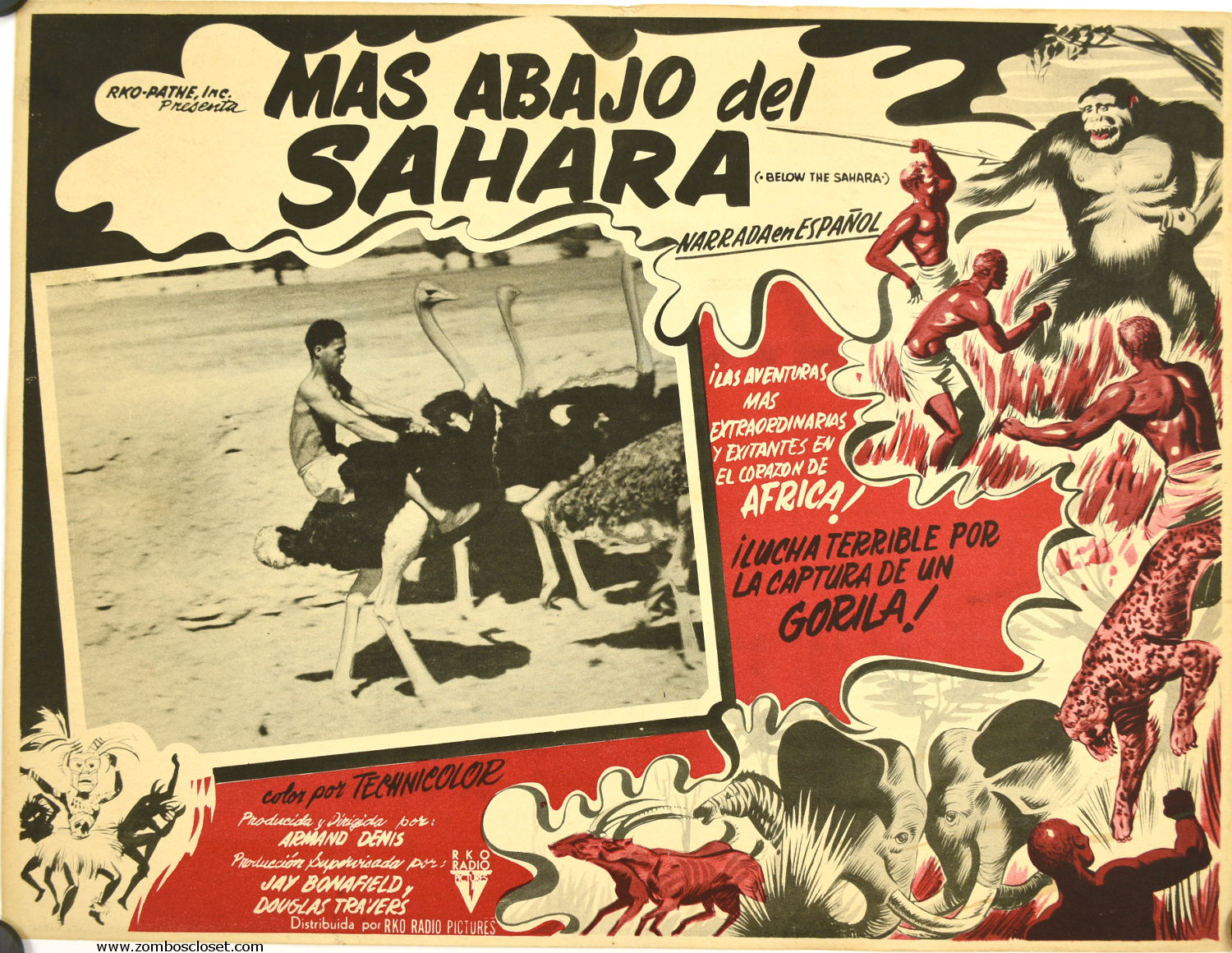 I bet you thought YouTube started all those silly self-indulgent pet tricks like riding an ostrich. Well, here's proof they started in 1953 (at least). This Mexican lobby card for Mas Abajo Del Sahara manages to create quite a bit of liveliness with a little color and energetic cartoon illustrations. And I like apes, so there.
