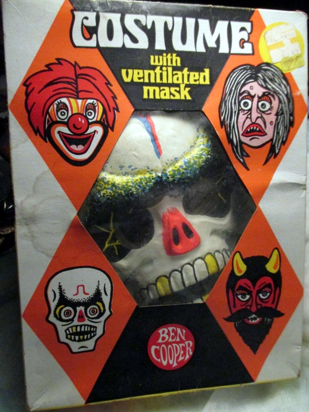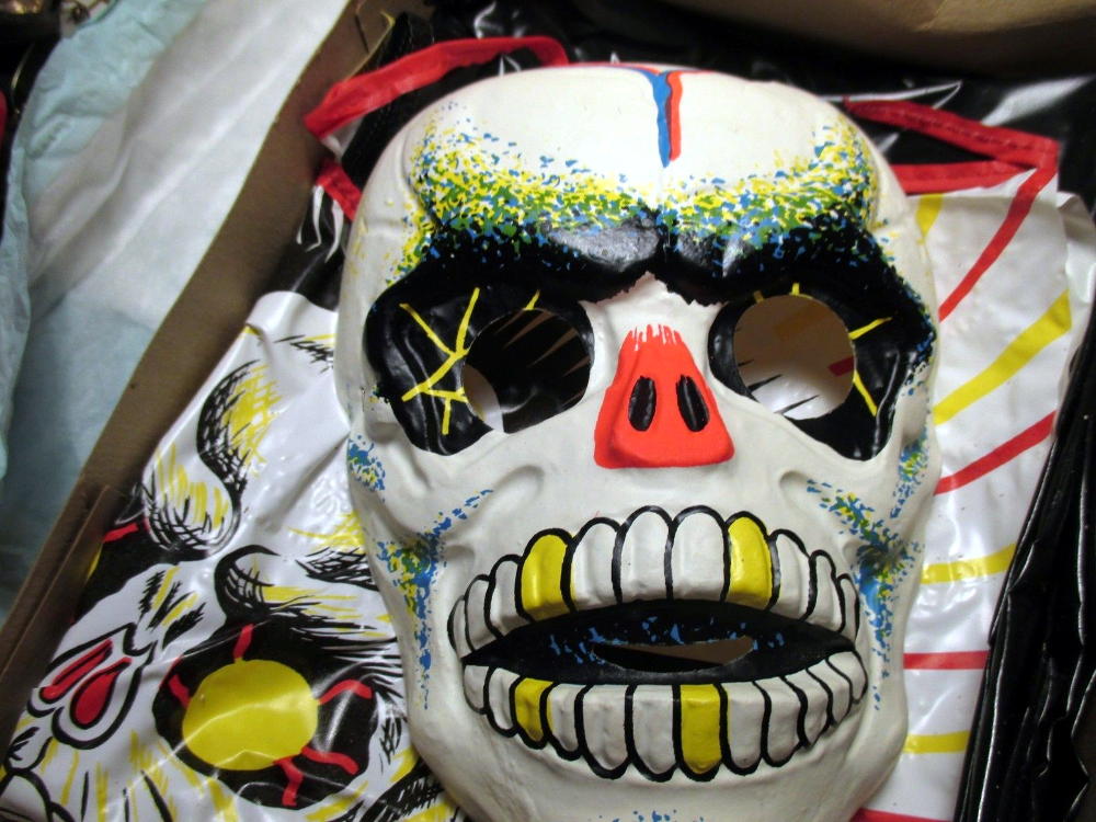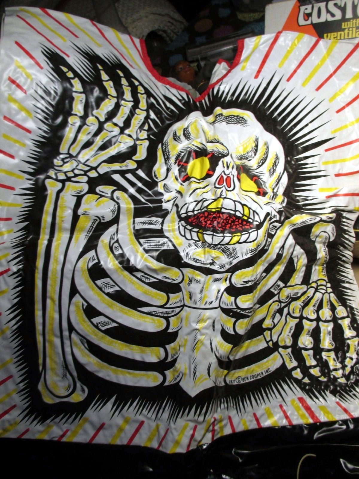 Here's a Ben Cooper Skeleton Halloween costume with ventilated mask, circa 1972. Of course, with the vinyl costume, you'd need more than just a mask to provide cooling relief. Whoever came up with the idea of saving money by using vinyl for Halloween costumes was evil, pure and simple. (Seller nashei listed this one on Ebay.)