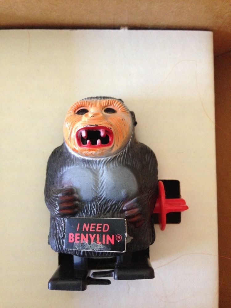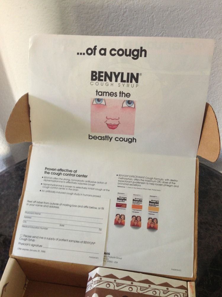 From seller phxsunny's listing: "Here is a very rare Mailer Advertisement promotion by Parke Davis for Benylin Medicine in the 1980's. The ad promotion was called "How to treat a monster" and these Monstrous Mailers were sent with a Benylin Monster wind up Toy (which still works) and probably a bottle of Benylin. (No Benylin comes with this auction) Only for the products shown."