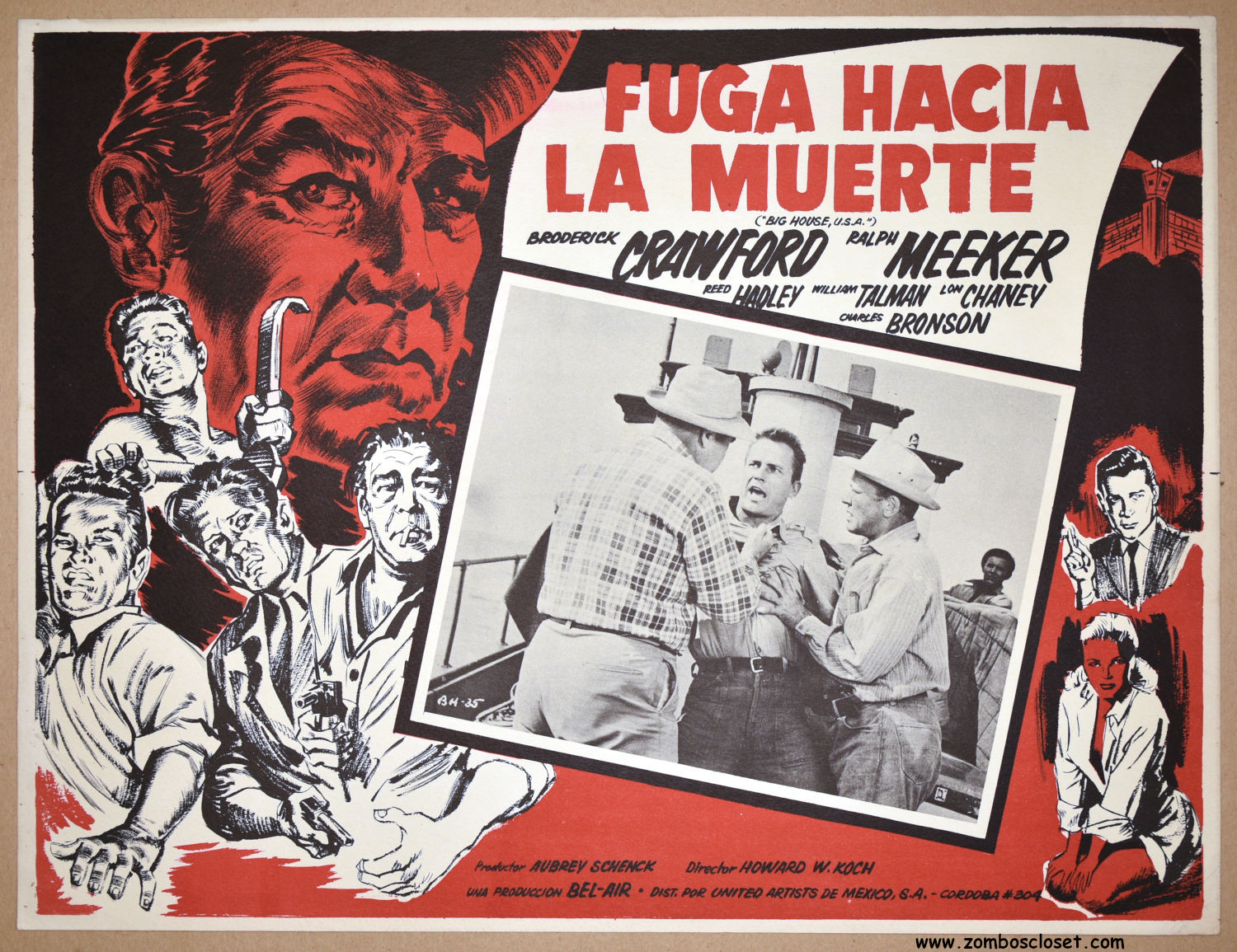 A gorgeous and dynamic Mexican lobby card for Big House, U.S.A draws attention to the crime drama. Five criminals go after the loot. Who will survive? Lon Chaney Jr gets minuscule billing. (Note: I'm thinking this is a repop, not the original card, but still a beauty.)