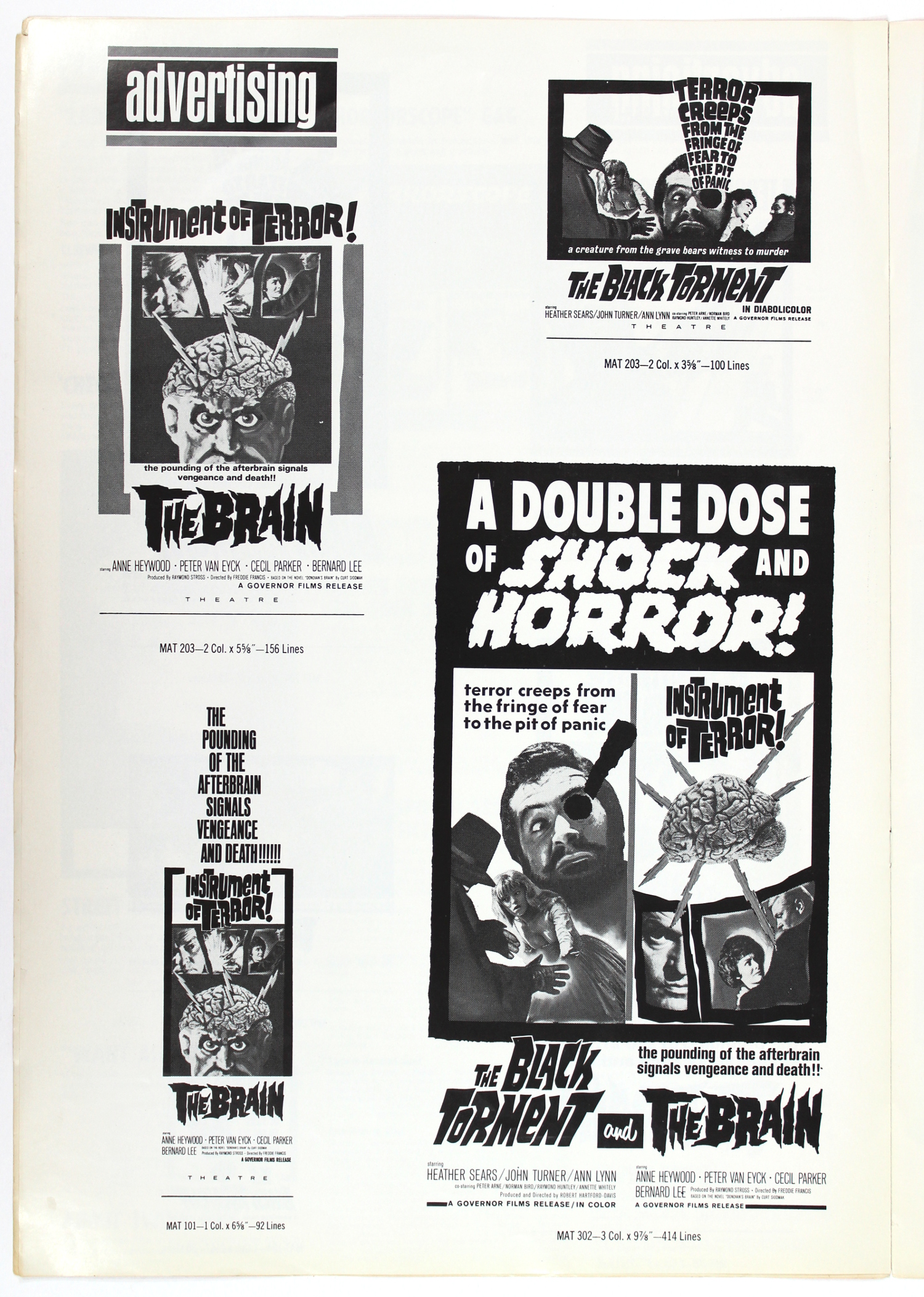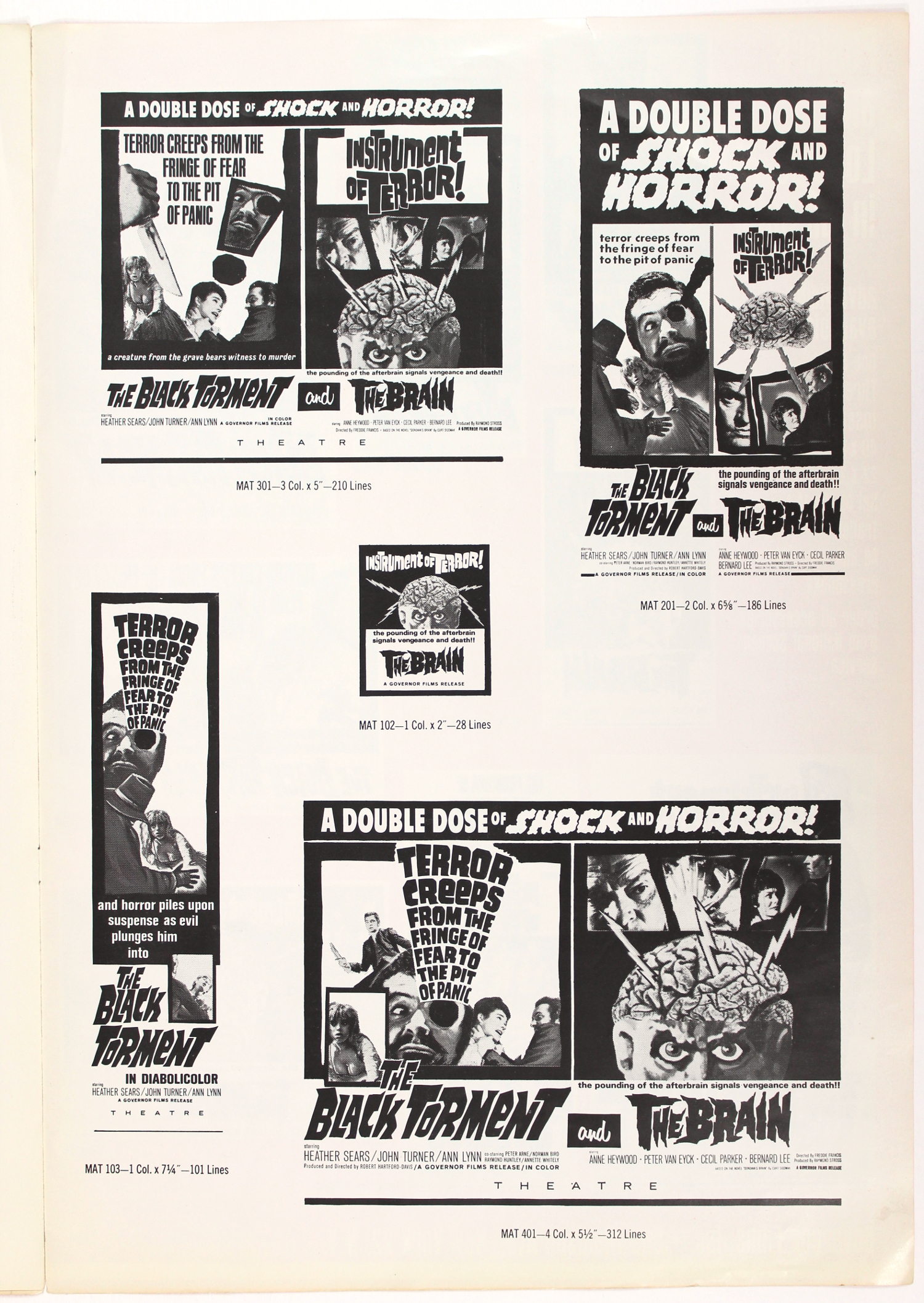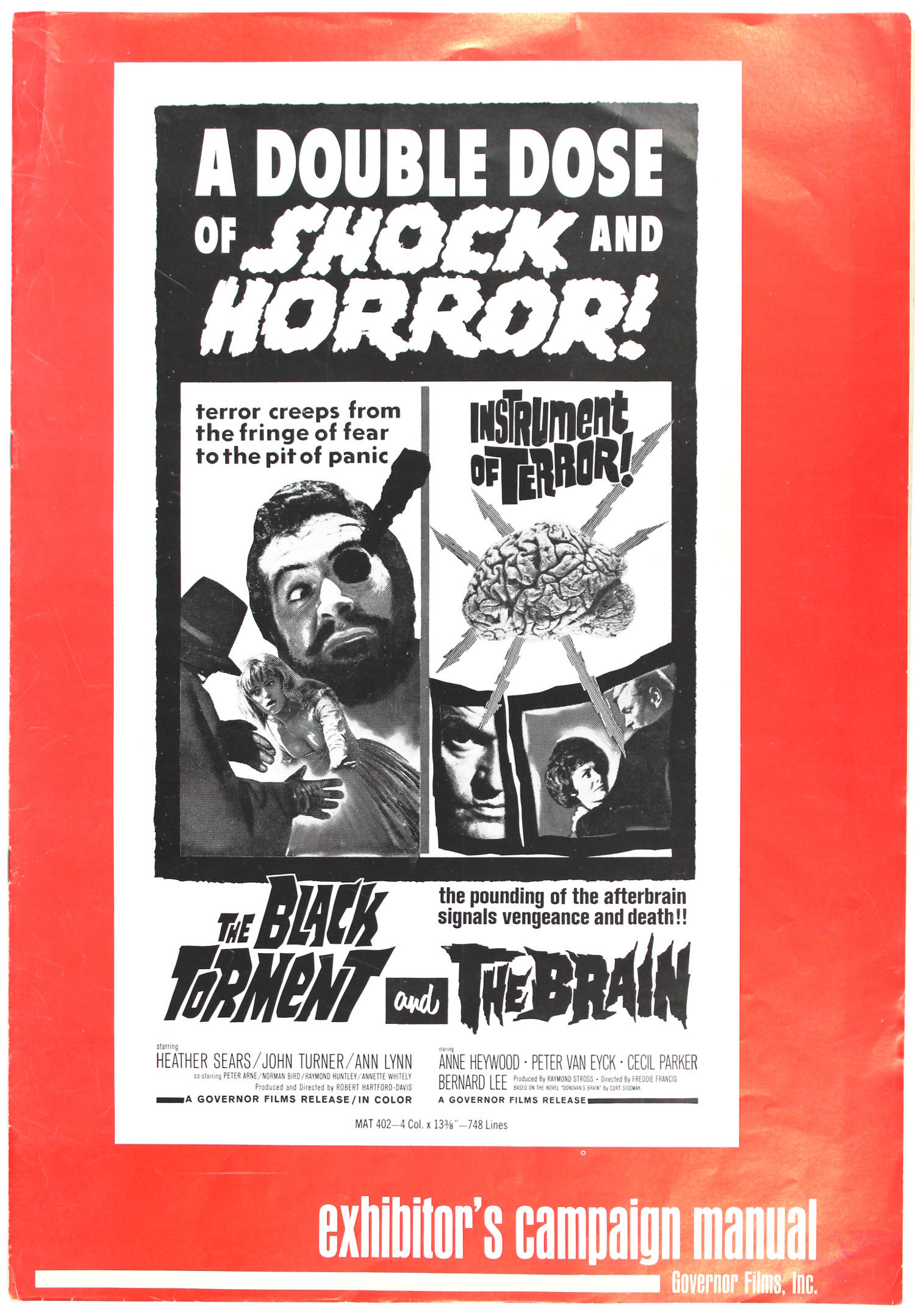 Here's the double bill pressbook for The Black Torment and The Brain. The Black Torment is a bit too long, and the acting by John Turner is from the scream and hysterics school of melodrama, but this overlooked costume movie has its moments of Gothic chills and atmosphere. Haven't seen The Brain. Yet.