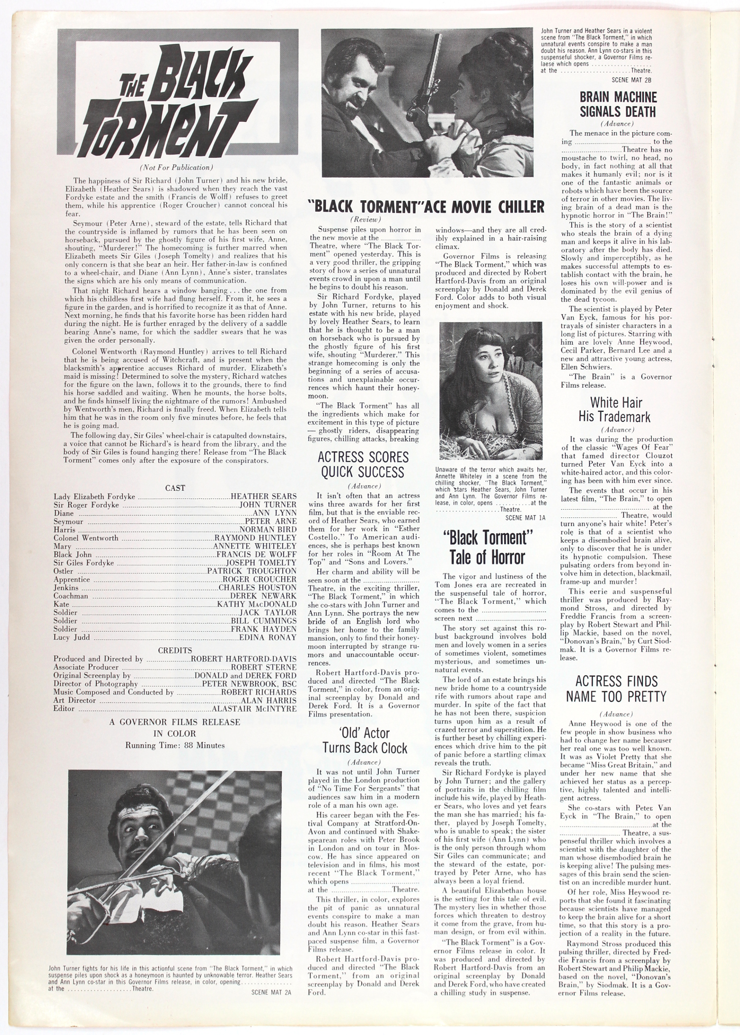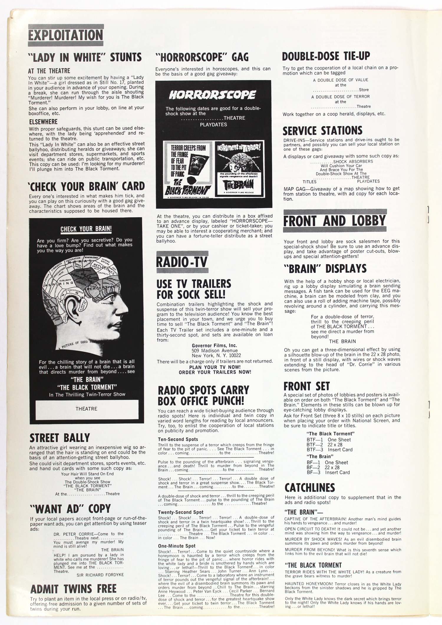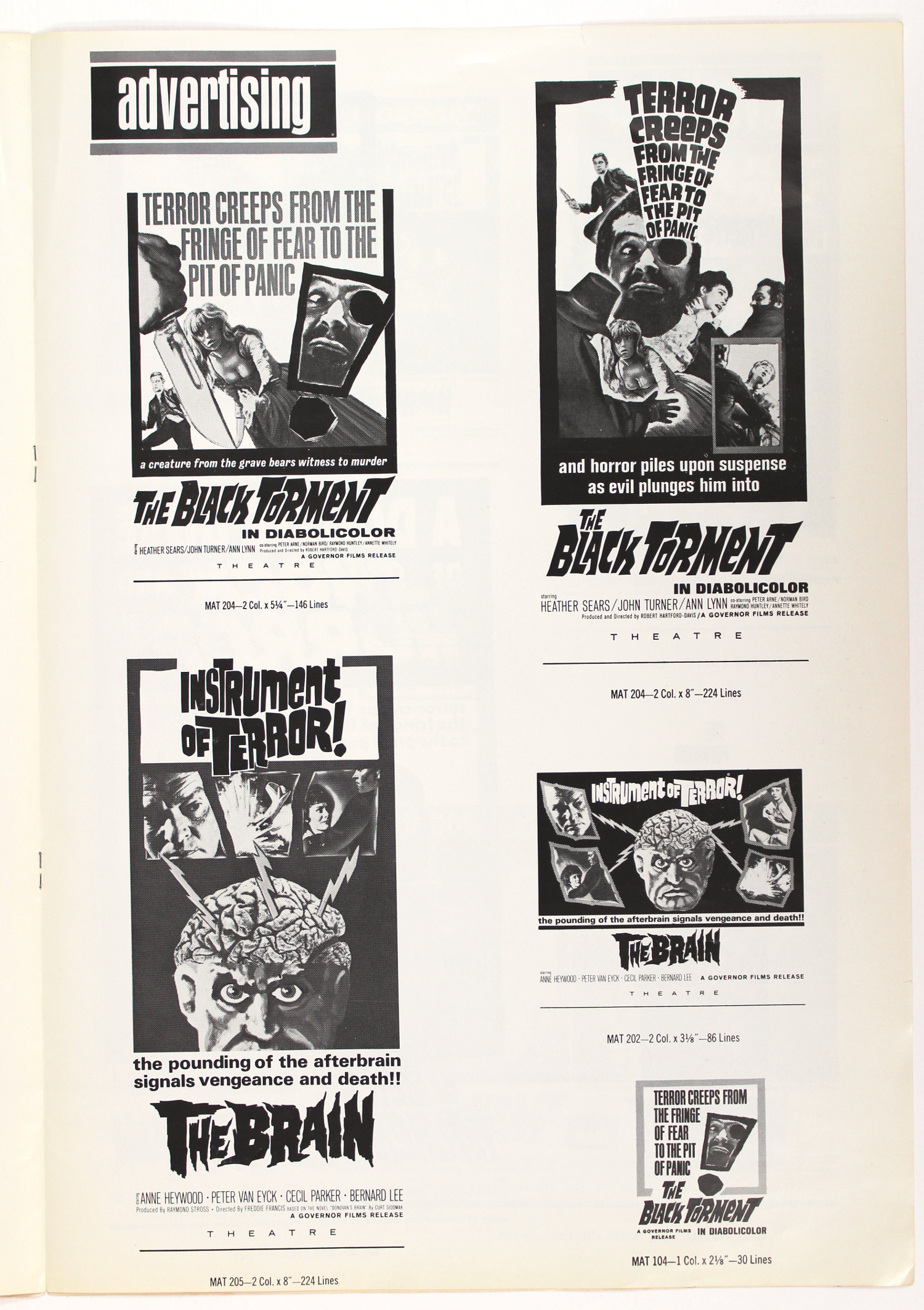 Here's the double bill pressbook for The Black Torment and The Brain. The Black Torment is a bit too long, and the acting by John Turner is from the scream and hysterics school of melodrama, but this overlooked costume movie has its moments of Gothic chills and atmosphere. Haven't seen The Brain. Yet.