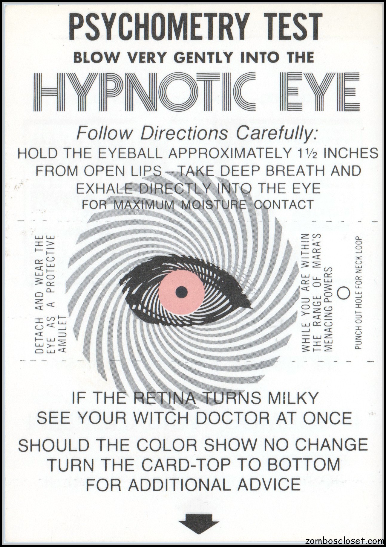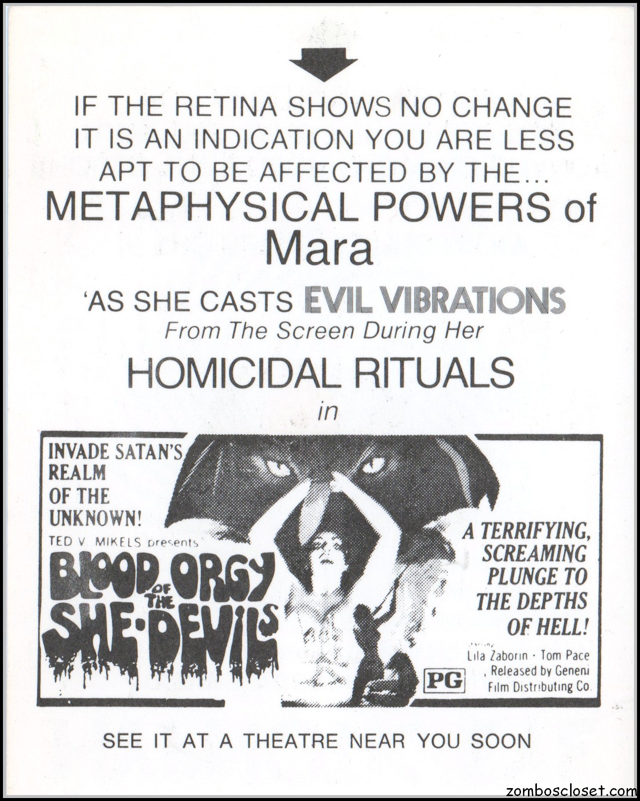 Here's a nifty giveaway for Blood Orgy of the She-Devils: the hypnotic eye psychometry test. It's very simple. What do you do to drum up interest in a no-budget horror by Ted V. Mikels? Why, just add orgy and blood in the movie's title and hand out cool stuff like this at the theater. Of course, that would entice me for sure, so I may be biased here. The double-sided card is 4 x 6 inches and I'd die to have a stack of these to hand out as tricks for Halloween. I can see those smiling faces on the kids' parents as I think of it.