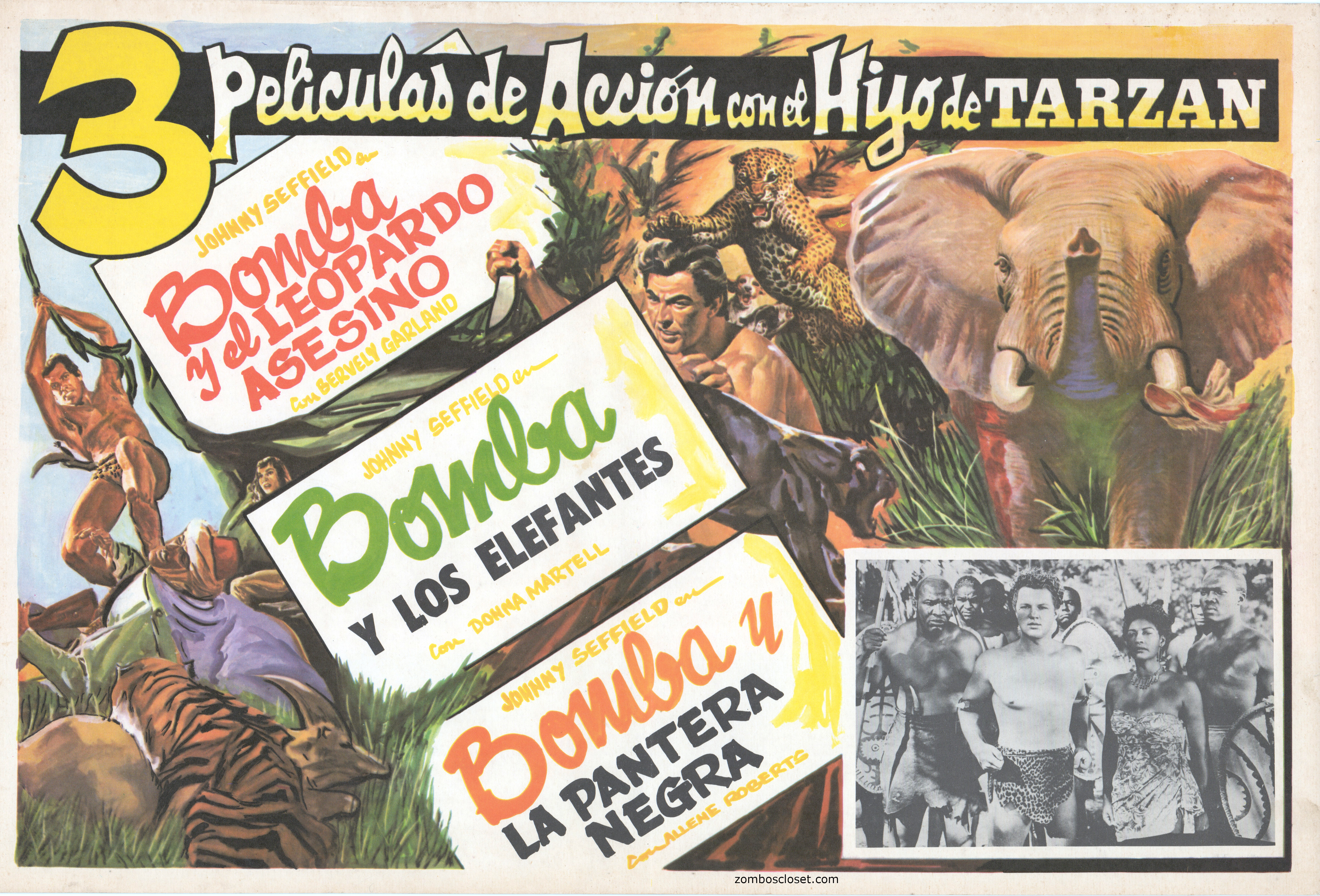 Here's a large (16.5 x 24) Mexican lobby for a Bomba marathon. The classic pulp style illustration shows Tarzan and no Bomba, but fear not; Bomba appears in the inset photo. Even the title says "son of Tarzan." Bomba isn't even top banana in his own movie promotion. At least the card, although cobbling previous illustrations together to save money, shows some style with the lettering and colors, and the layout all bad either, though they did chop into the background without a care.