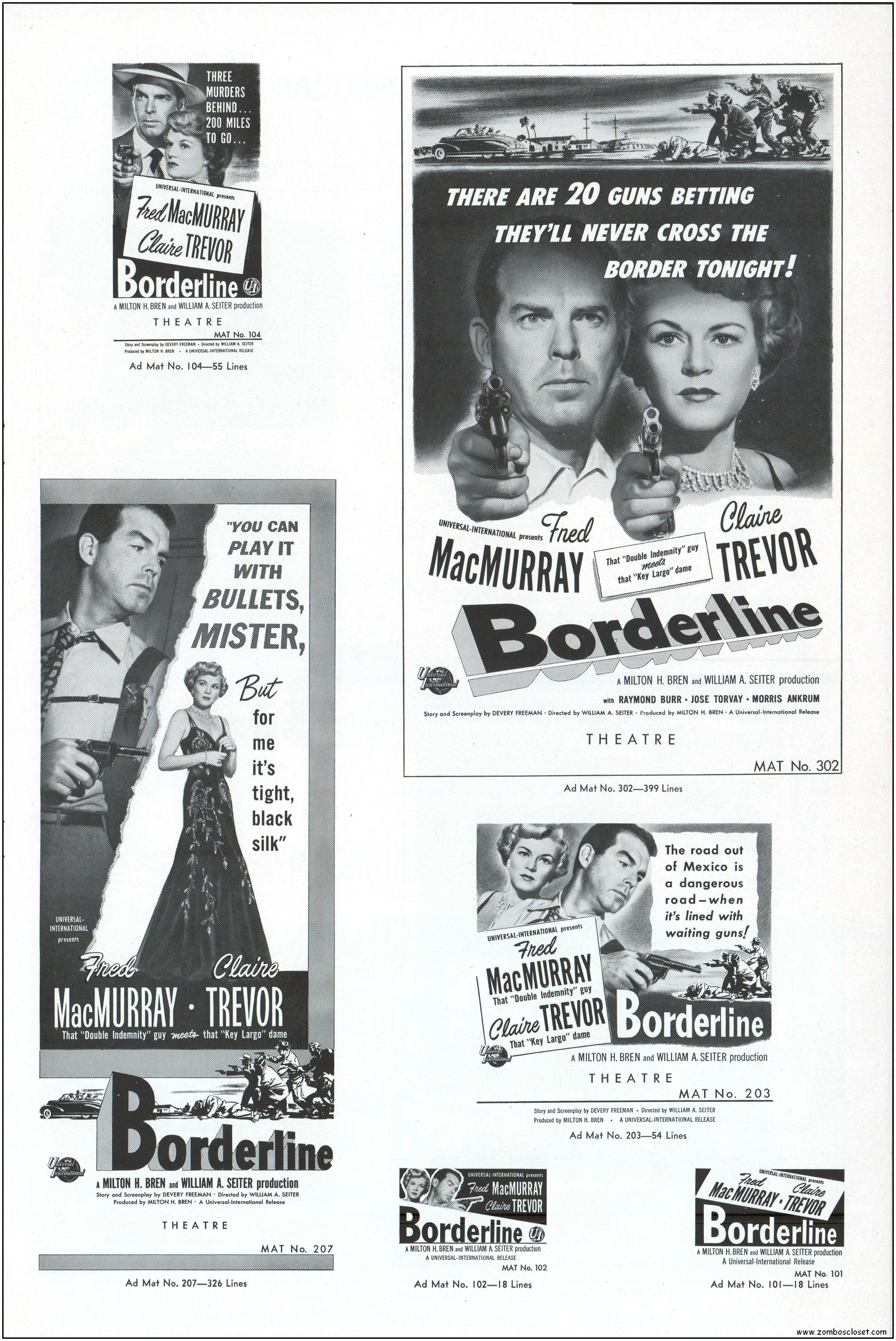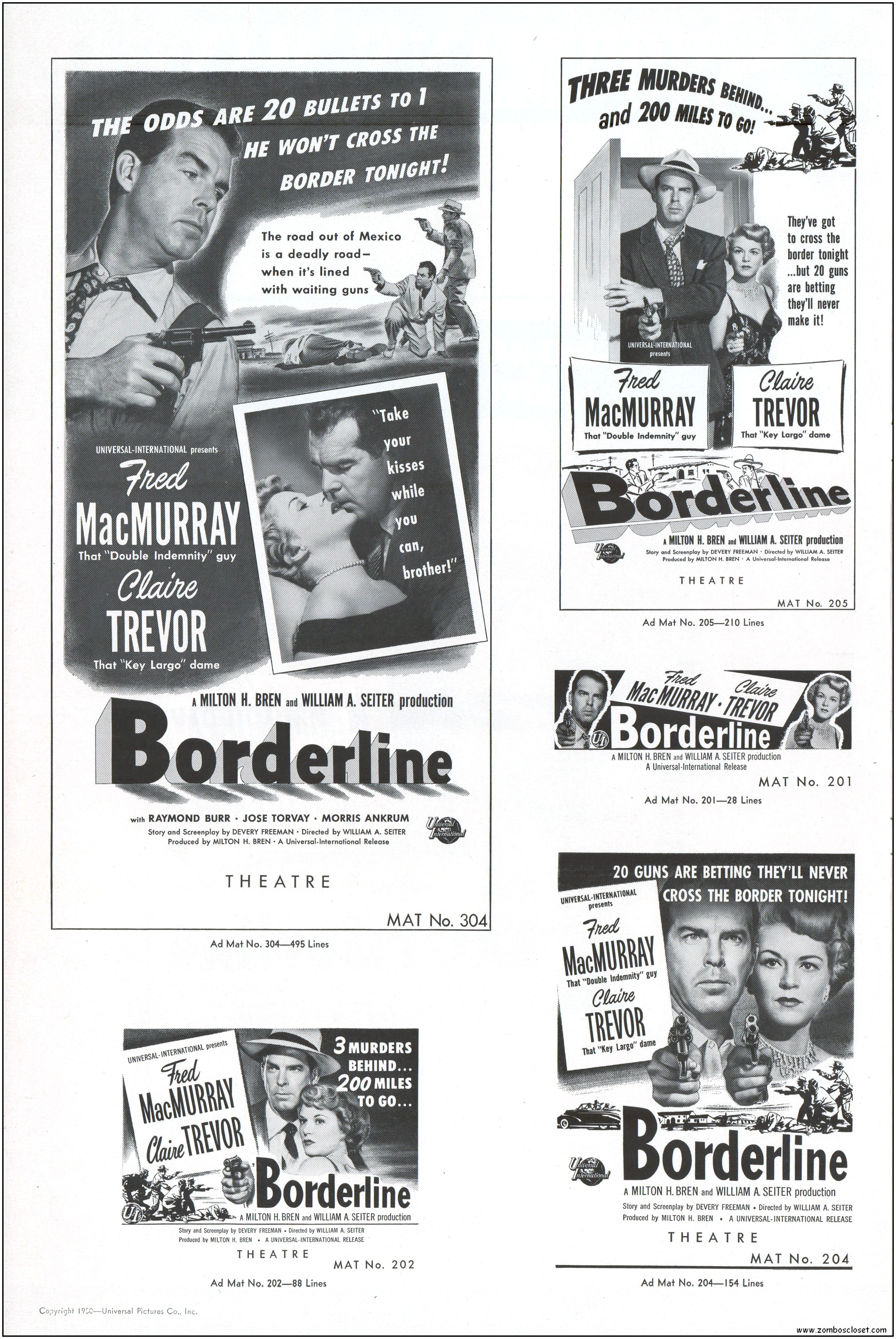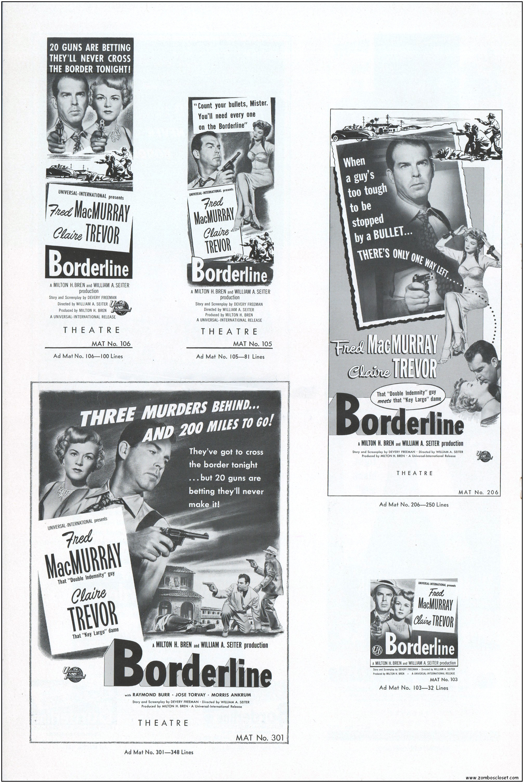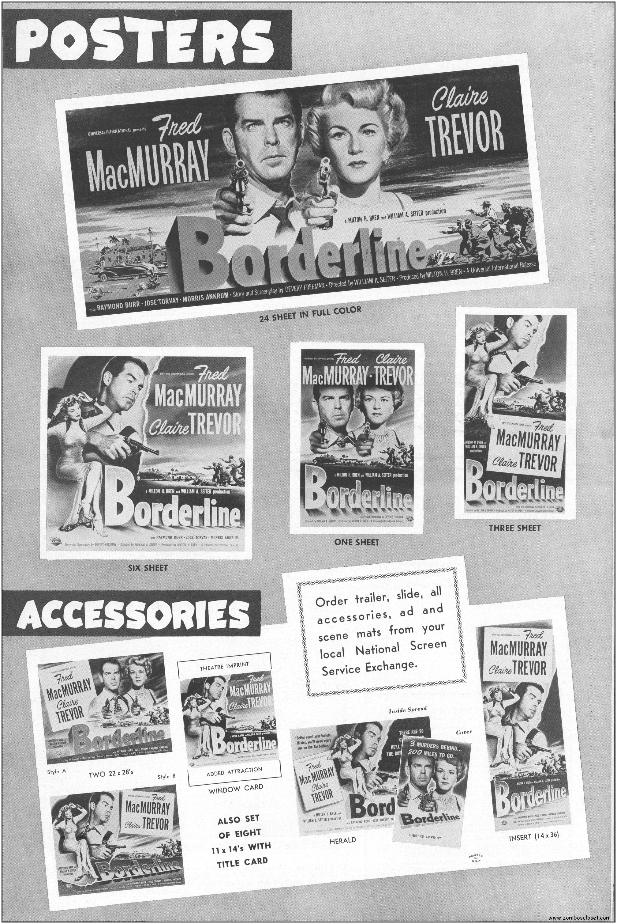 It’s unusual for a noir film to toss in humor and a light touch along with the criminal goings-on, but Borderline does that. Not all that well either: with Raymond Burr as the heavy and Claire Trevor and Fred MacMurry as agents not realizing they are on the same side, this story never quite finds its footing. So Borderline may be the film’s title, but it could also mean the way it doesn’t quite decide what’s serious and what’s funny, leaving the viewer precariously watching along that borderline to figure it out.