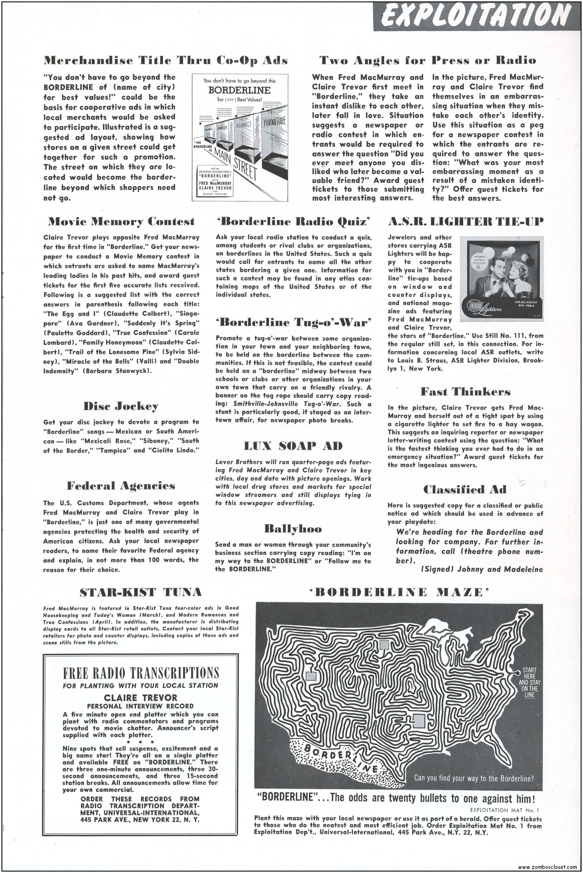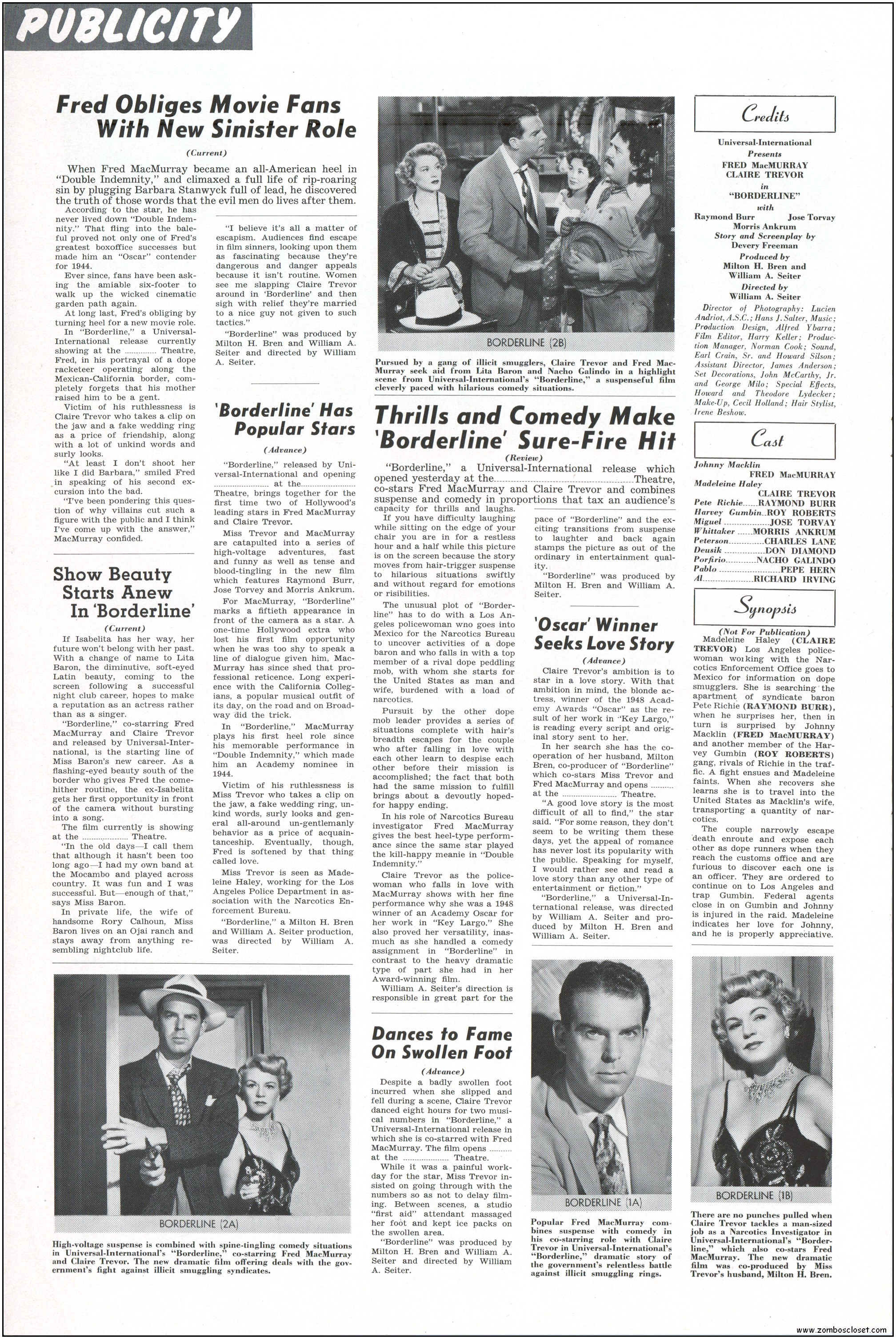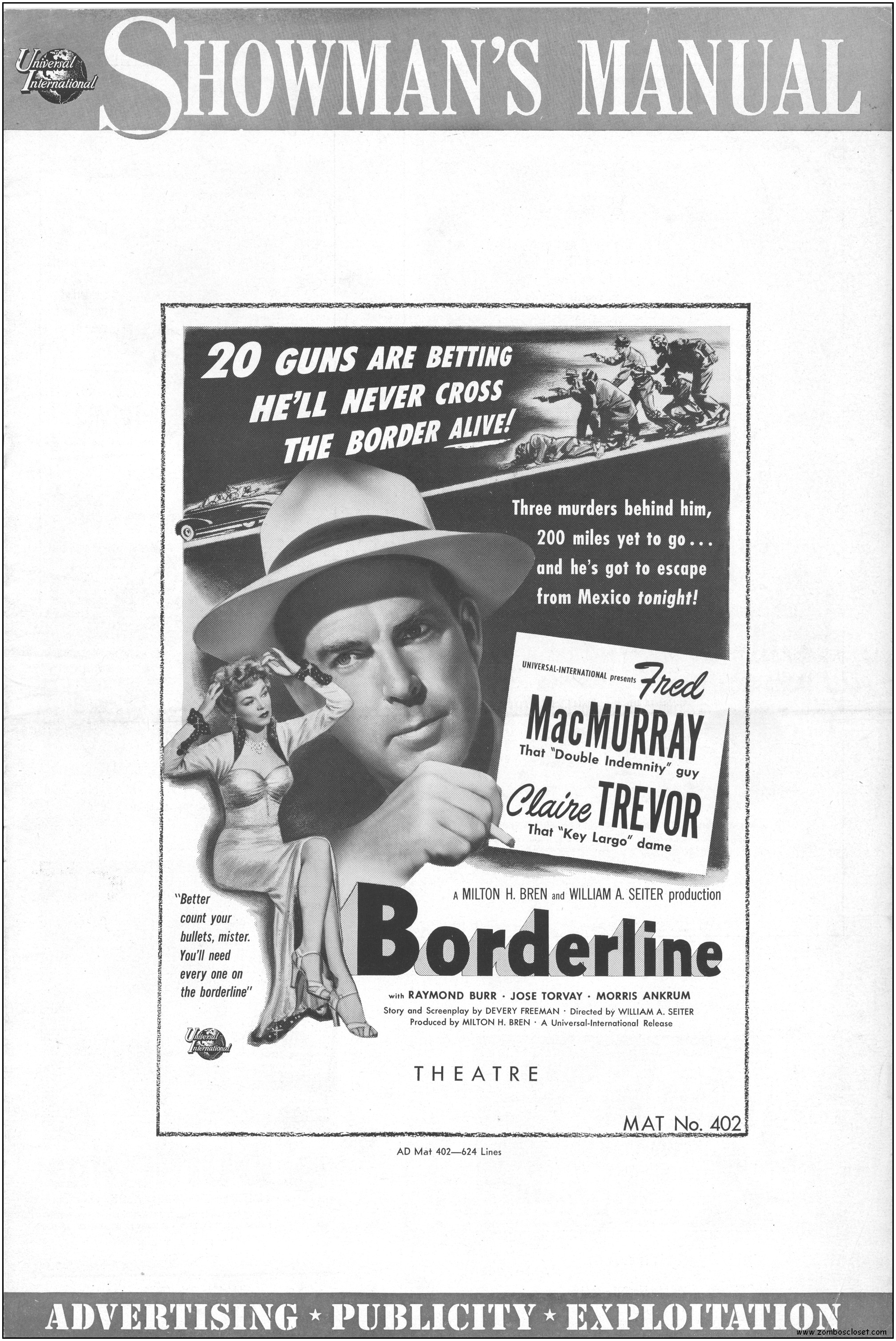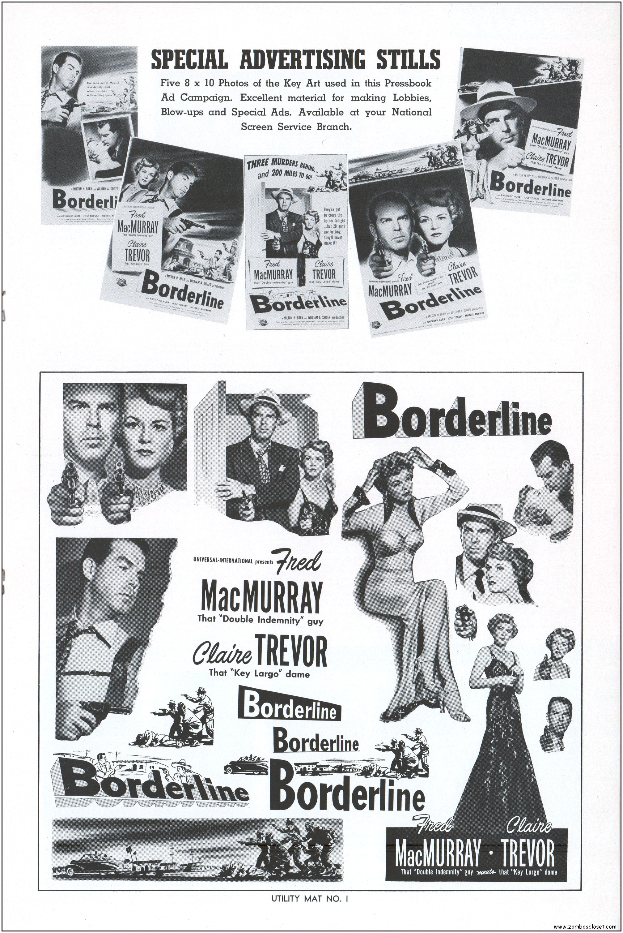 It’s unusual for a noir film to toss in humor and a light touch along with the criminal goings-on, but Borderline does that. Not all that well either: with Raymond Burr as the heavy and Claire Trevor and Fred MacMurry as agents not realizing they are on the same side, this story never quite finds its footing. So Borderline may be the film’s title, but it could also mean the way it doesn’t quite decide what’s serious and what’s funny, leaving the viewer precariously watching along that borderline to figure it out.