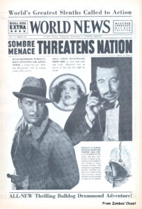 Here is the 4-page movie herald for Bulldog Drummond Strikes Back 1934. Debonair Ronald Colman again stars as the urbane adventurer fighting crime. Lucille Ball makes an uncredited appearance as a bridesmaid. In 1947, another Bulldog Drummond Strikes Back starring Ron Randell hit the screens. Warner Oland (aka Charlie Chan in 16 movies) provides the sinister machinations in this pre-code B thriller.