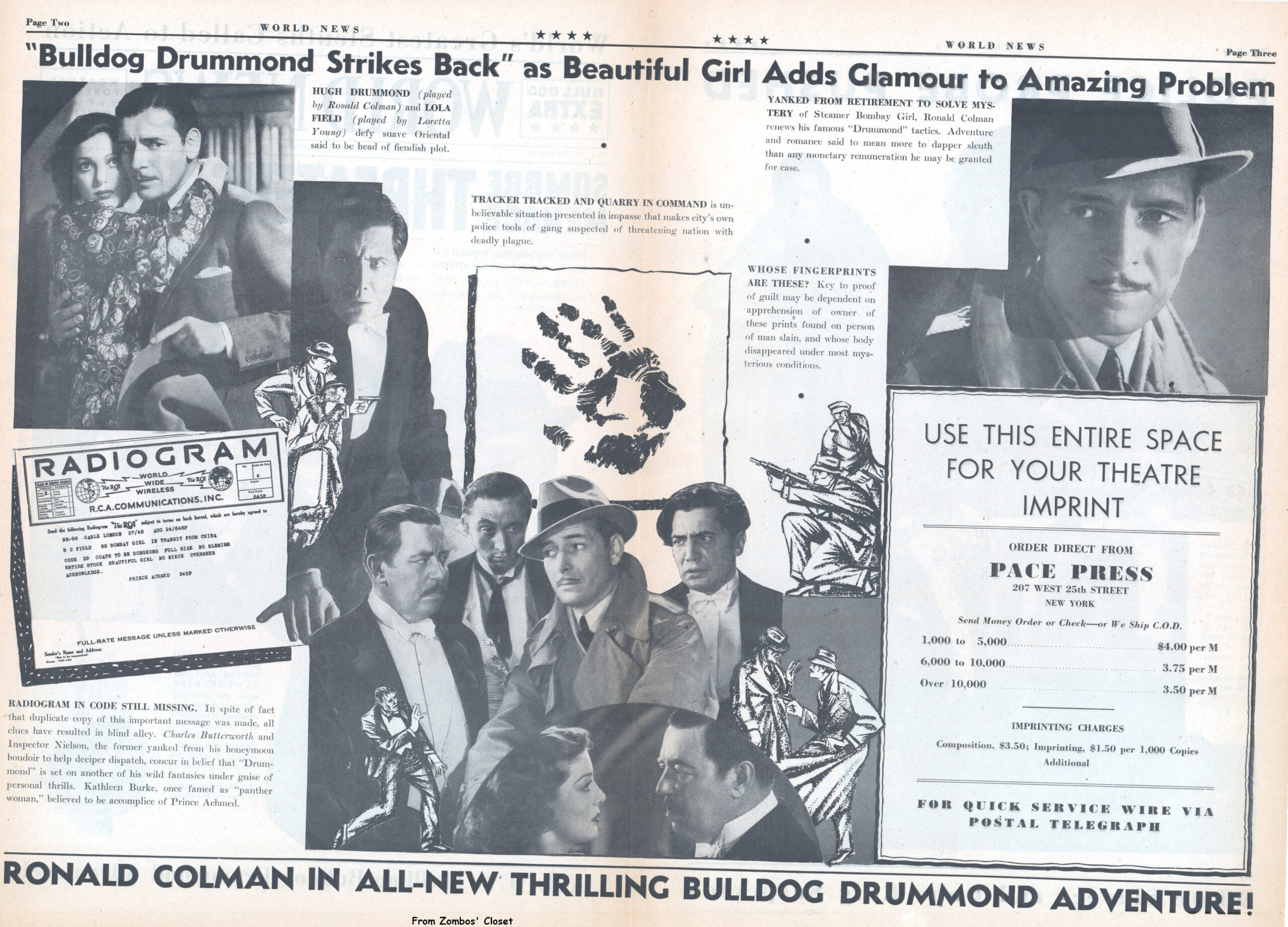 Here is the 4-page movie herald for Bulldog Drummond Strikes Back 1934. Debonair Ronald Colman again stars as the urbane adventurer fighting crime. Lucille Ball makes an uncredited appearance as a bridesmaid. In 1947, another Bulldog Drummond Strikes Back starring Ron Randell hit the screens. Warner Oland (aka Charlie Chan in 16 movies) provides the sinister machinations in this pre-code B thriller.