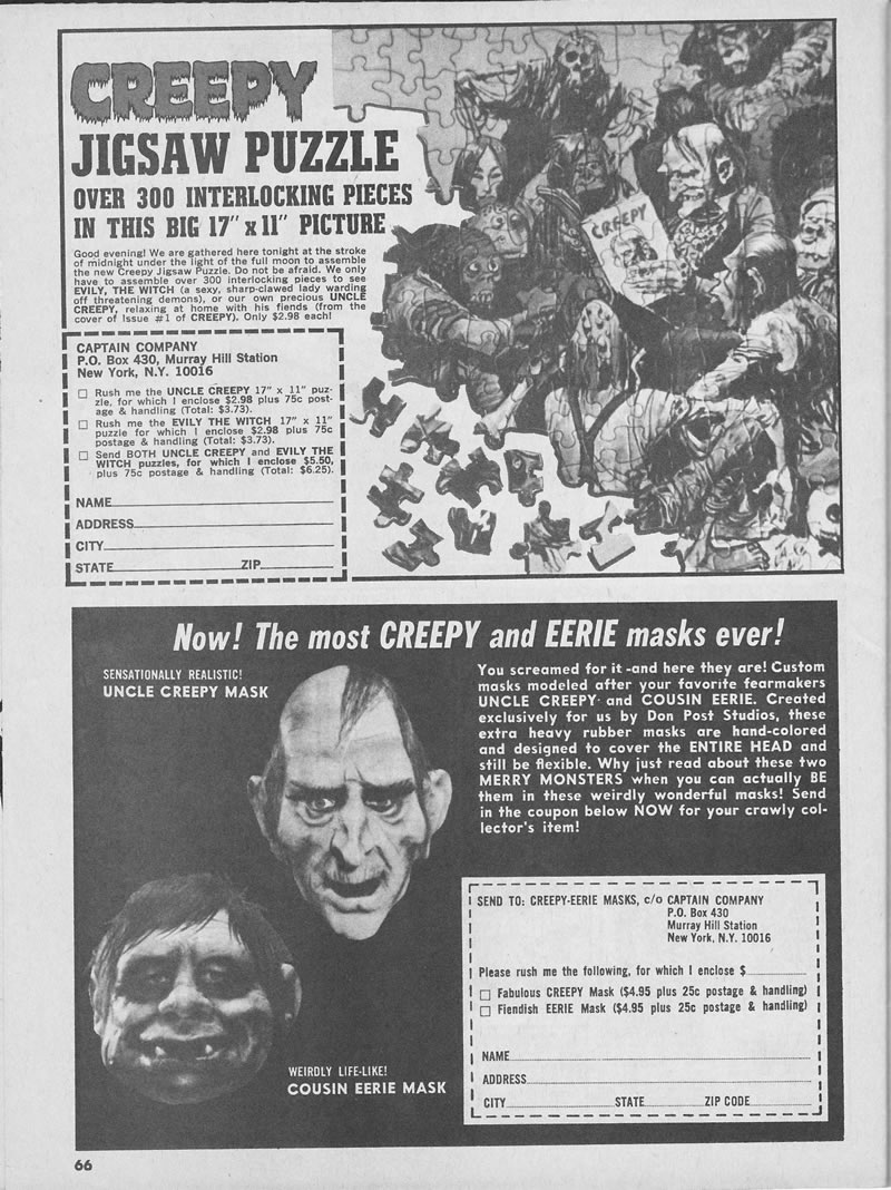 Creepy and Eerie magazines are the epitome of monsterkidism, back in the day. Without Warren Publishing pushing the horror craze in print, we'd be the lesser for it. It's ironic when you think of it, but with all this horror came a more stalwart social awareness through the telling of it, which kids were privy to and adults abhorred.
