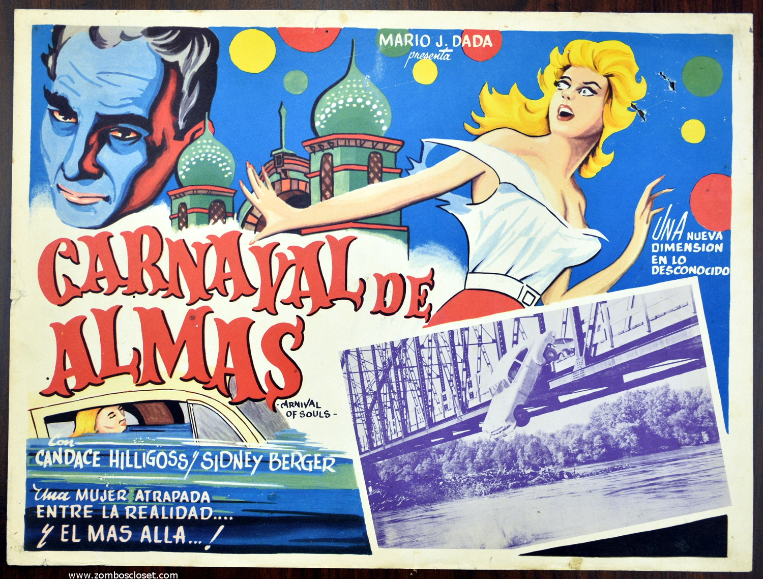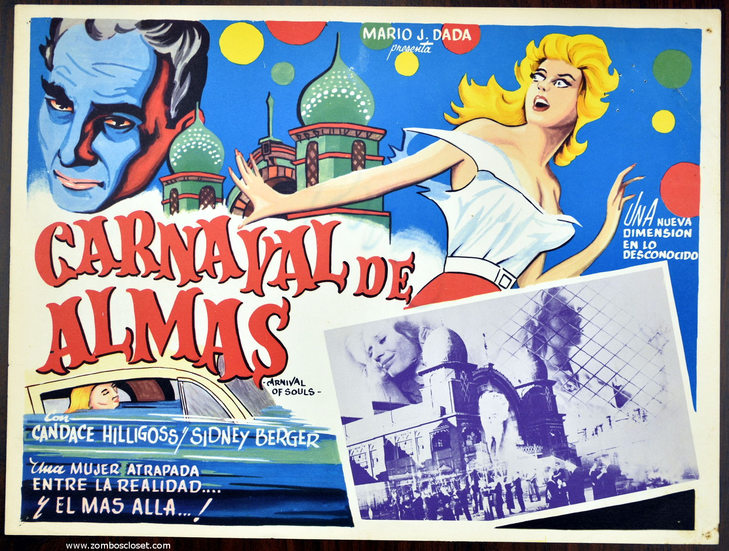 I don't think the Mexican lobby card for Carnival of Souls captures the eerie and creepy of the movie. I'll assume the artist didn't see it and went with the "Carnival" in the title instead, making the card more color-festive than dancing-zombies-dreamlike. And of course, her bosom gets more attention than the horrorish parts. Still, the card is a standout. If you haven't seen Carnival of Souls, get thee hence to a DVR! I recommend the Criterion Collection's Blu-ray edition (I paid for my copy and enjoyed it).