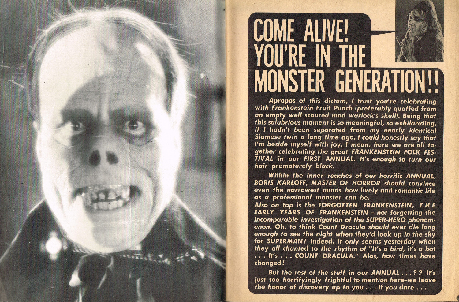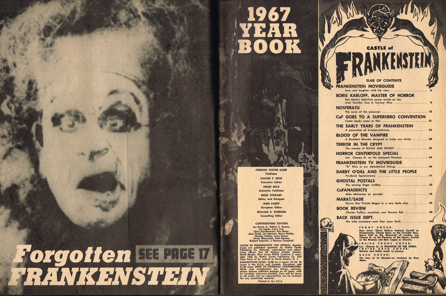 Boris Karloff, Frankenstein's Monster, CoF goes to a Super Hero Convention, and the TV Movieguide make this a steal at 50 cents. Check out the Frankenstein Society fan club ad, too. Boy, I wish I had joined it back then. ( Download CBZ formatted Castle of Frankenstein 1967 Fearbook for Your Comic Book Reader)