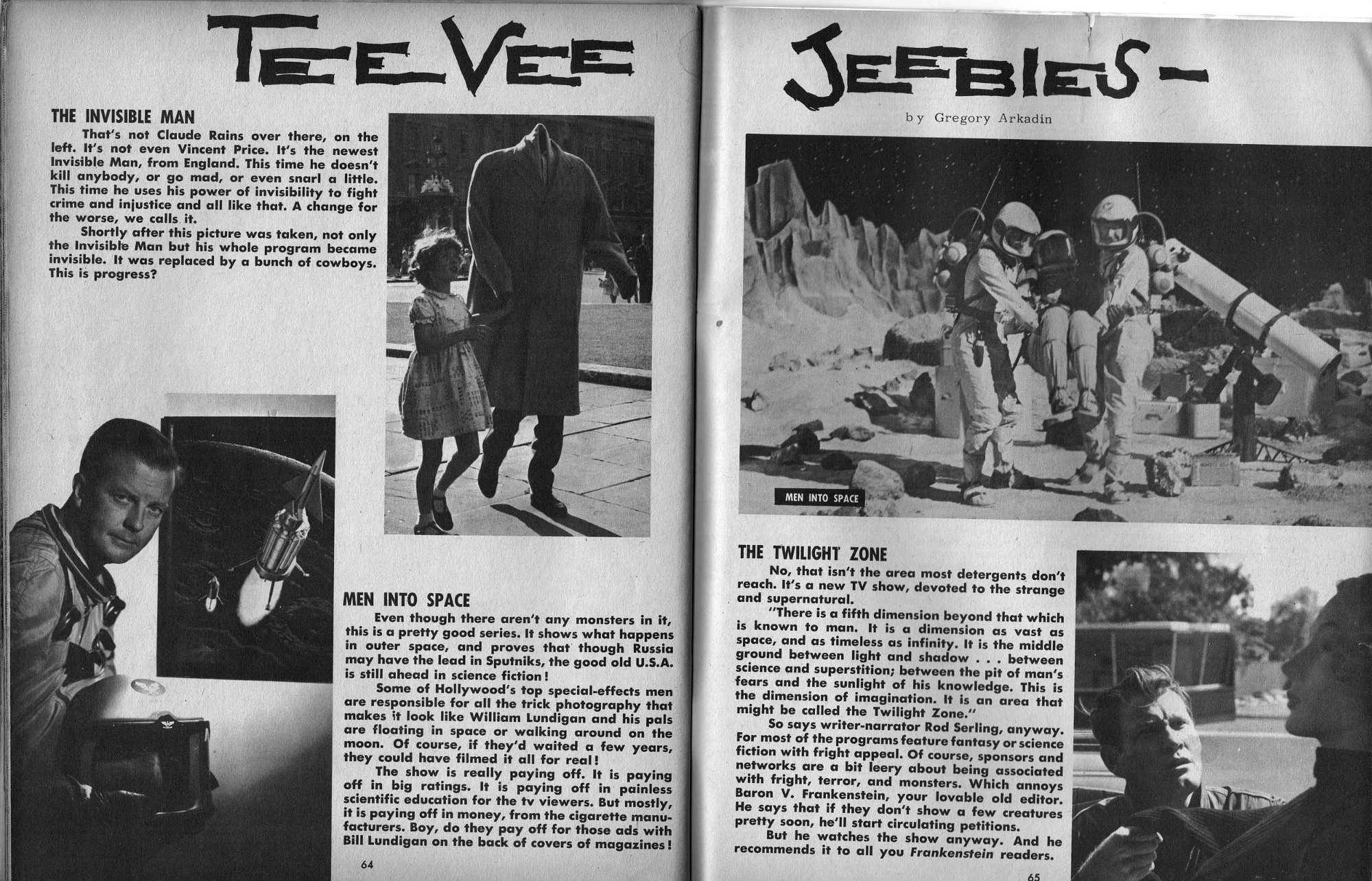 A few years after Journal of Frankenstein hit the magazine racks, Calvin Beck (with editing by Ken Beale) returned with Castle of Frankenstein in 1962. The magazine's hand-pasted layout had not improved (no digital publishing tools back then), and this first issue went for the pictures and humor approach. Still, Zacherley's Wife Contest and TeeVee Jeebies hint at the more varied coverage to come in later issues. This copy courtesy of Professor Kinema. Here's the comic book reader version: Download Castle of Frankenstein Issue 1