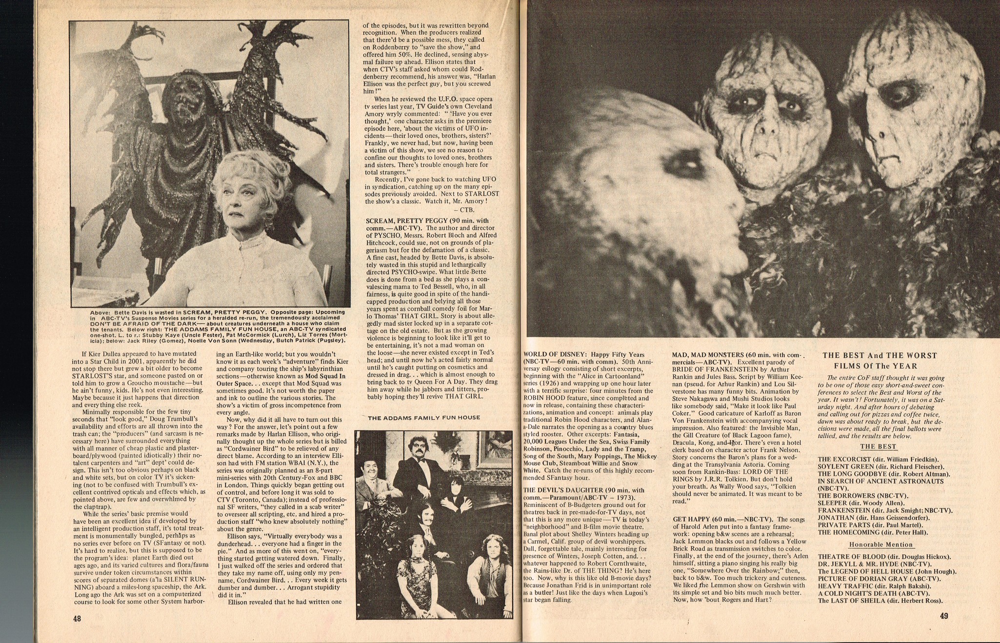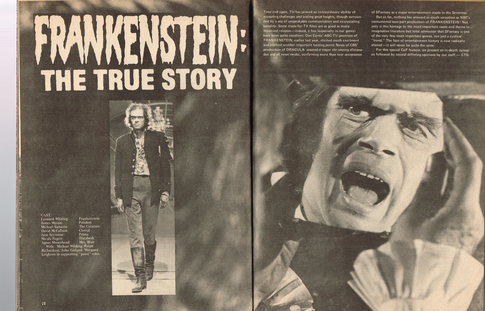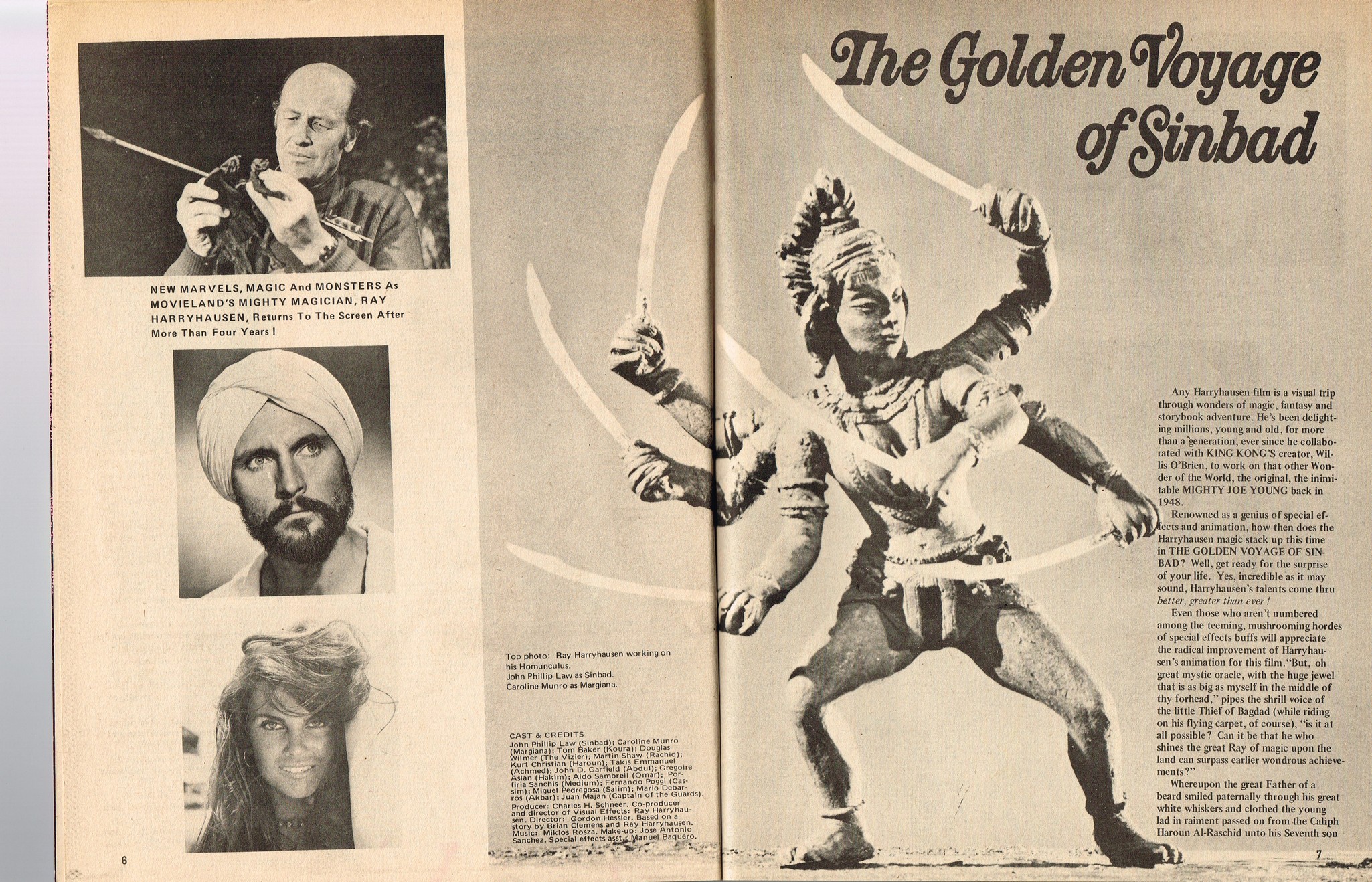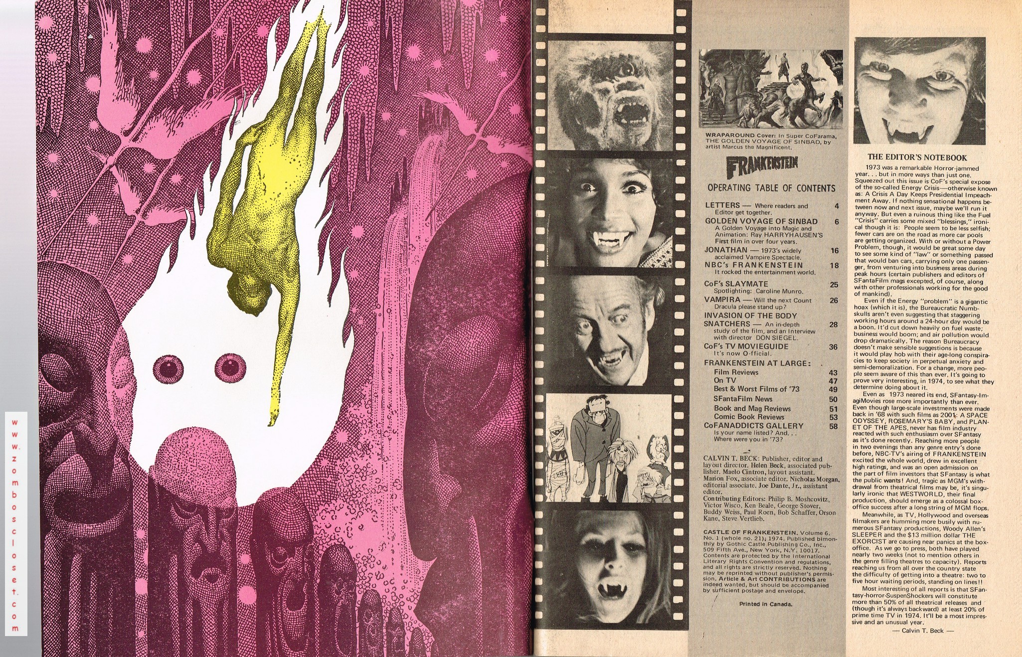 With a gorgeous wraparound cover and coverage on The Golden Voyage of Sinbad, television's Frankenstein: The True Story, and a slaymate of the month pinup with Caroline Munro, this issue is worth the cover price of 75 cents right there. Then there's the interview with Invasion of the Body Snatchers director Don Siegel, foreign movie coverage with Jonathan, and the indispensable Frankenstein TV Movieguide.