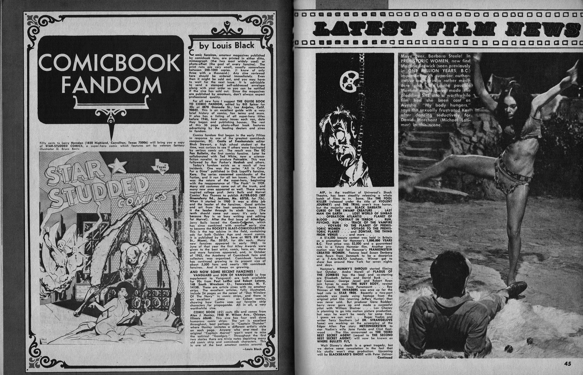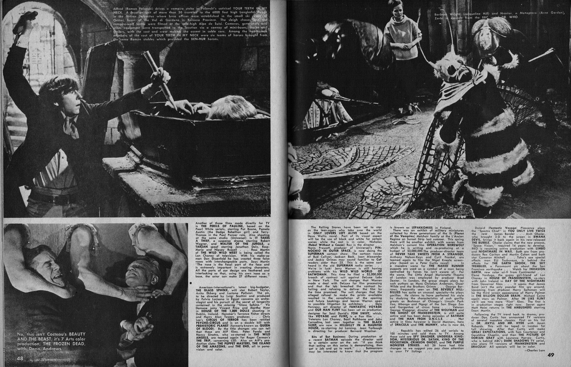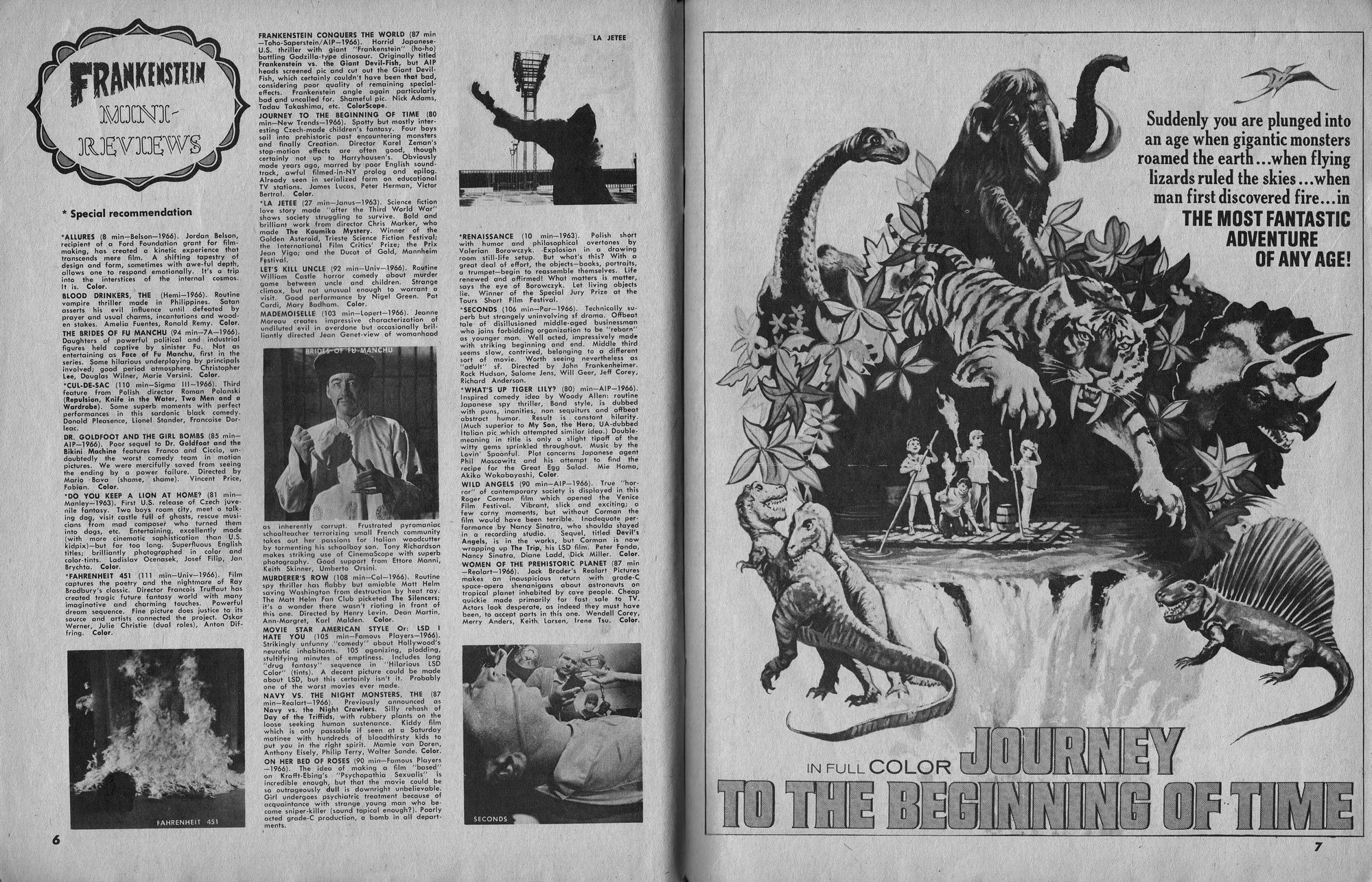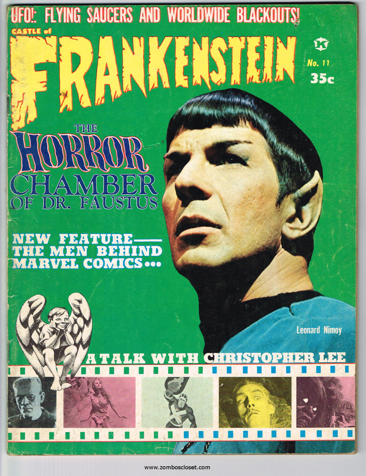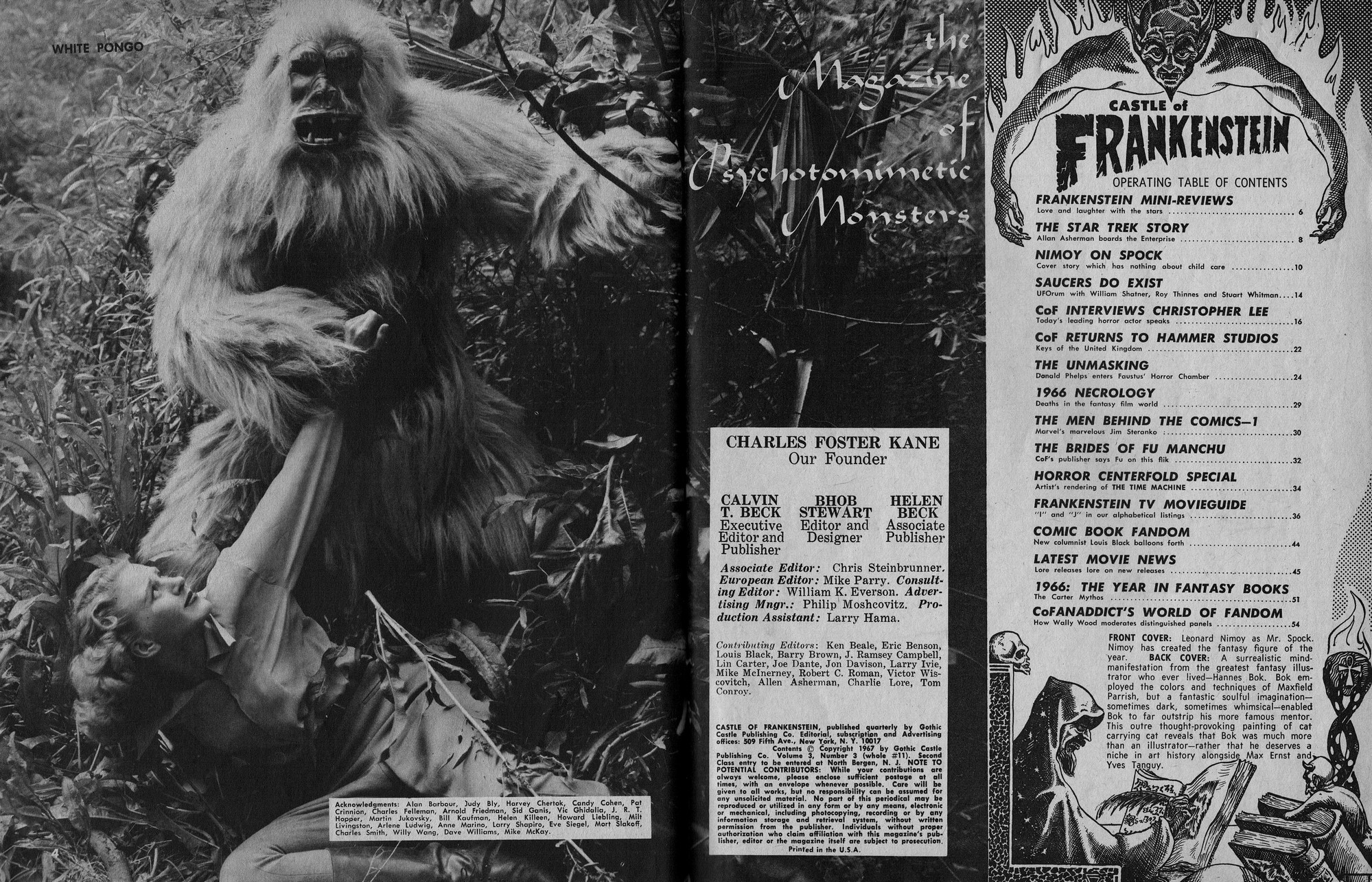Issue 11 of Castle of Frankenstein, "The Magazine of Psychotomimetic Monsters," is glowing with monster-goodness. Start with a little-seen Dracula photo for the front-inside cover and end with a back-inside cover with Raquel Welch and a T-Rex, then in-between add: The Star Trek Story by Allan Asherman, an endorsement for Star Trek, "the best dramatic TV series ever made," and part two of Christopher Lee's interview. There's more! CoF returns to Hammer Studios, Donald Phelps praises The Horror Chamber of Dr. Faustus, and Steranko is given his due. Oh, wait, there are some topless shots (you know what I mean) of The Brides of Fu Manchu, too. Here's the comic book reader version: Download Castle of Frankenstein Issue 11