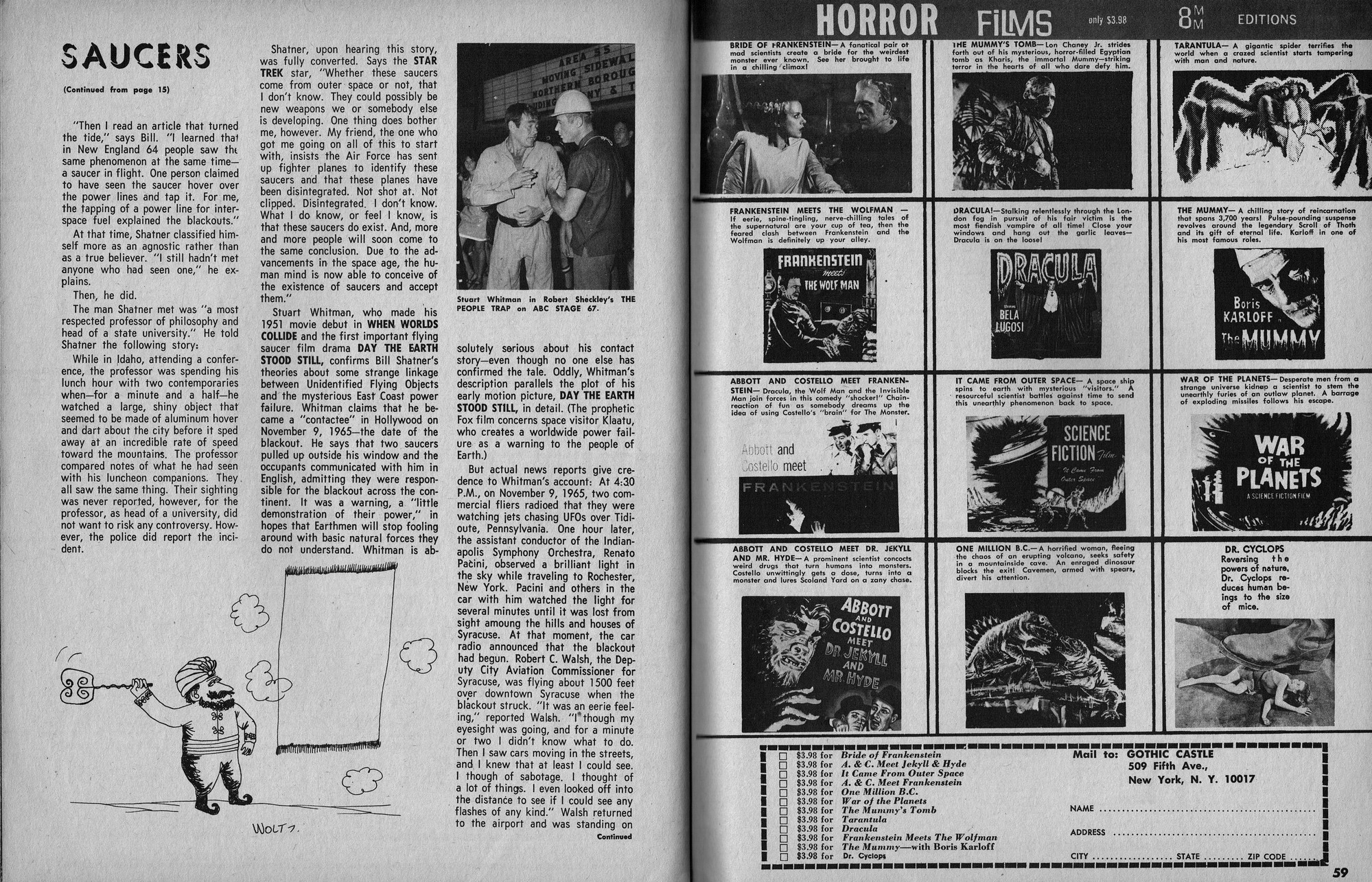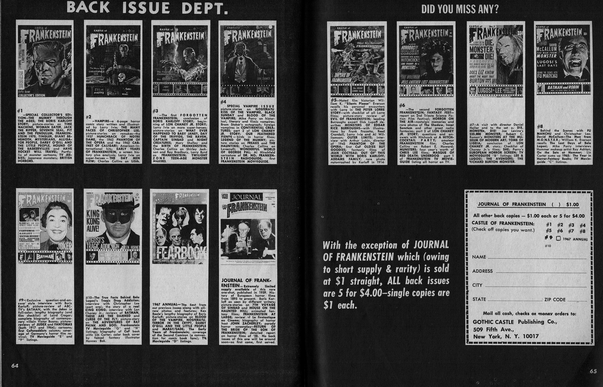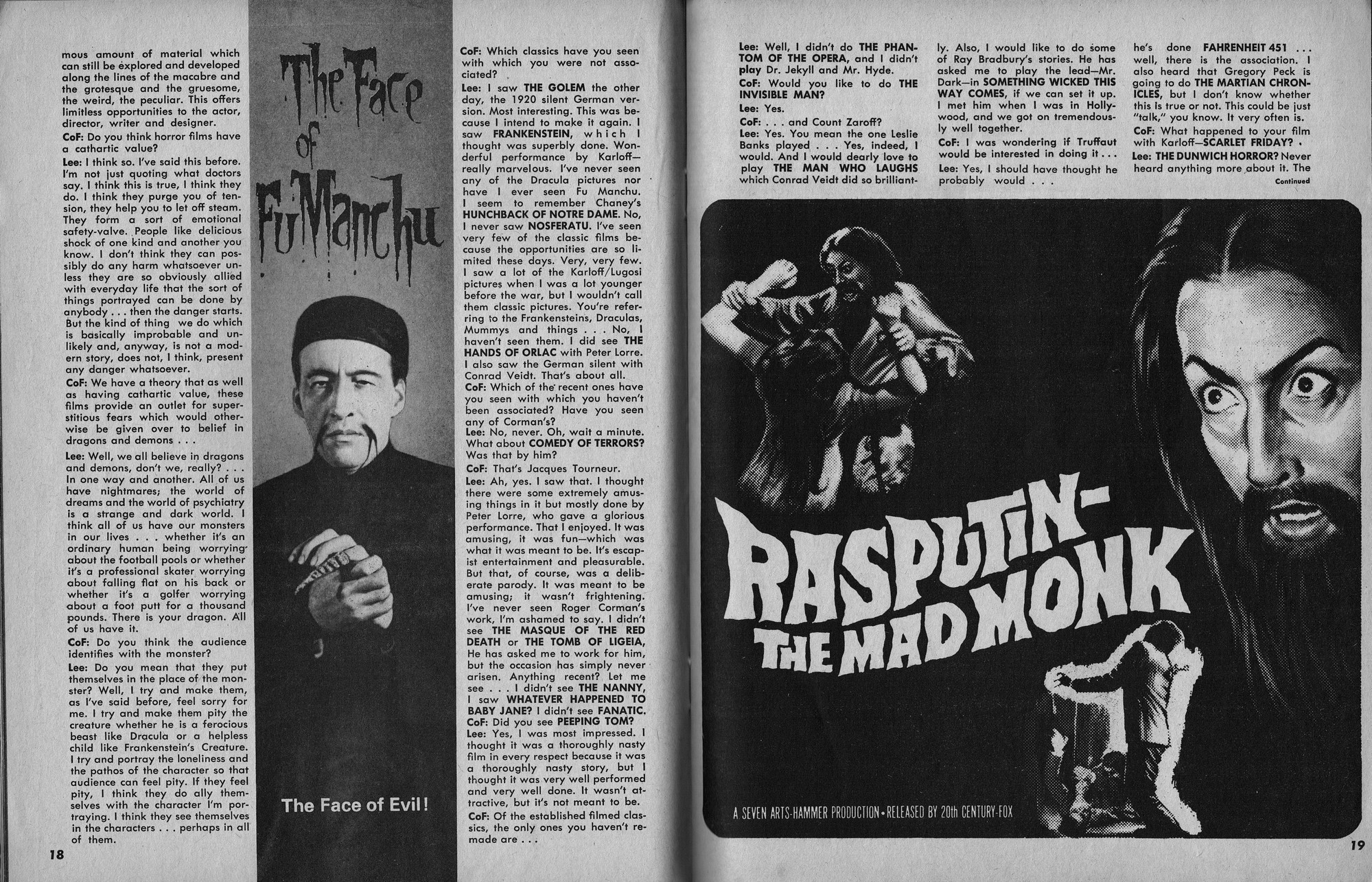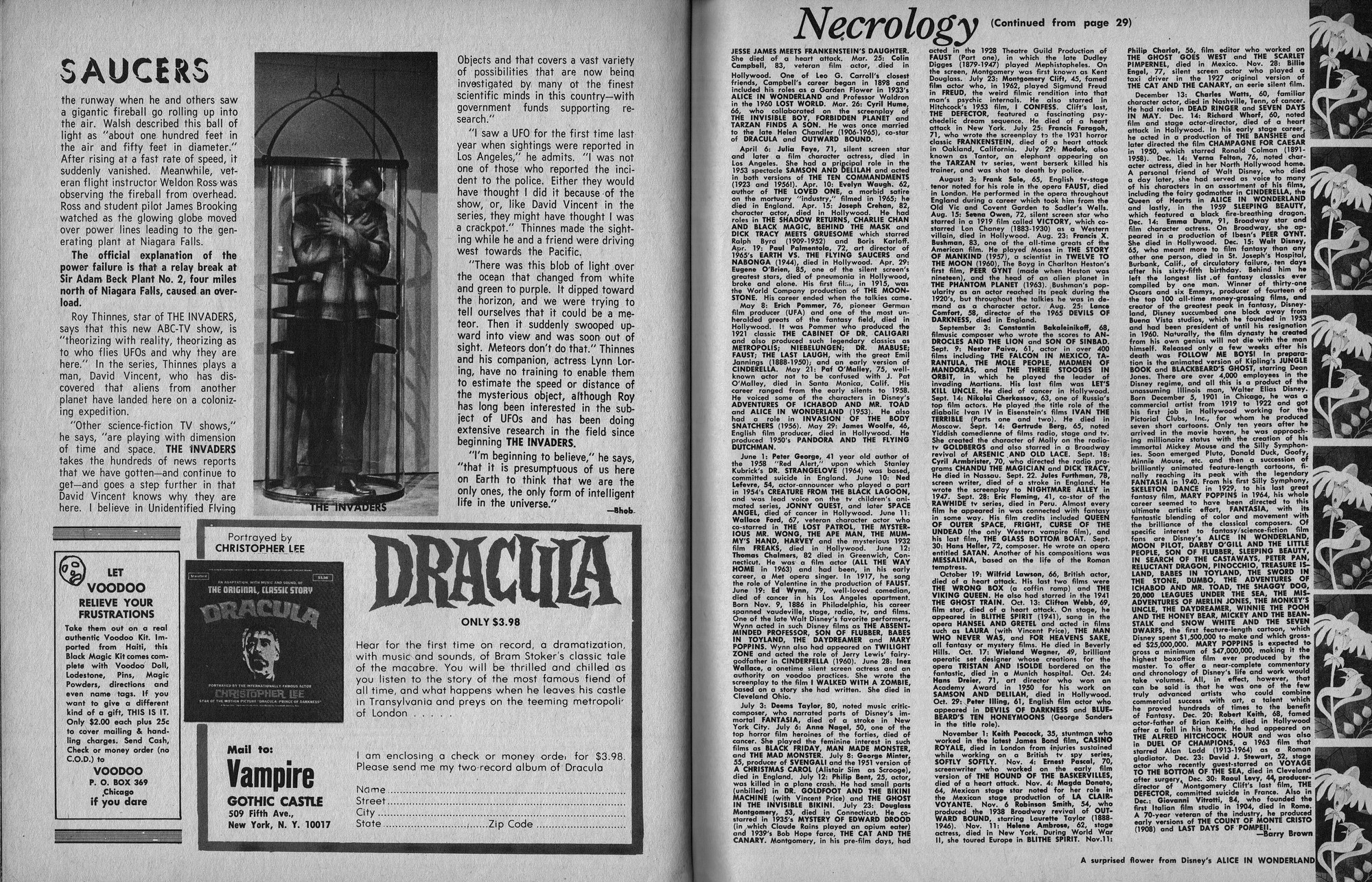 Issue 11 of Castle of Frankenstein, "The Magazine of Psychotomimetic Monsters," is glowing with monster-goodness. Start with a little-seen Dracula photo for the front-inside cover and end with a back-inside cover with Raquel Welch and a T-Rex, then in-between add: The Star Trek Story by Allan Asherman, an endorsement for Star Trek, "the best dramatic TV series ever made," and part two of Christopher Lee's interview. There's more! CoF returns to Hammer Studios, Donald Phelps praises The Horror Chamber of Dr. Faustus, and Steranko is given his due. Oh, wait, there are some topless shots (you know what I mean) of The Brides of Fu Manchu, too. Here's the comic book reader version: Download Castle of Frankenstein Issue 11