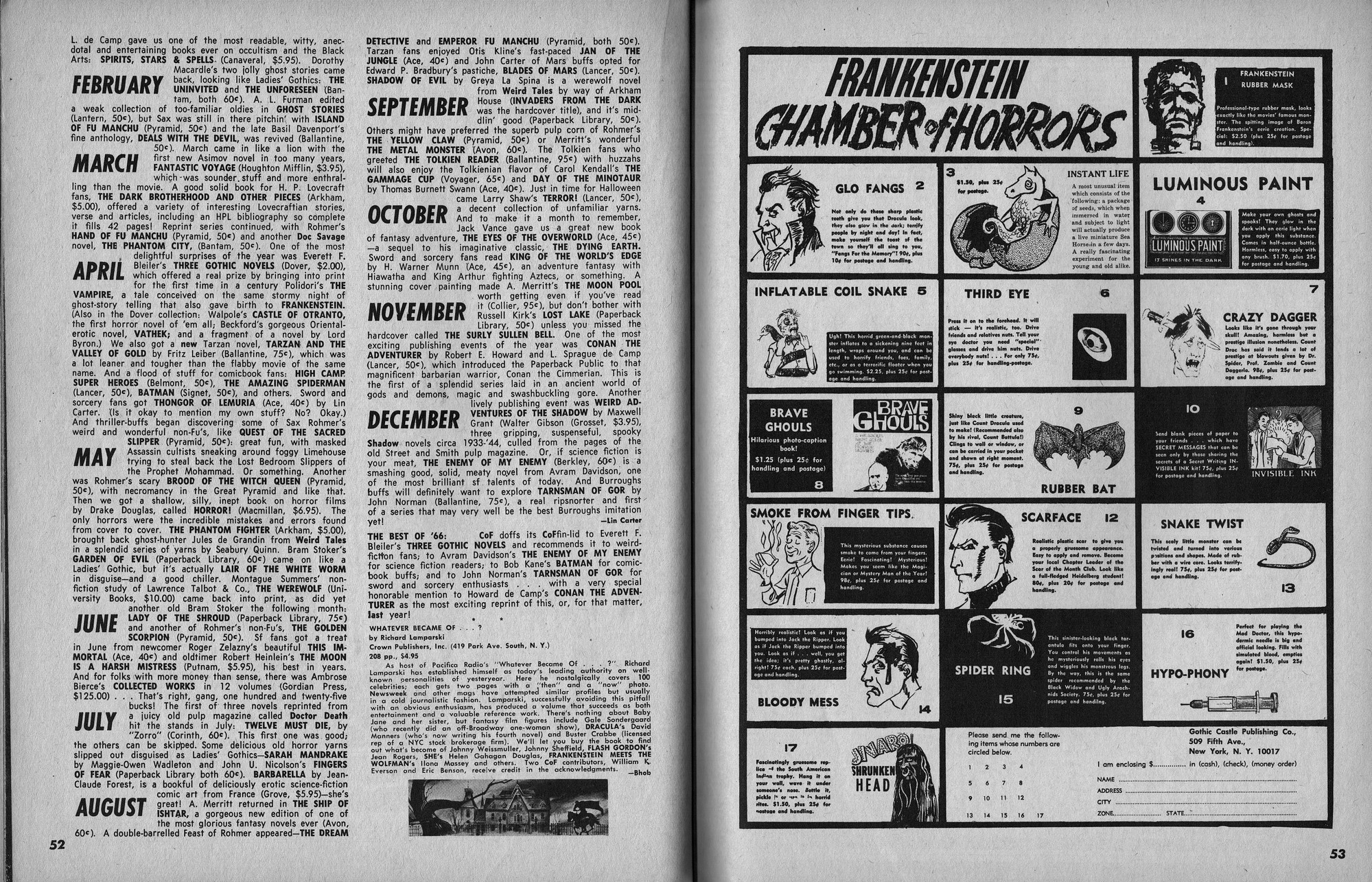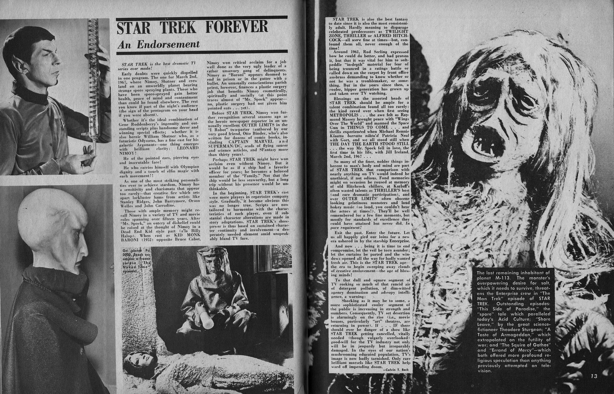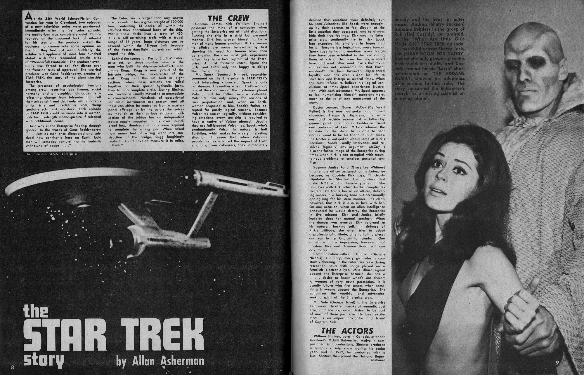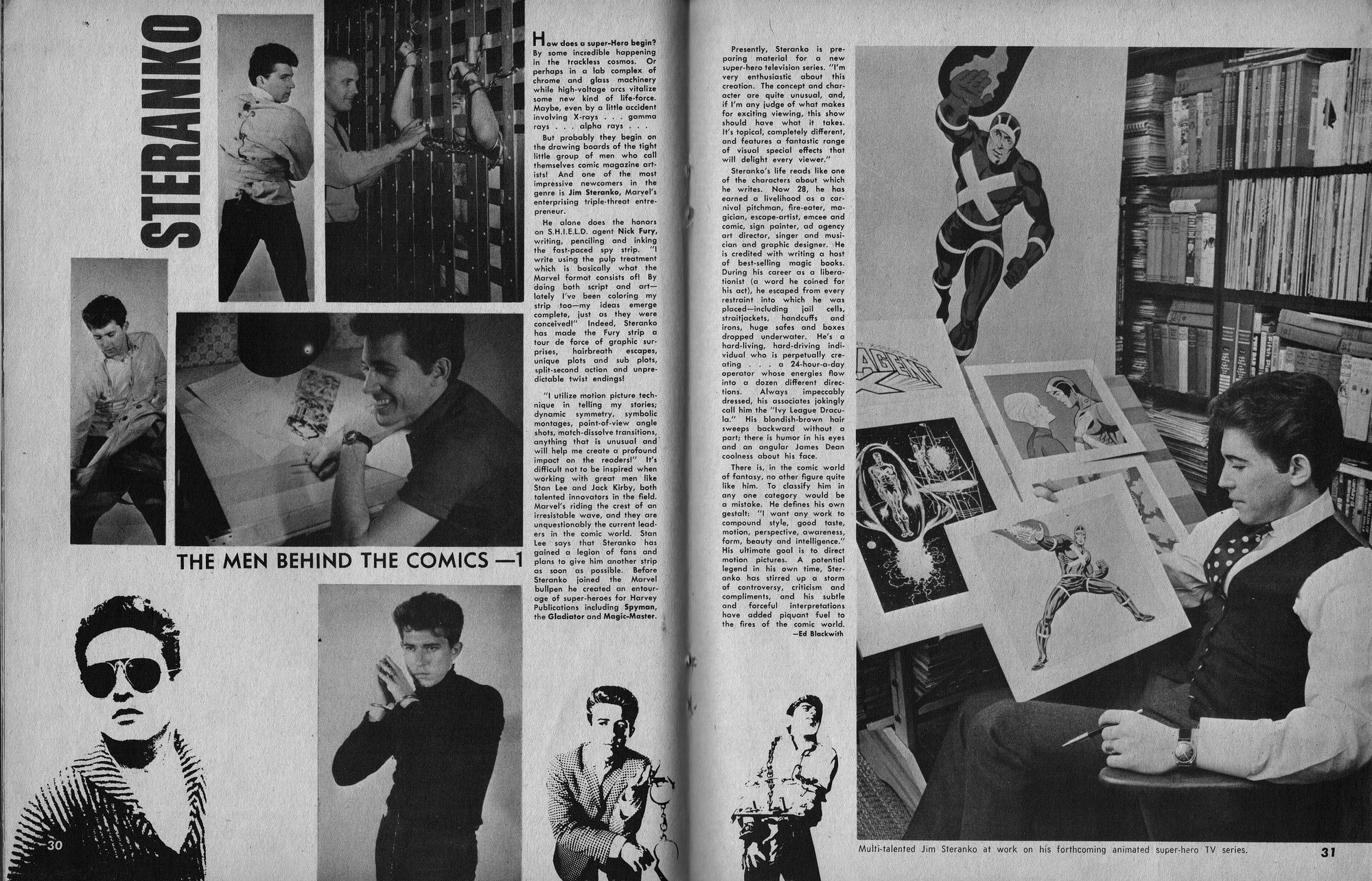 Issue 11 of Castle of Frankenstein, "The Magazine of Psychotomimetic Monsters," is glowing with monster-goodness. Start with a little-seen Dracula photo for the front-inside cover and end with a back-inside cover with Raquel Welch and a T-Rex, then in-between add: The Star Trek Story by Allan Asherman, an endorsement for Star Trek, "the best dramatic TV series ever made," and part two of Christopher Lee's interview. There's more! CoF returns to Hammer Studios, Donald Phelps praises The Horror Chamber of Dr. Faustus, and Steranko is given his due. Oh, wait, there are some topless shots (you know what I mean) of The Brides of Fu Manchu, too. Here's the comic book reader version: Download Castle of Frankenstein Issue 11
