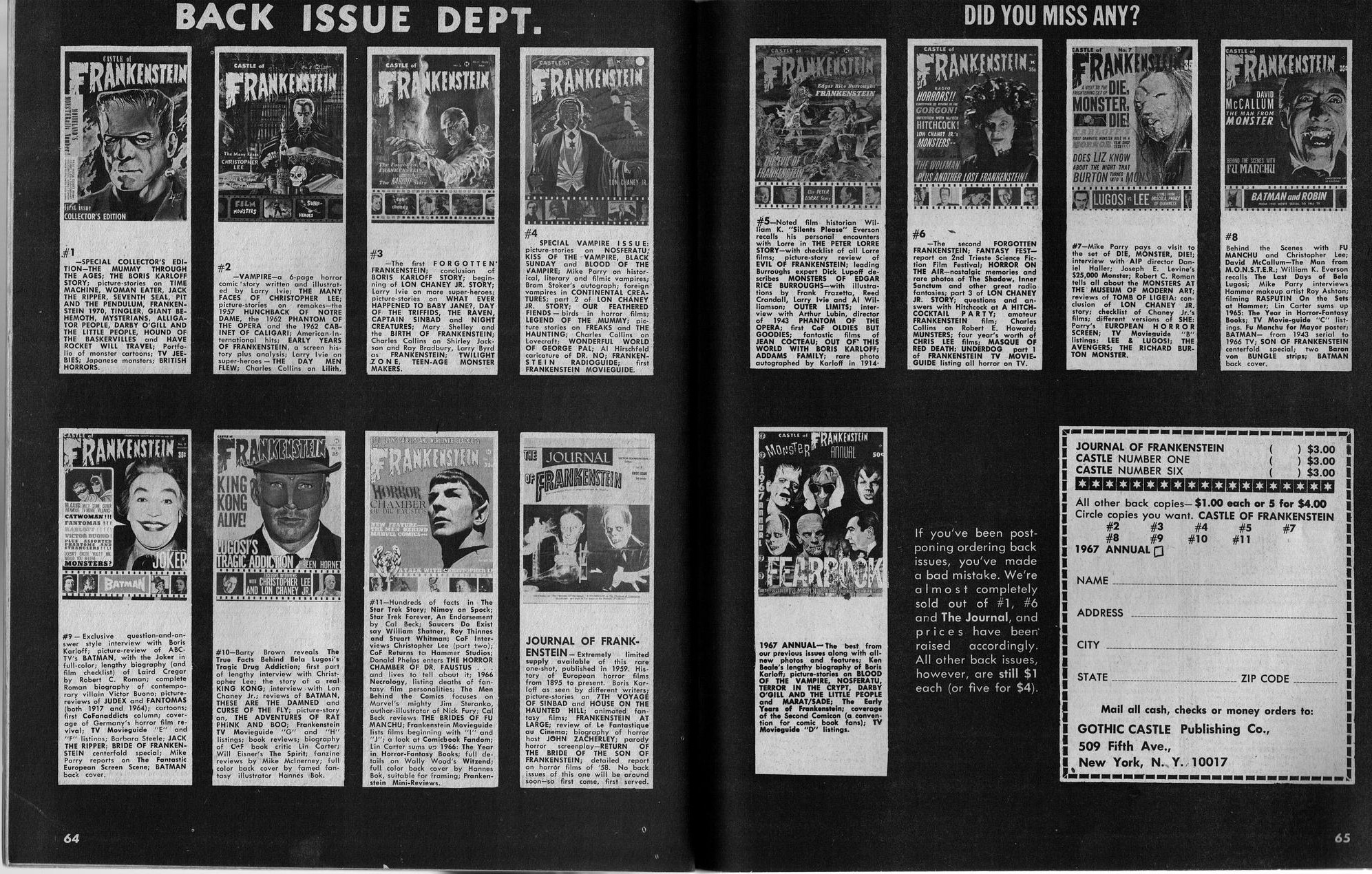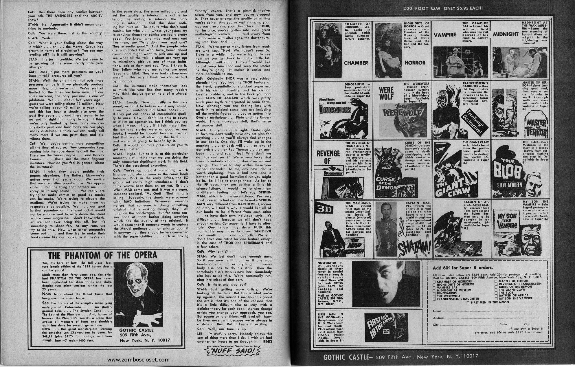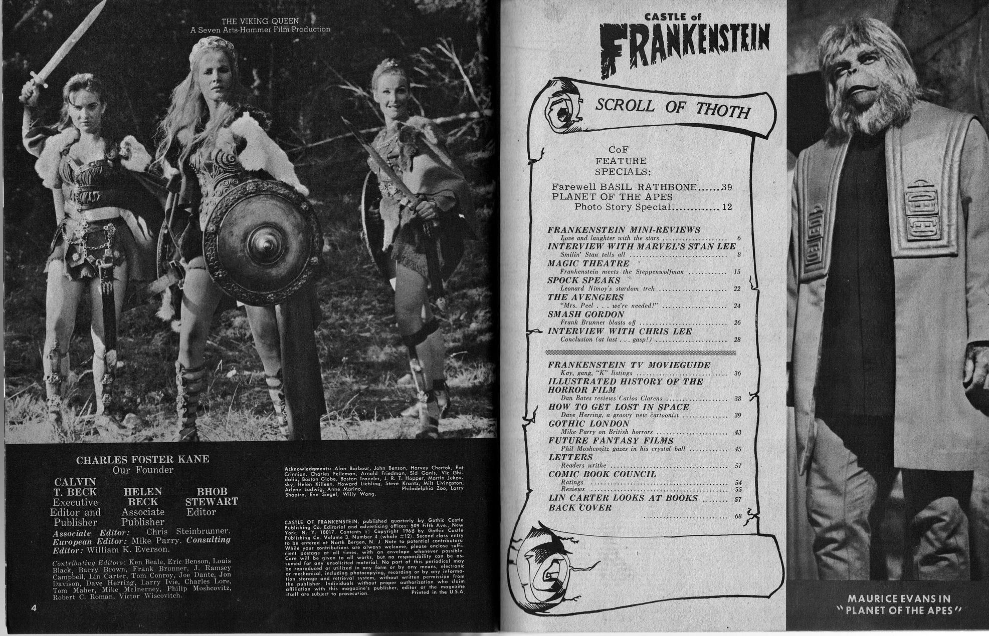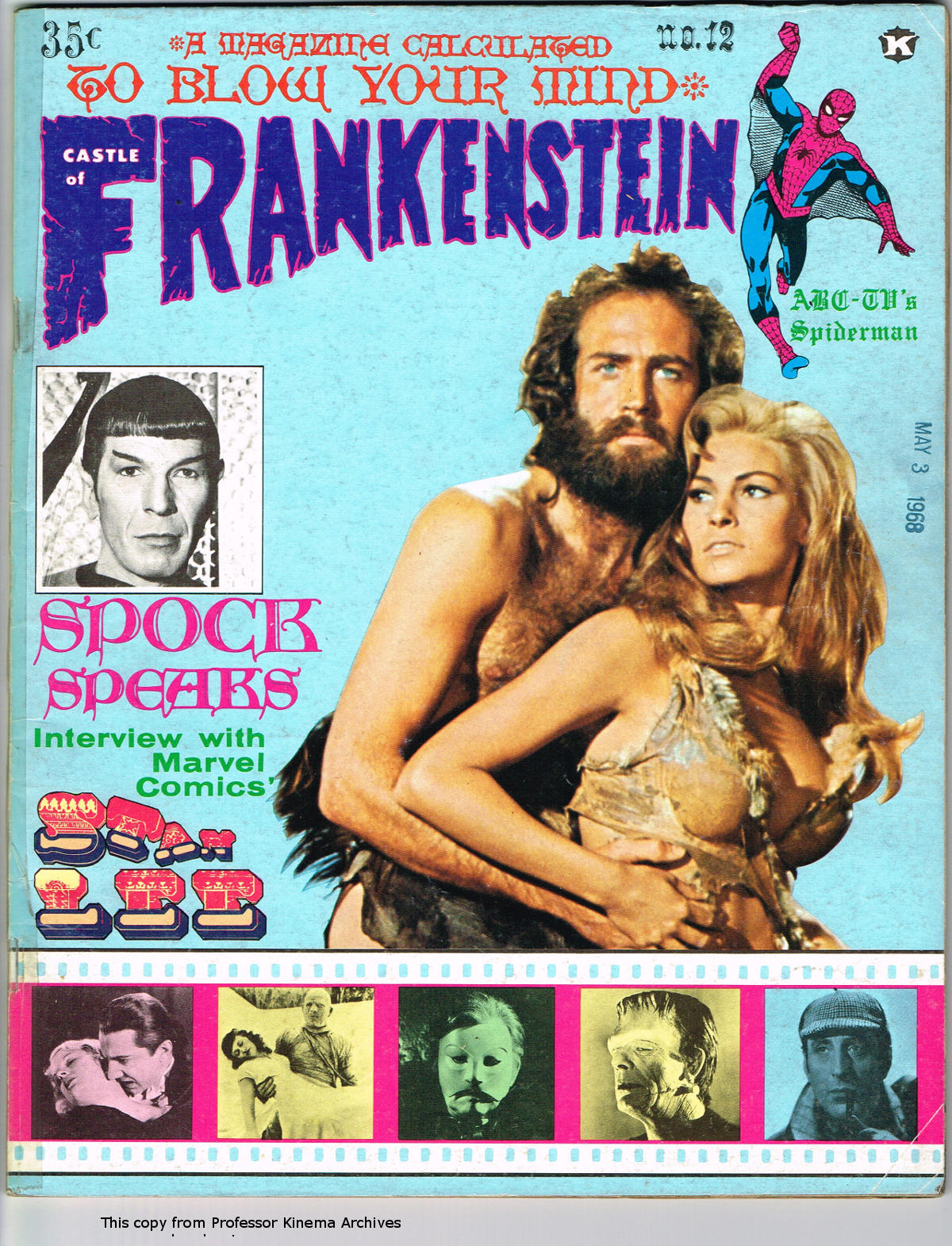 An interview with Stan Lee, The Avengers' Diana Rigg and Patrick Macnee, some comics, part three of Christopher Lee's CoF interview, and a Farewell to Basil Rathbone are highlights in this issue 12 of Castle of Frankenstein. This is the first issue to also have a page width less than 8.5 inches.