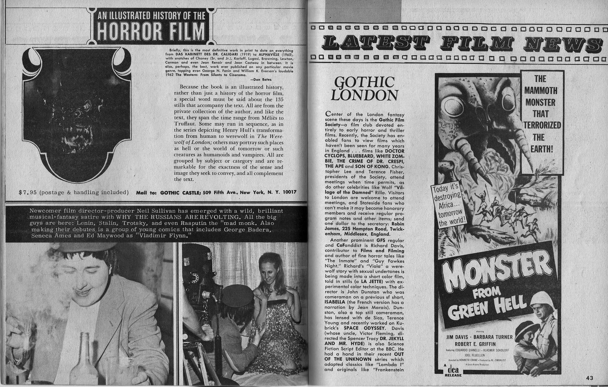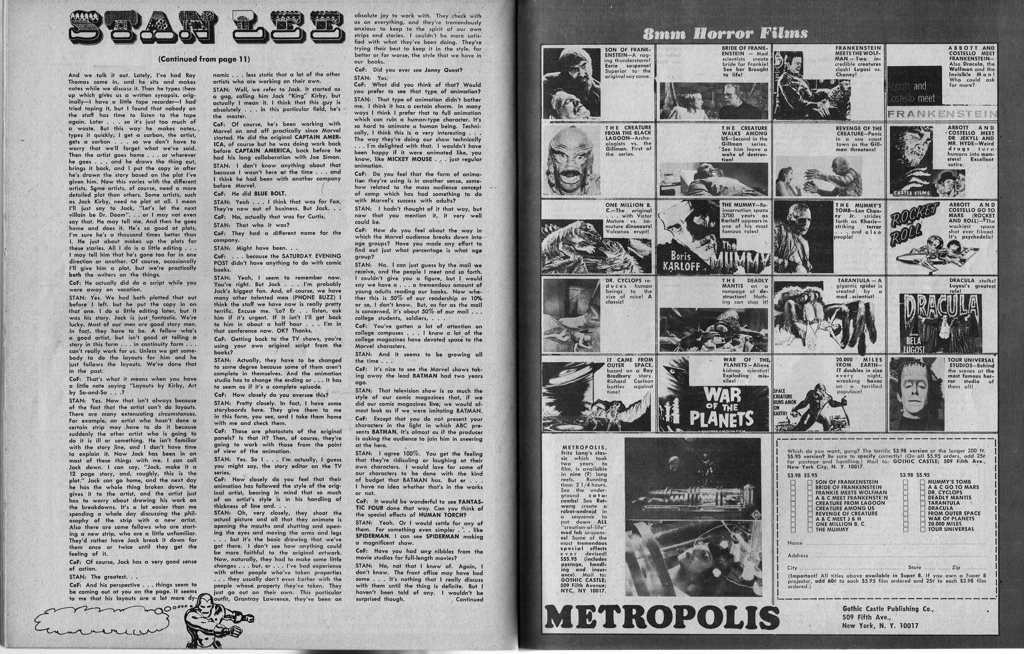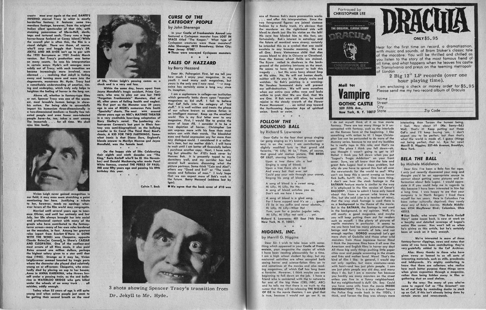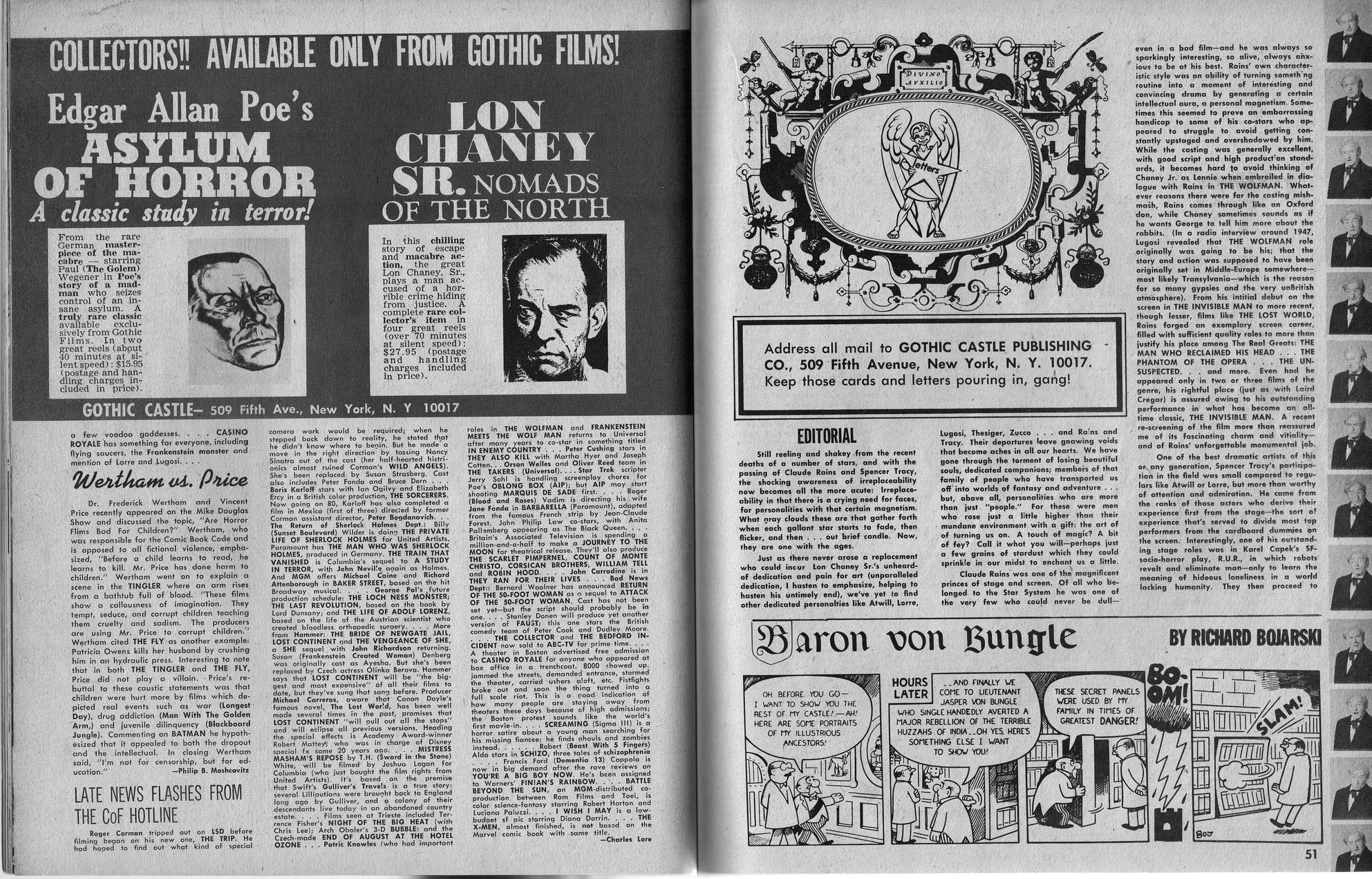 An interview with Stan Lee, The Avengers' Diana Rigg and Patrick Macnee, some comics, part three of Christopher Lee's CoF interview, and a Farewell to Basil Rathbone are highlights in this issue 12 of Castle of Frankenstein. This is the first issue to also have a page width less than 8.5 inches.