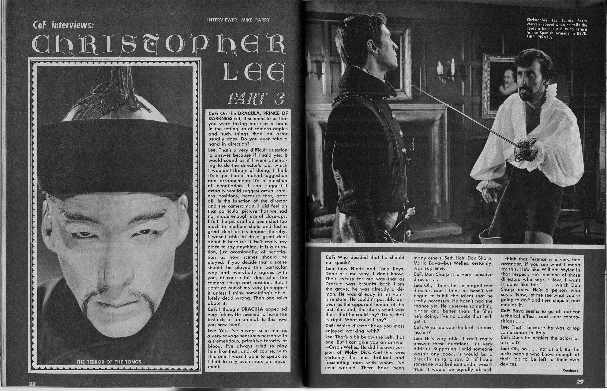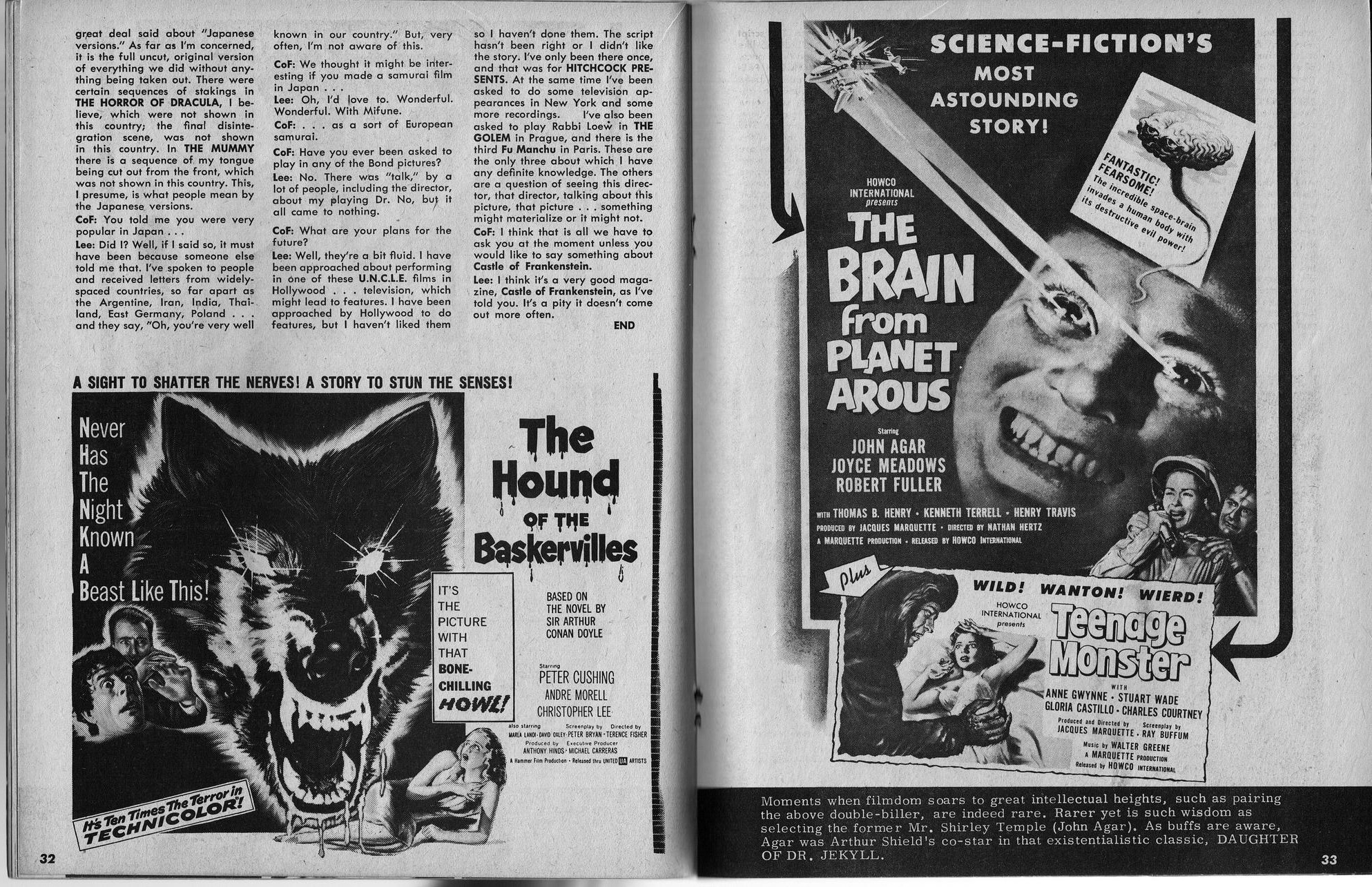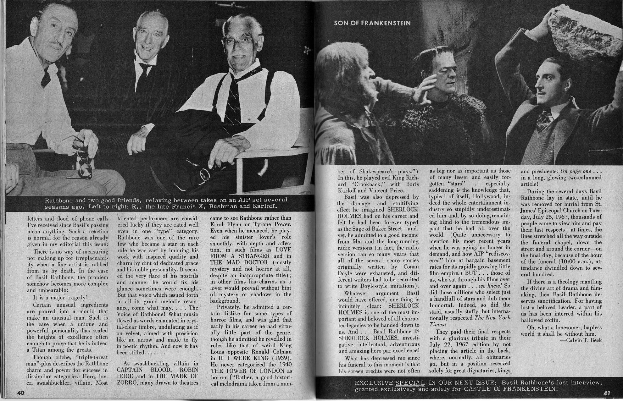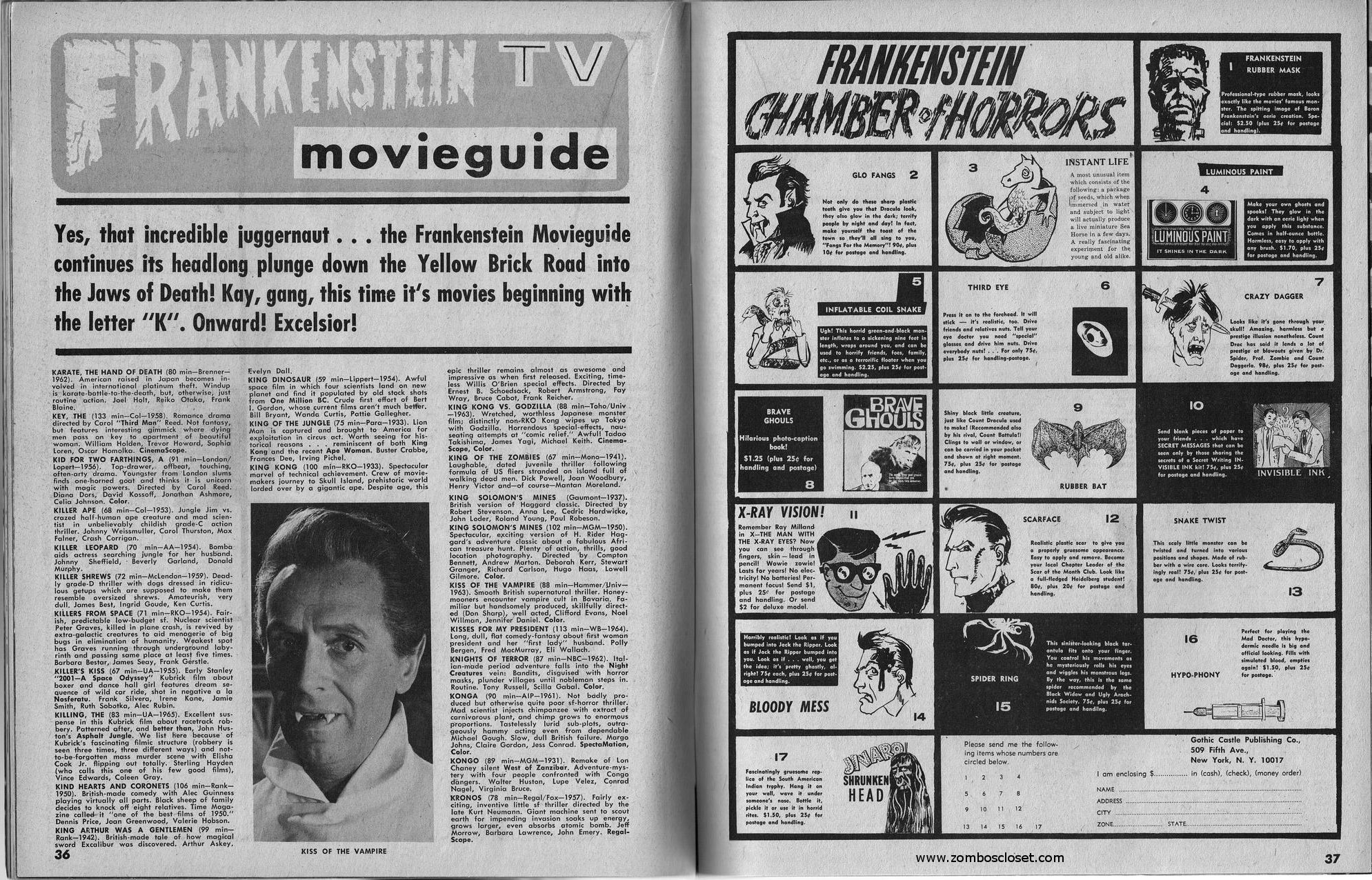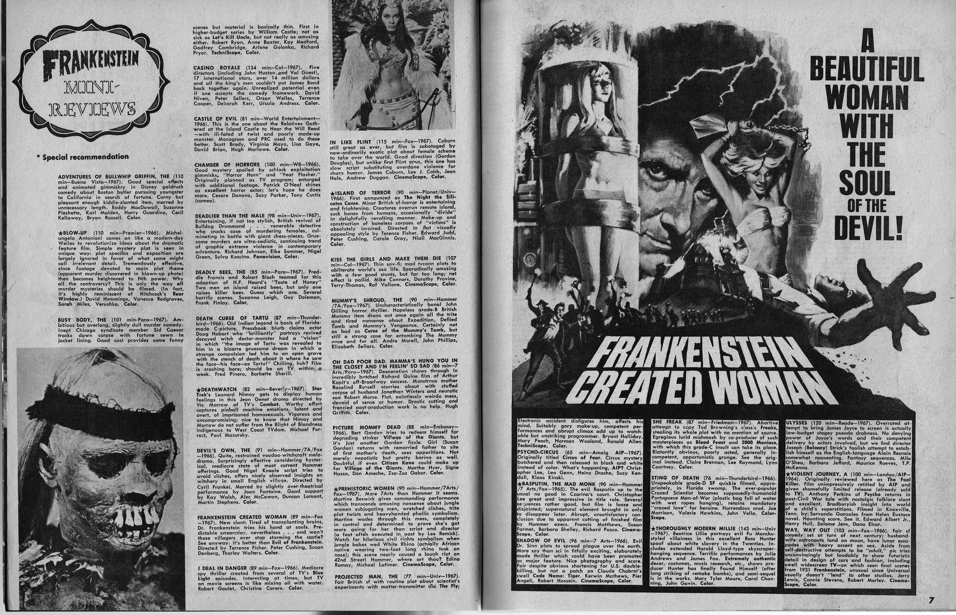 An interview with Stan Lee, The Avengers' Diana Rigg and Patrick Macnee, some comics, part three of Christopher Lee's CoF interview, and a Farewell to Basil Rathbone are highlights in this issue 12 of Castle of Frankenstein. This is the first issue to also have a page width less than 8.5 inches.