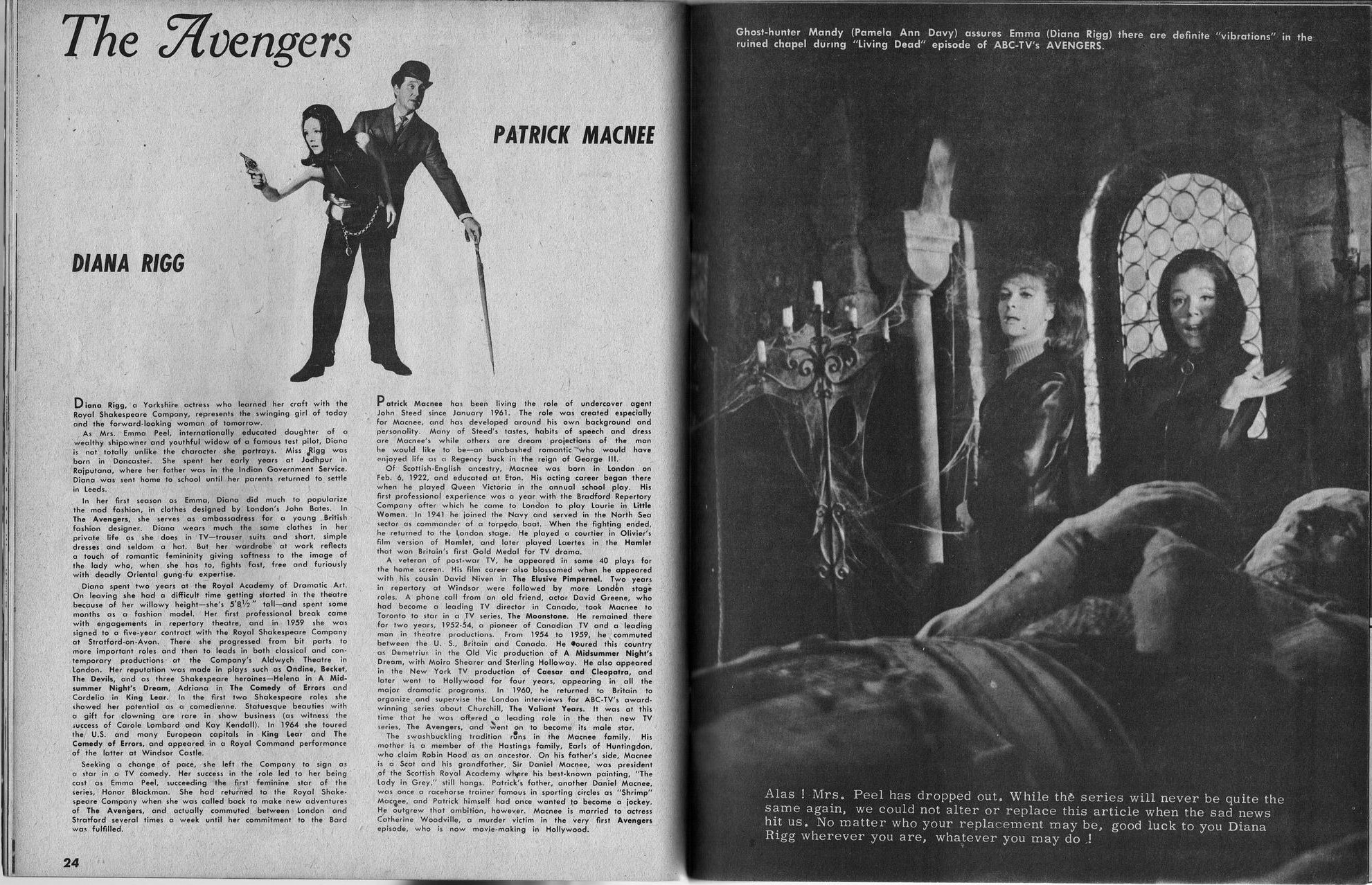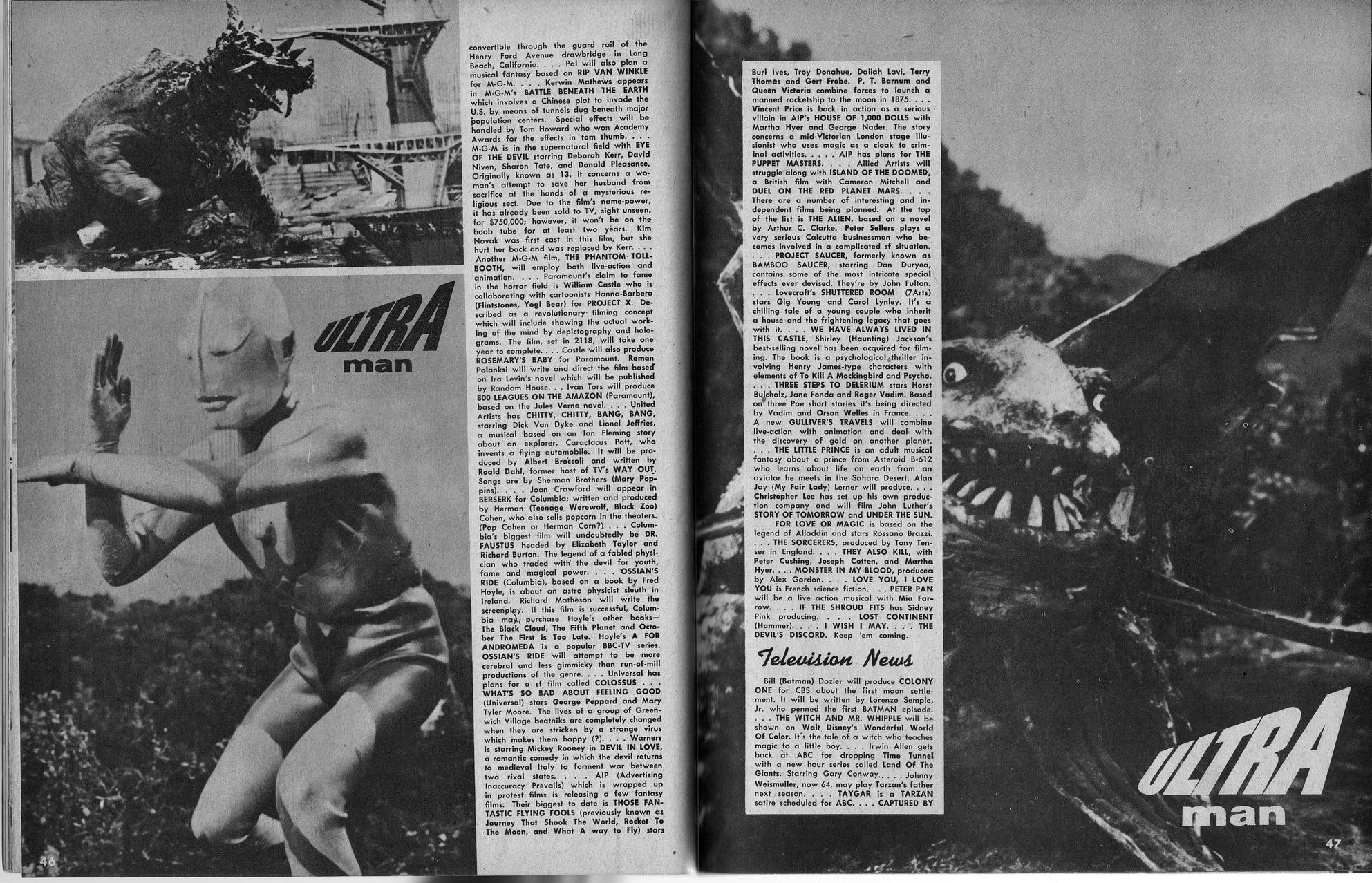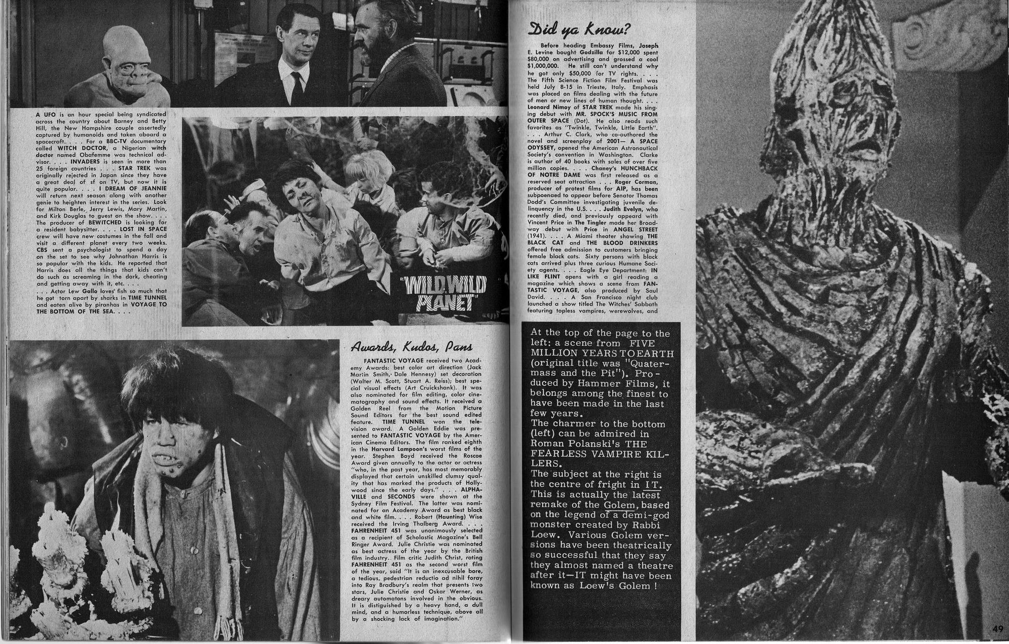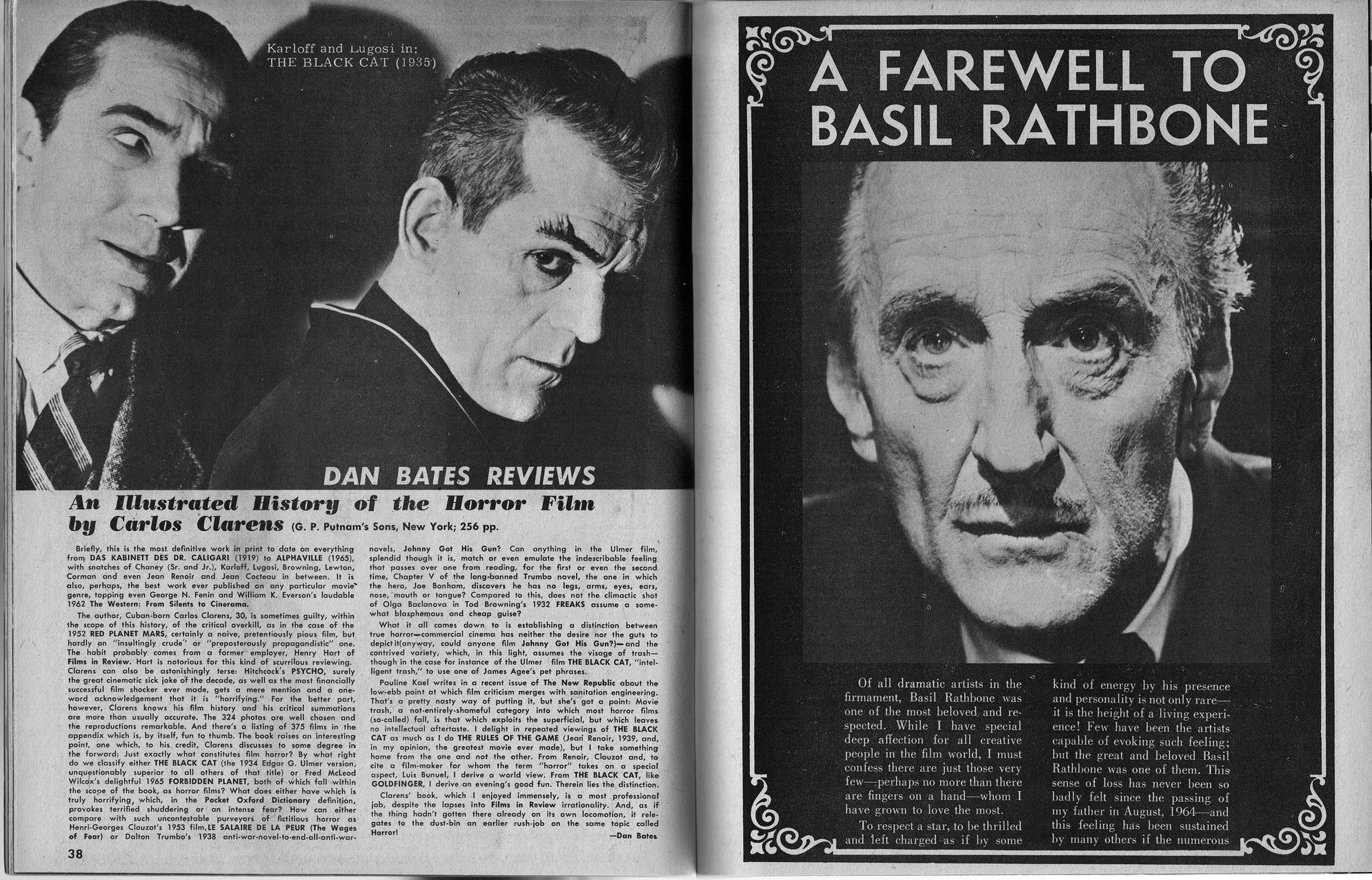 An interview with Stan Lee, The Avengers' Diana Rigg and Patrick Macnee, some comics, part three of Christopher Lee's CoF interview, and a Farewell to Basil Rathbone are highlights in this issue 12 of Castle of Frankenstein. This is the first issue to also have a page width less than 8.5 inches.