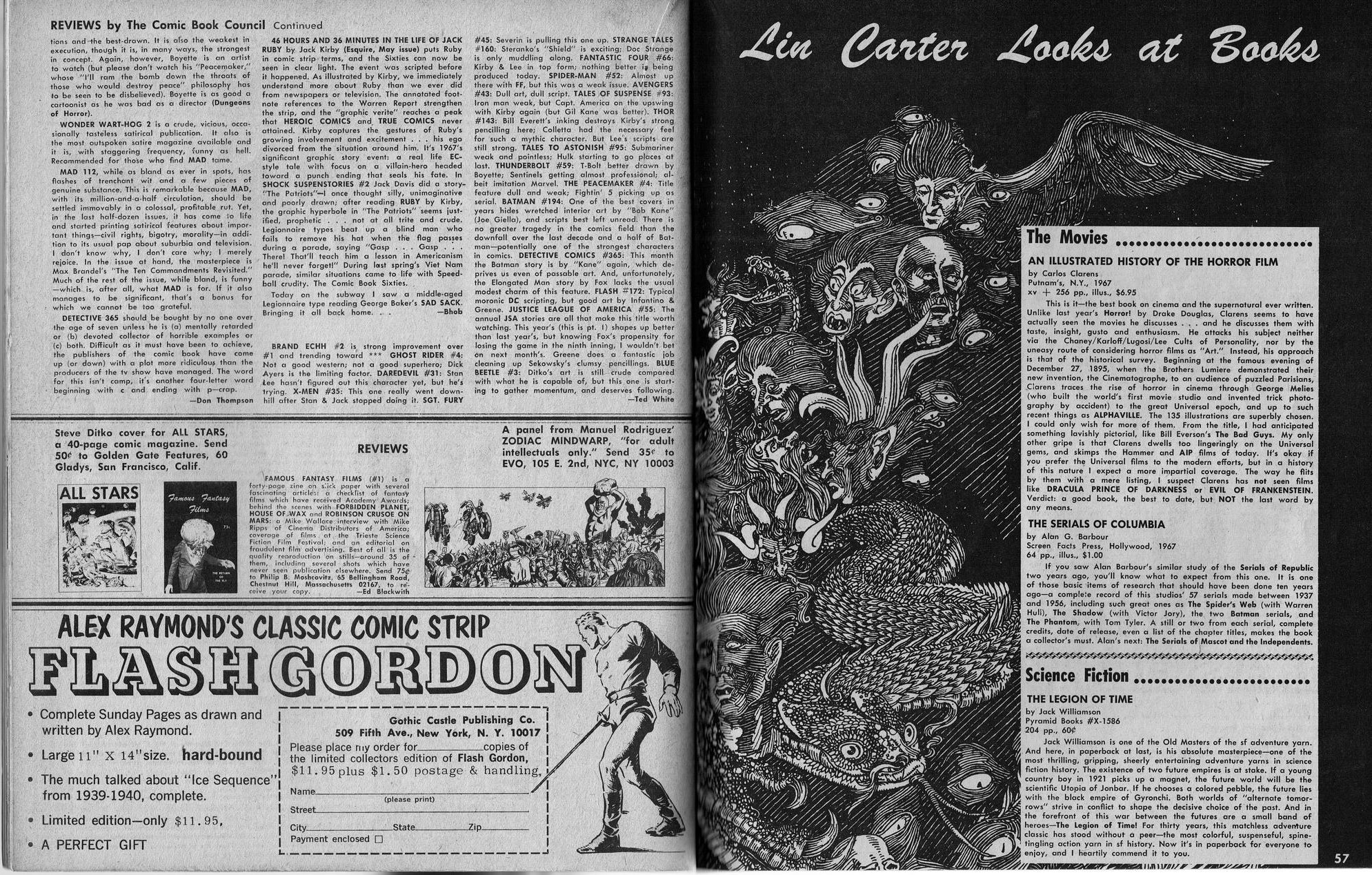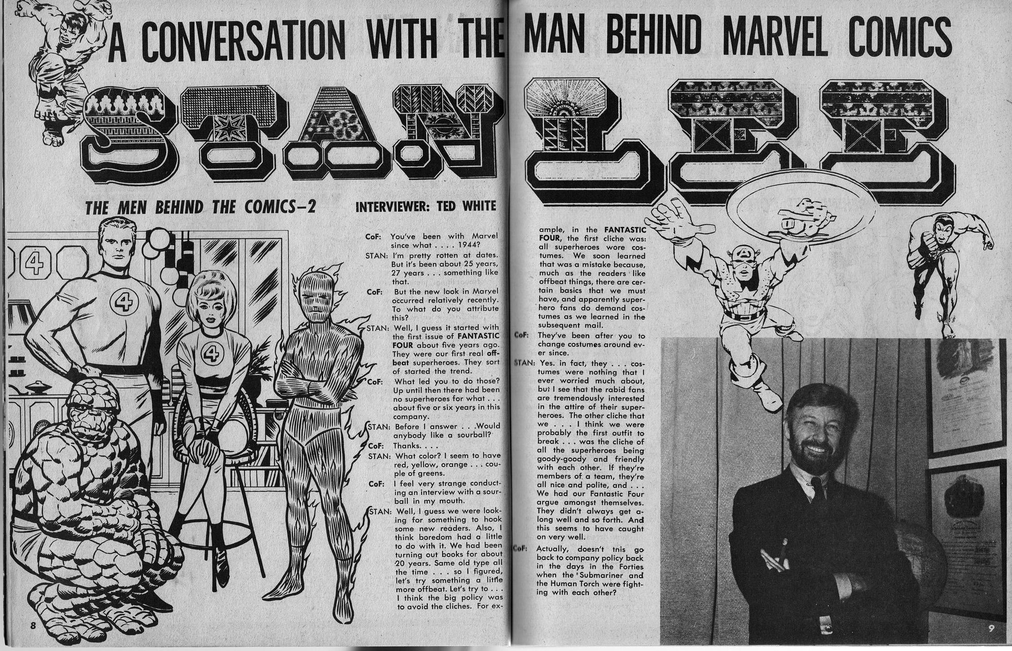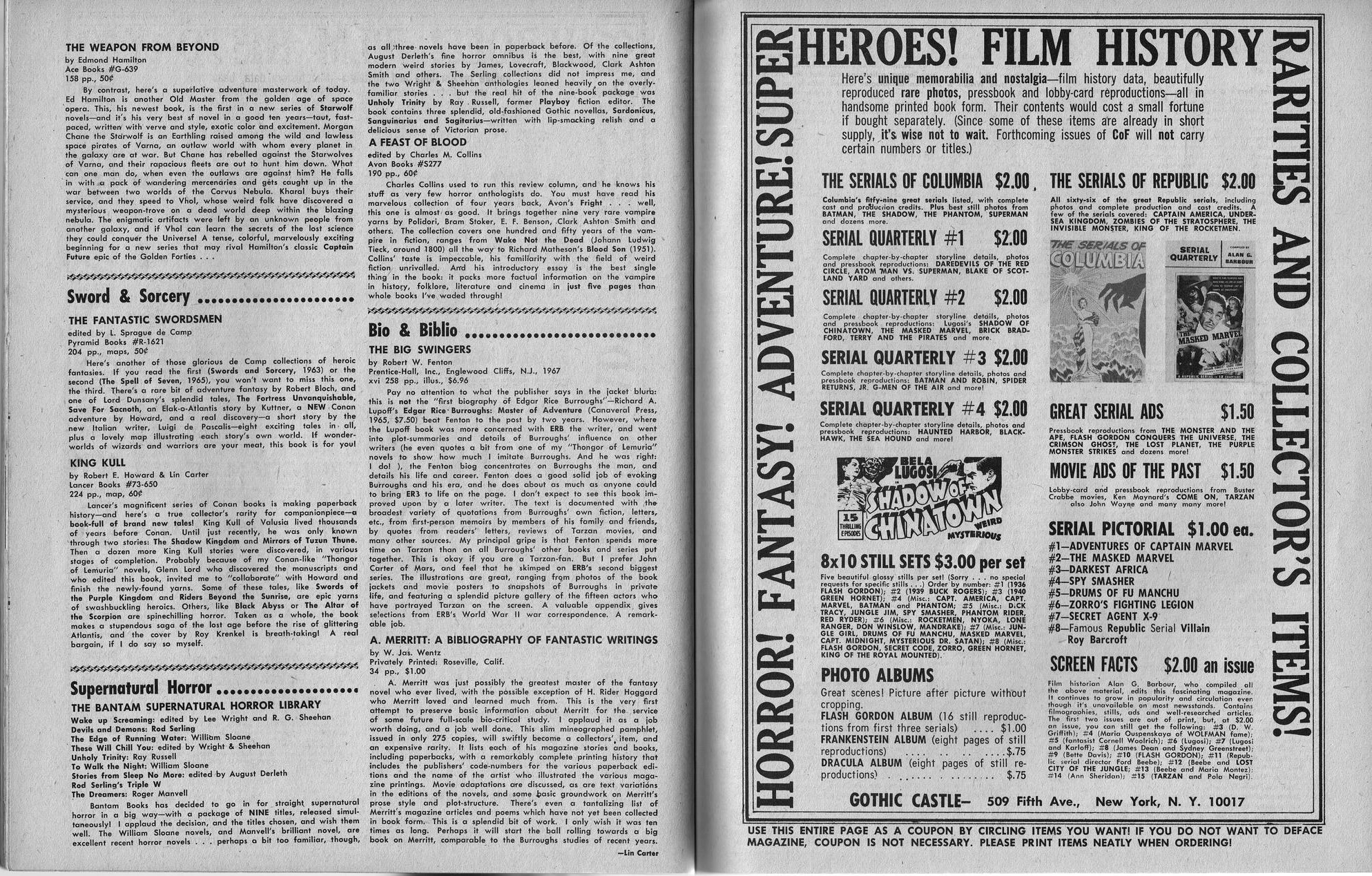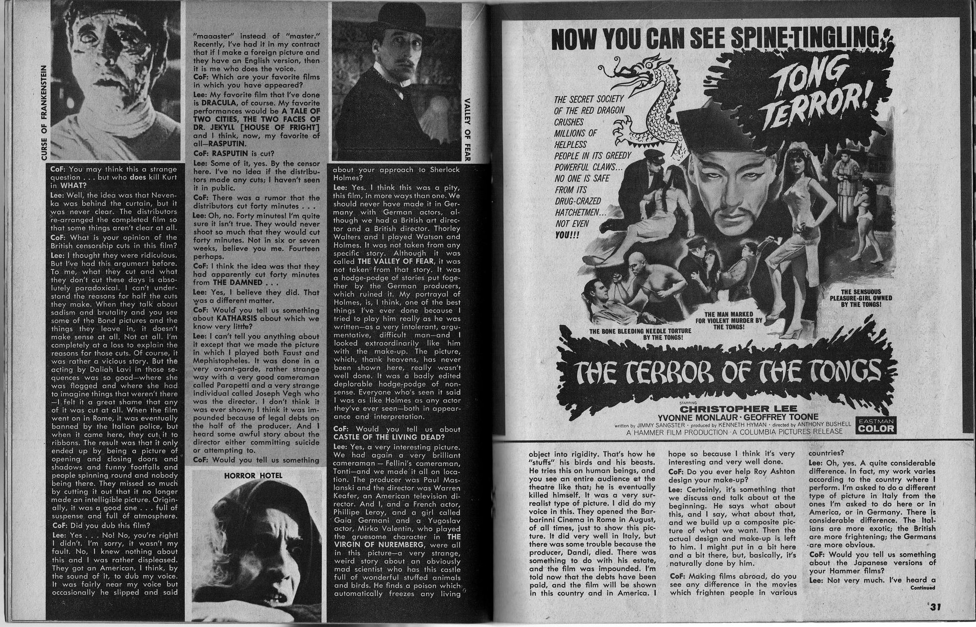 An interview with Stan Lee, The Avengers' Diana Rigg and Patrick Macnee, some comics, part three of Christopher Lee's CoF interview, and a Farewell to Basil Rathbone are highlights in this issue 12 of Castle of Frankenstein. This is the first issue to also have a page width less than 8.5 inches.