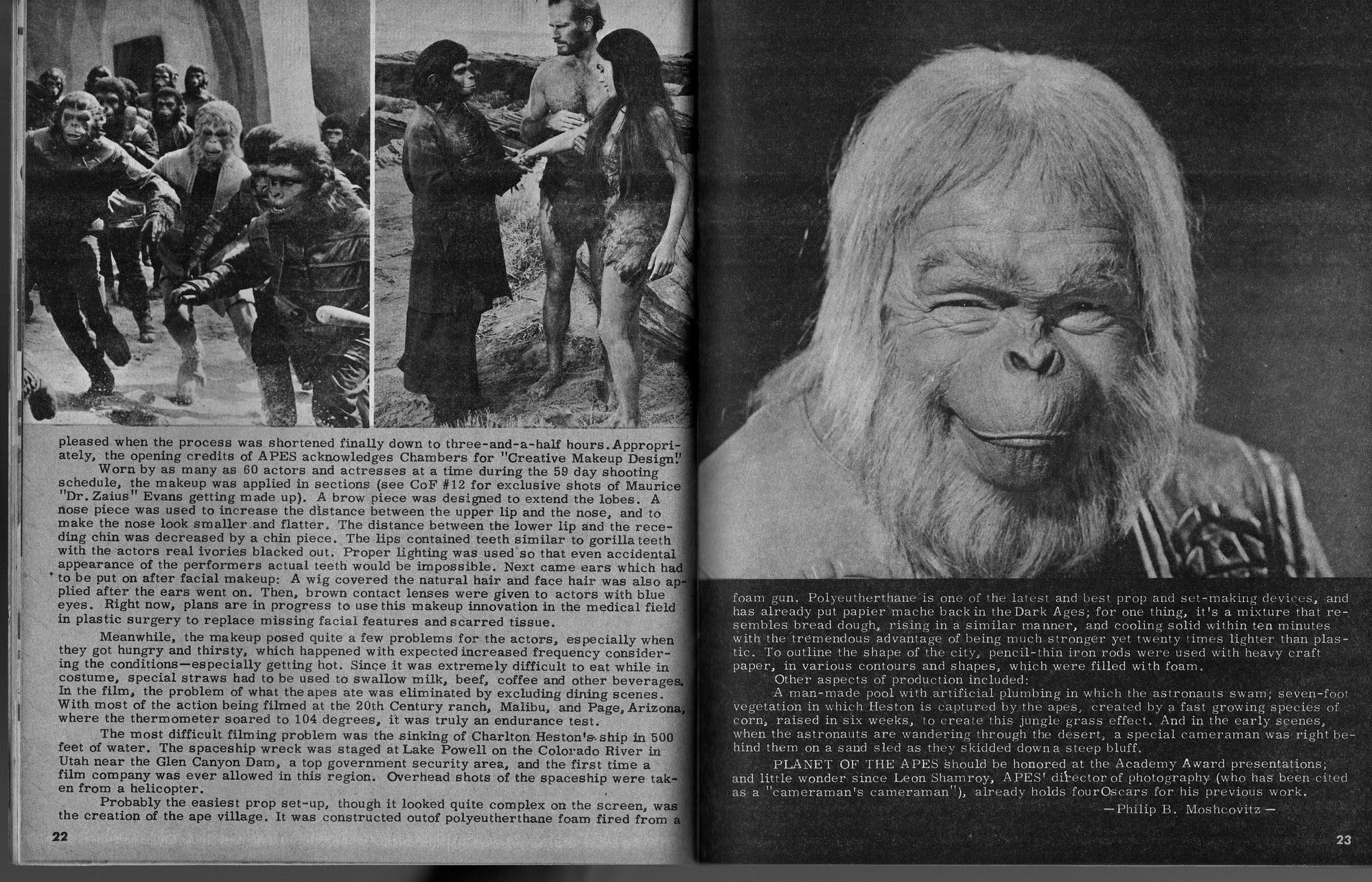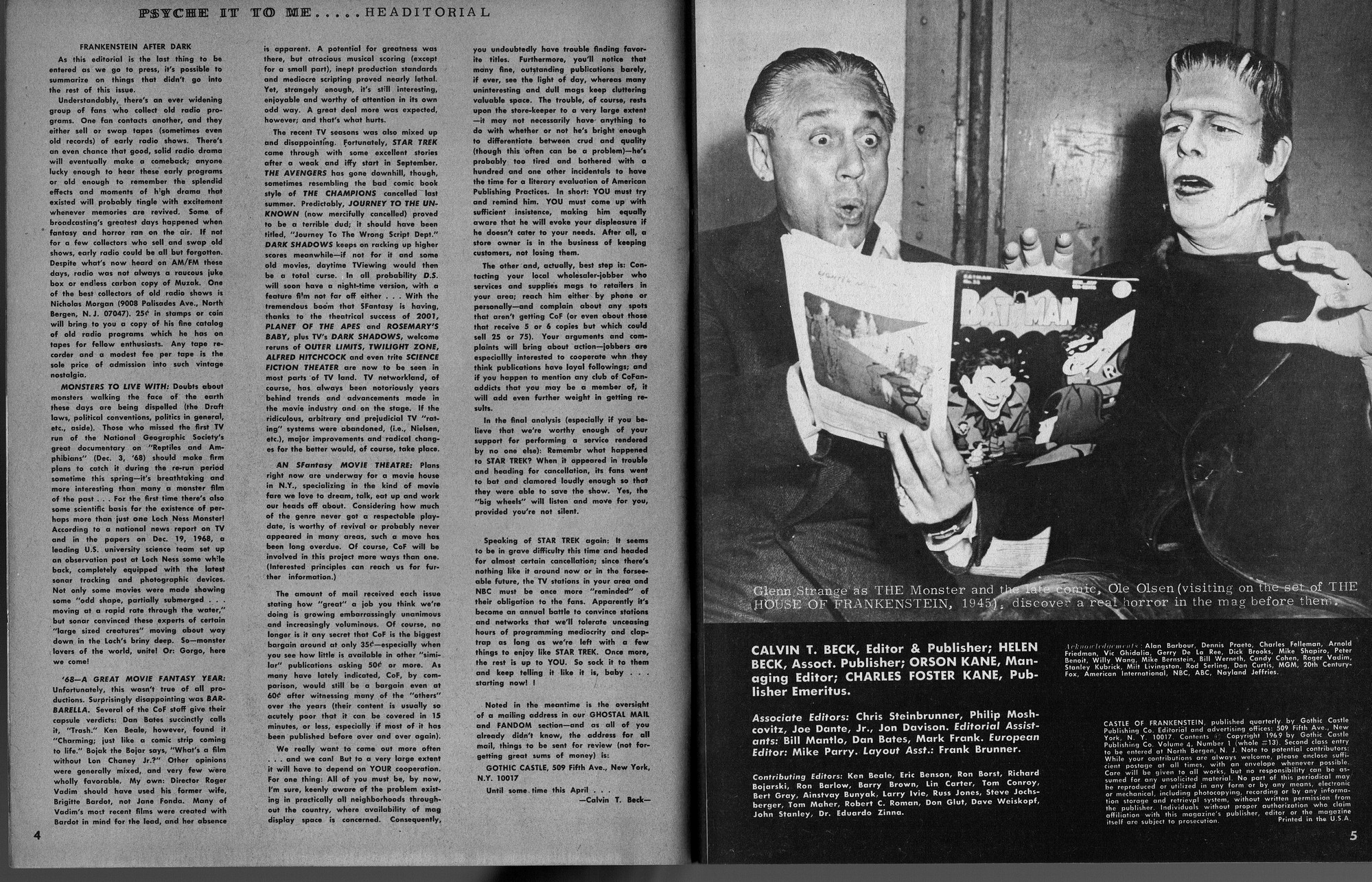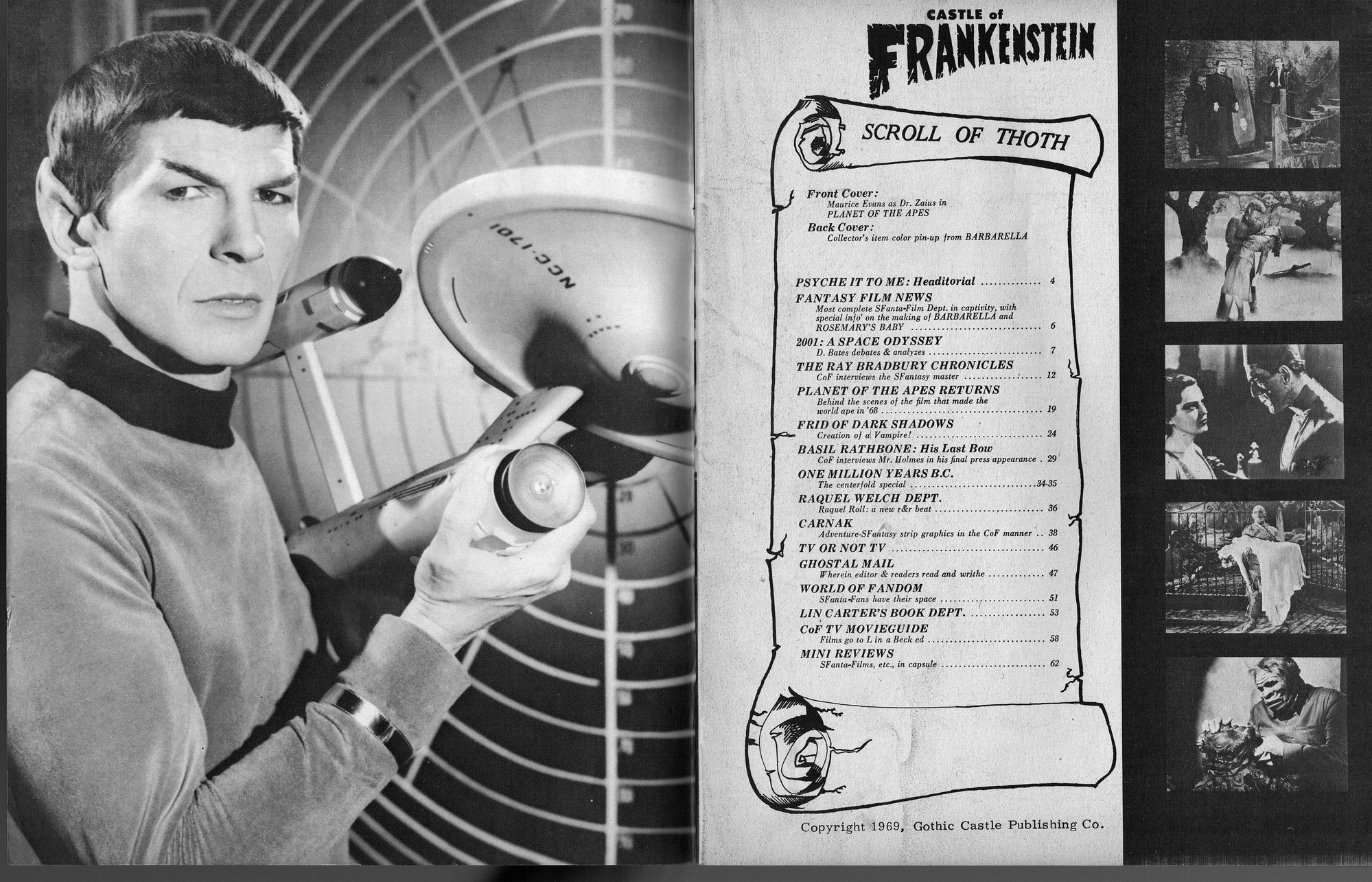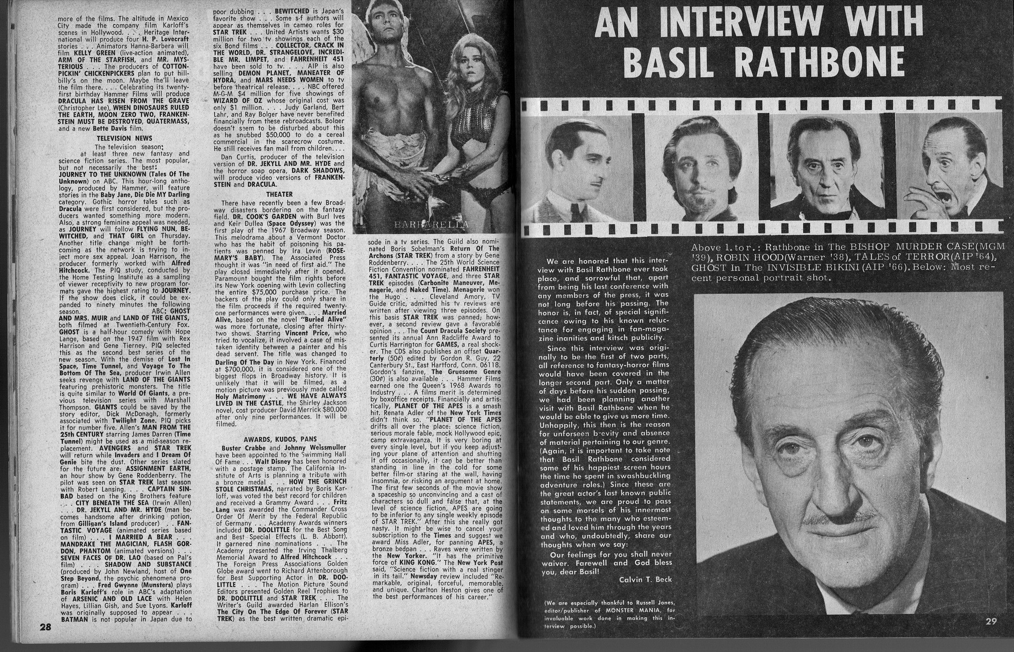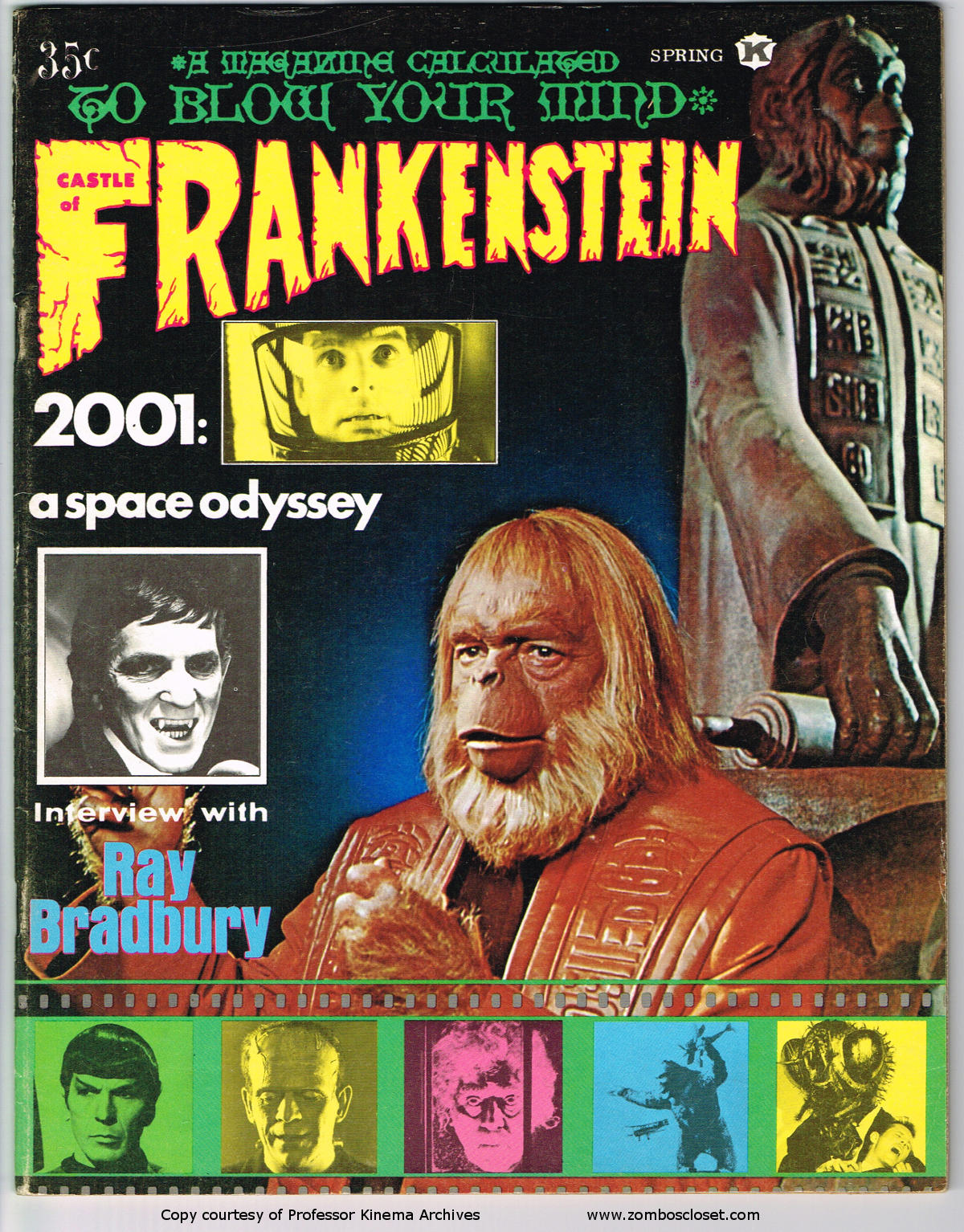 With Some Thoughts on Kubrick's 2001: A Space Odyssey, John Stanley's Interview with Ray Bradbury, and How They Filmed The Planet of the Apes, this would be a great issue already, but there's more. There's also An Interview With Basil Rathbone, fan magazines reviewed, and a fun on the set picture with Glenn Strange and comedian Ole Olsen on page 5. Here's the comic book reader version:  Download Castle of Frankenstein Issue 13