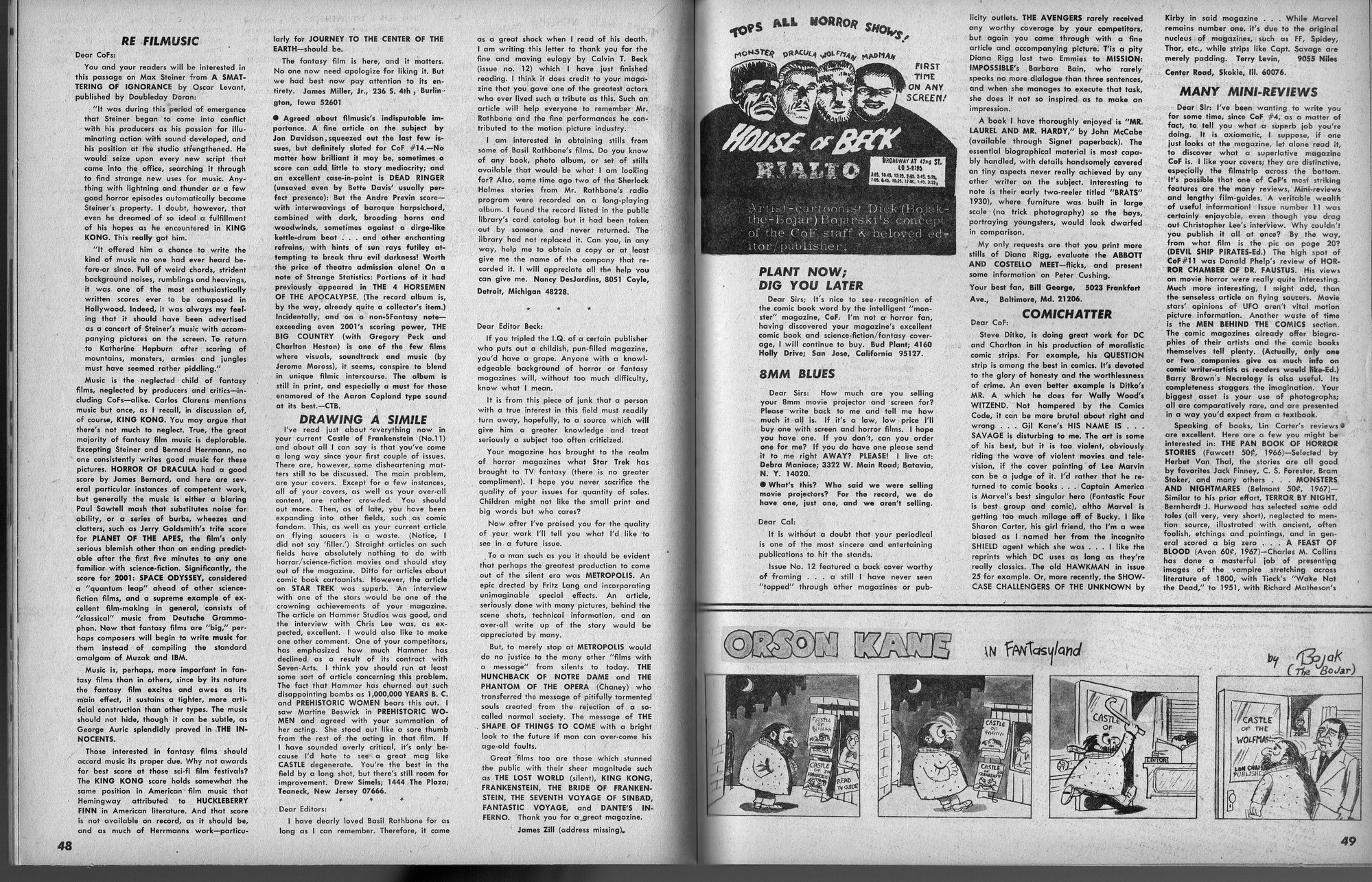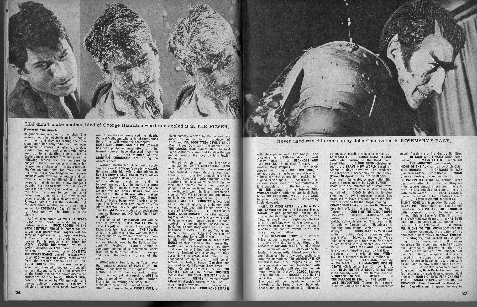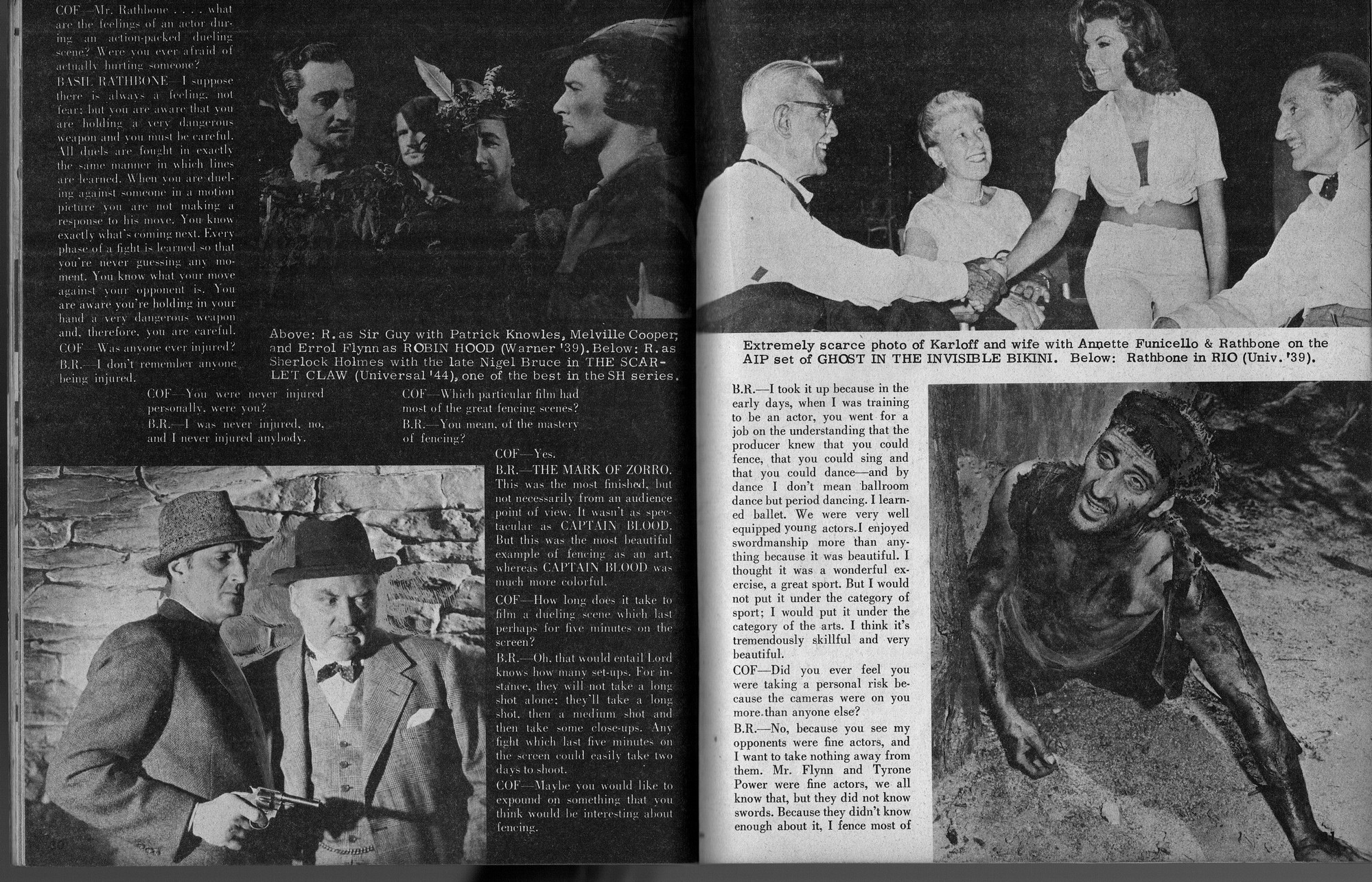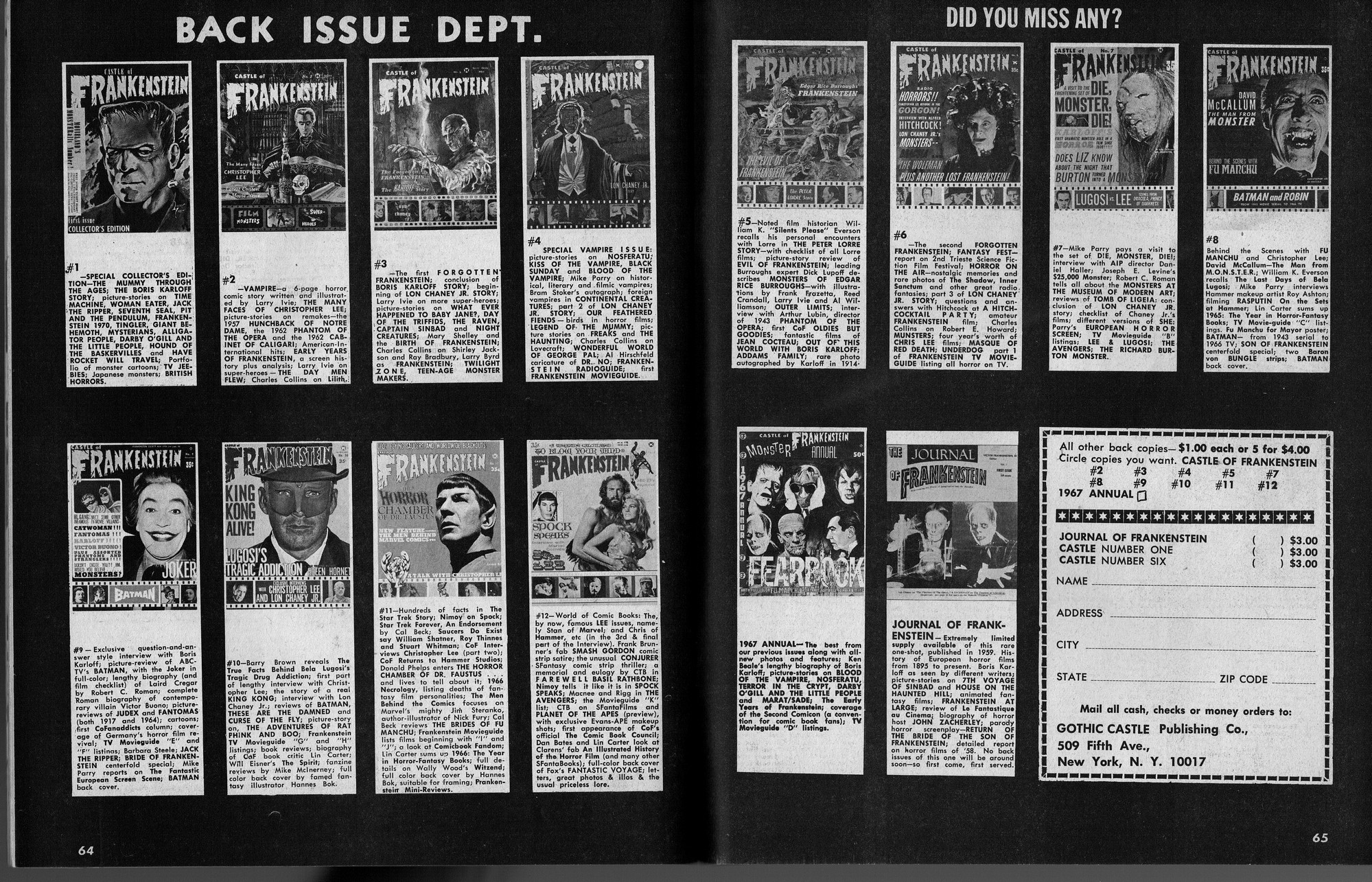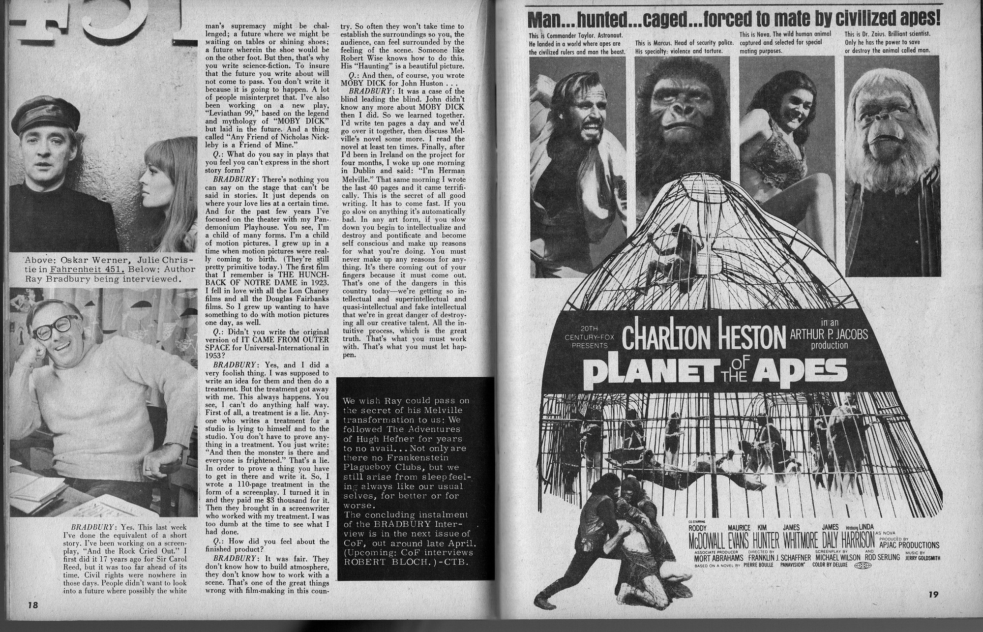 With Some Thoughts on Kubrick's 2001: A Space Odyssey, John Stanley's Interview with Ray Bradbury, and How They Filmed The Planet of the Apes, this would be a great issue already, but there's more. There's also An Interview With Basil Rathbone, fan magazines reviewed, and a fun on the set picture with Glenn Strange and comedian Ole Olsen on page 5. Here's the comic book reader version:  Download Castle of Frankenstein Issue 13