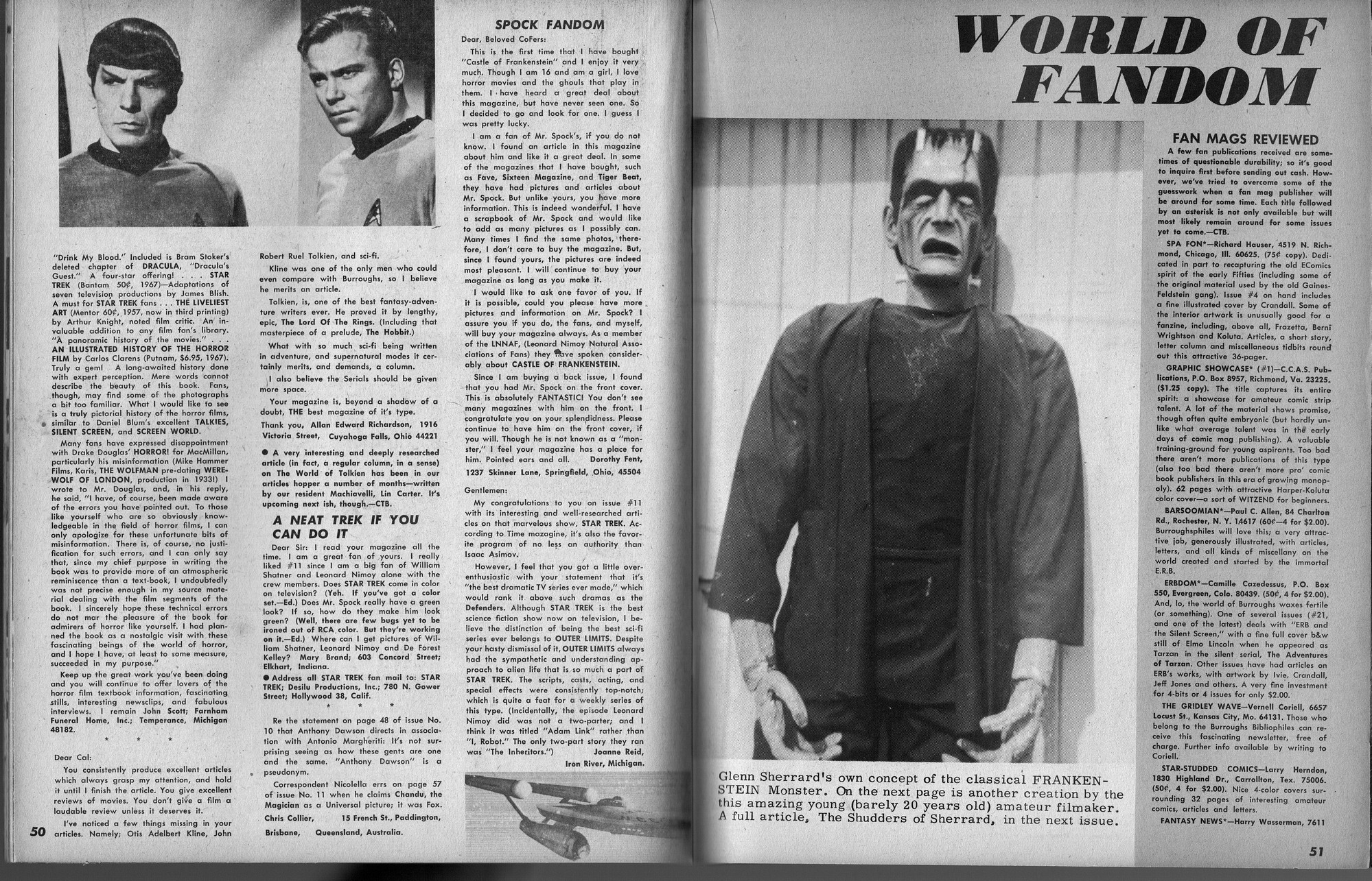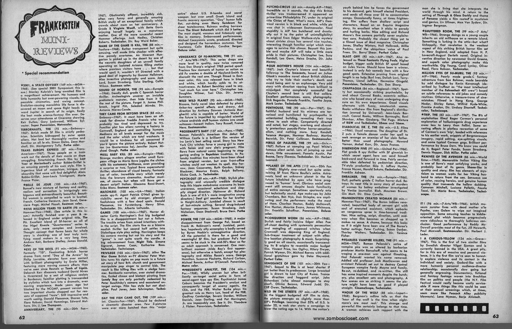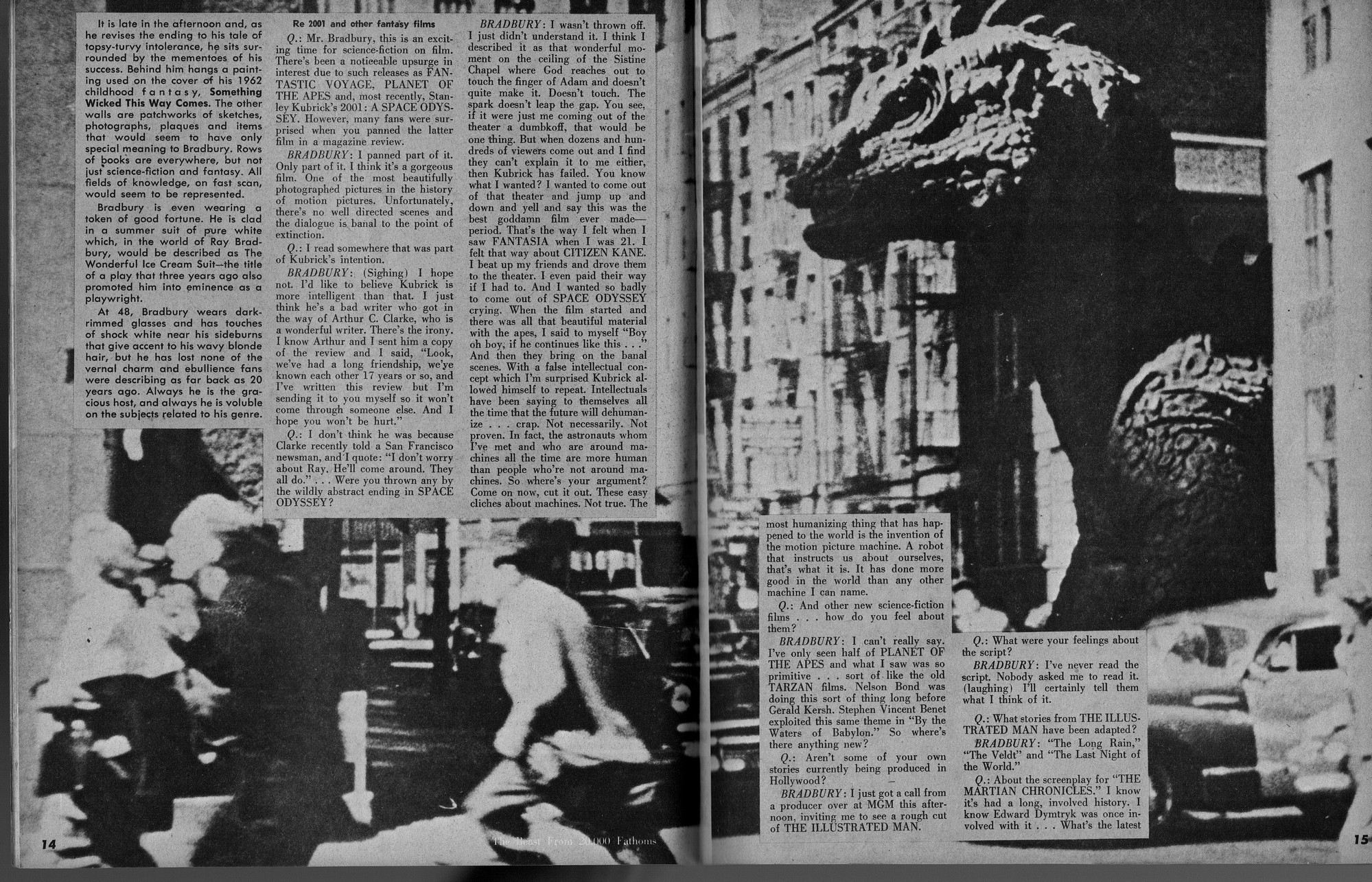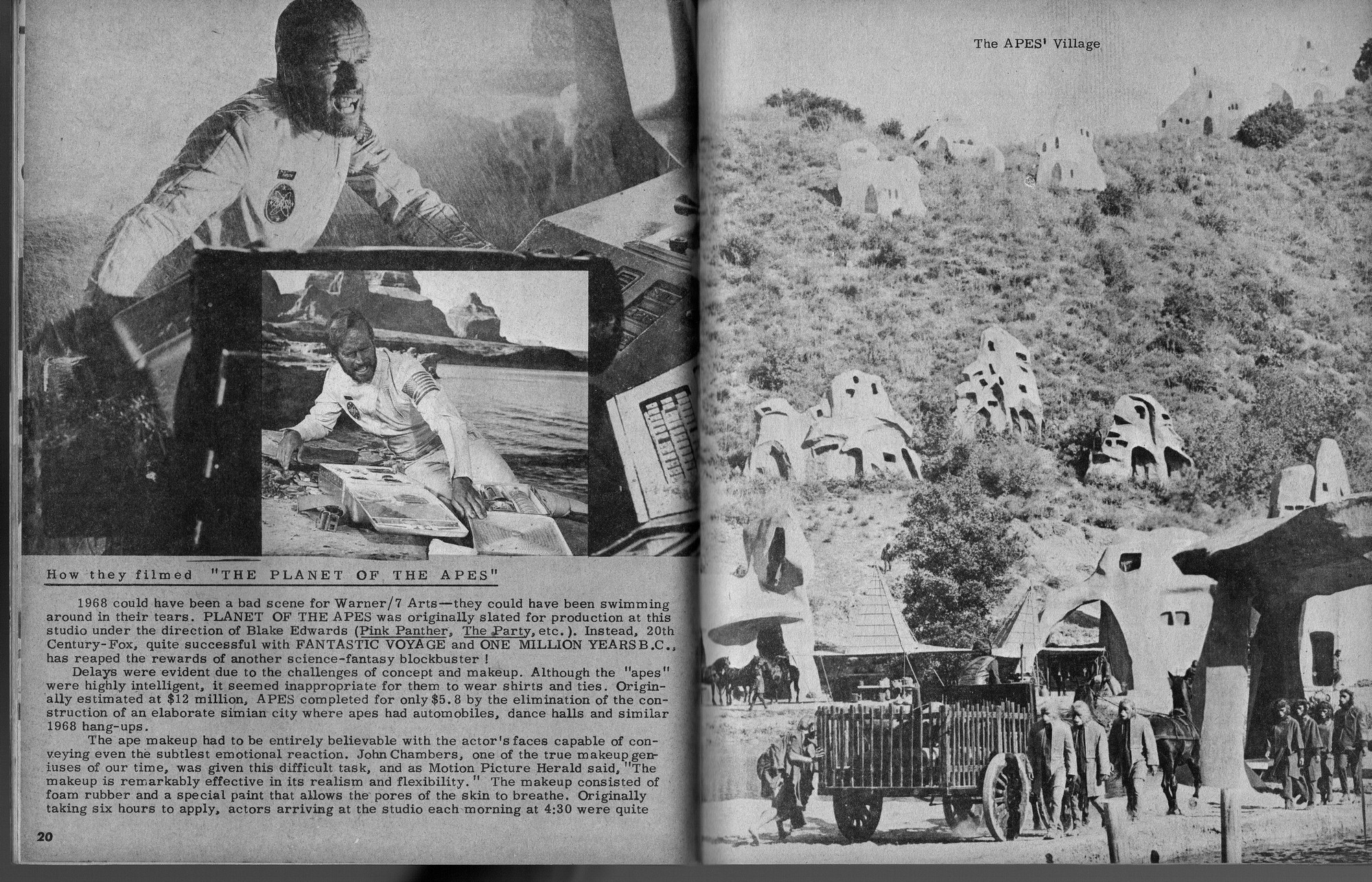 With Some Thoughts on Kubrick's 2001: A Space Odyssey, John Stanley's Interview with Ray Bradbury, and How They Filmed The Planet of the Apes, this would be a great issue already, but there's more. There's also An Interview With Basil Rathbone, fan magazines reviewed, and a fun on the set picture with Glenn Strange and comedian Ole Olsen on page 5. Here's the comic book reader version:  Download Castle of Frankenstein Issue 13
