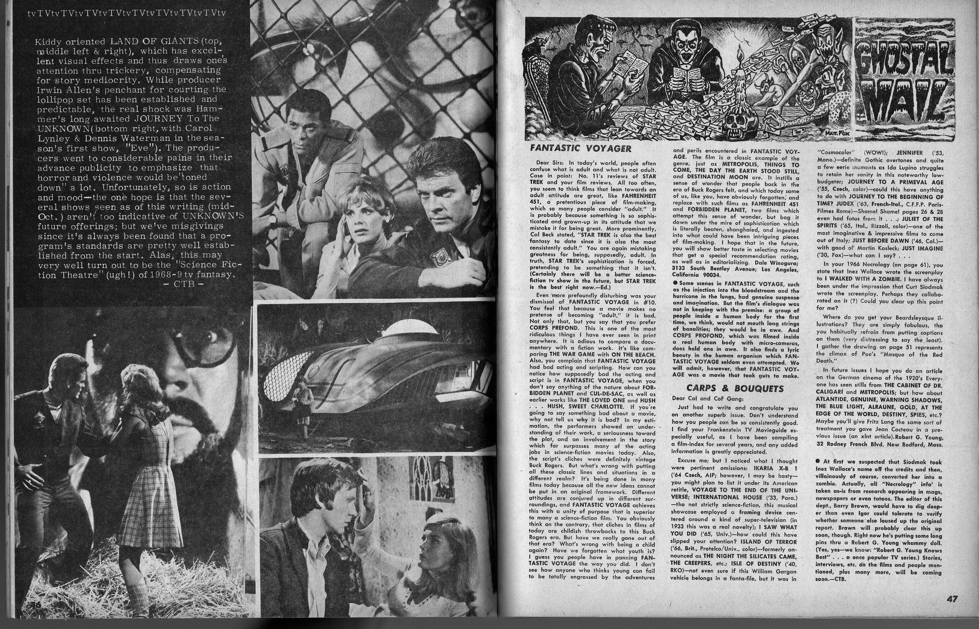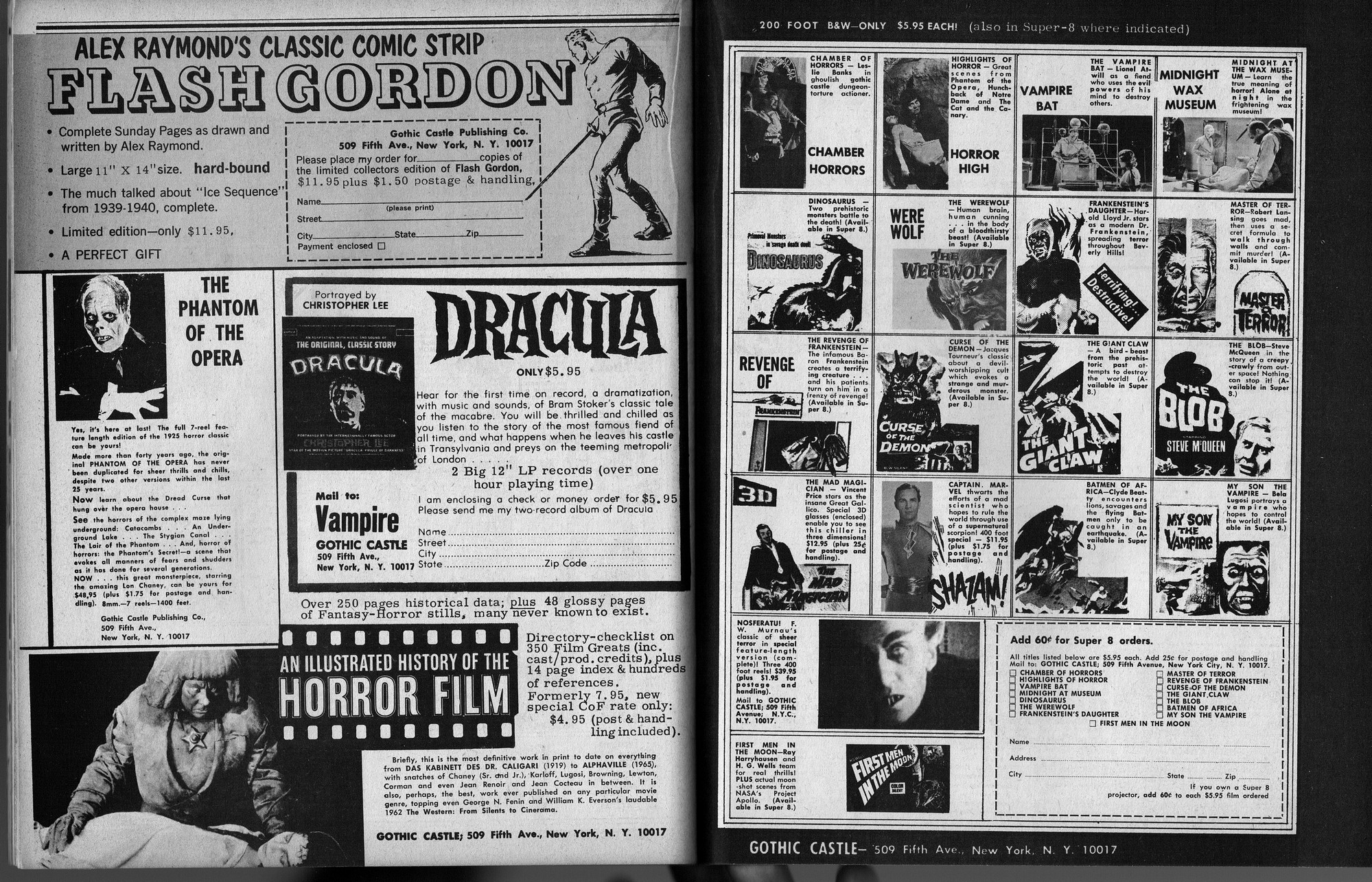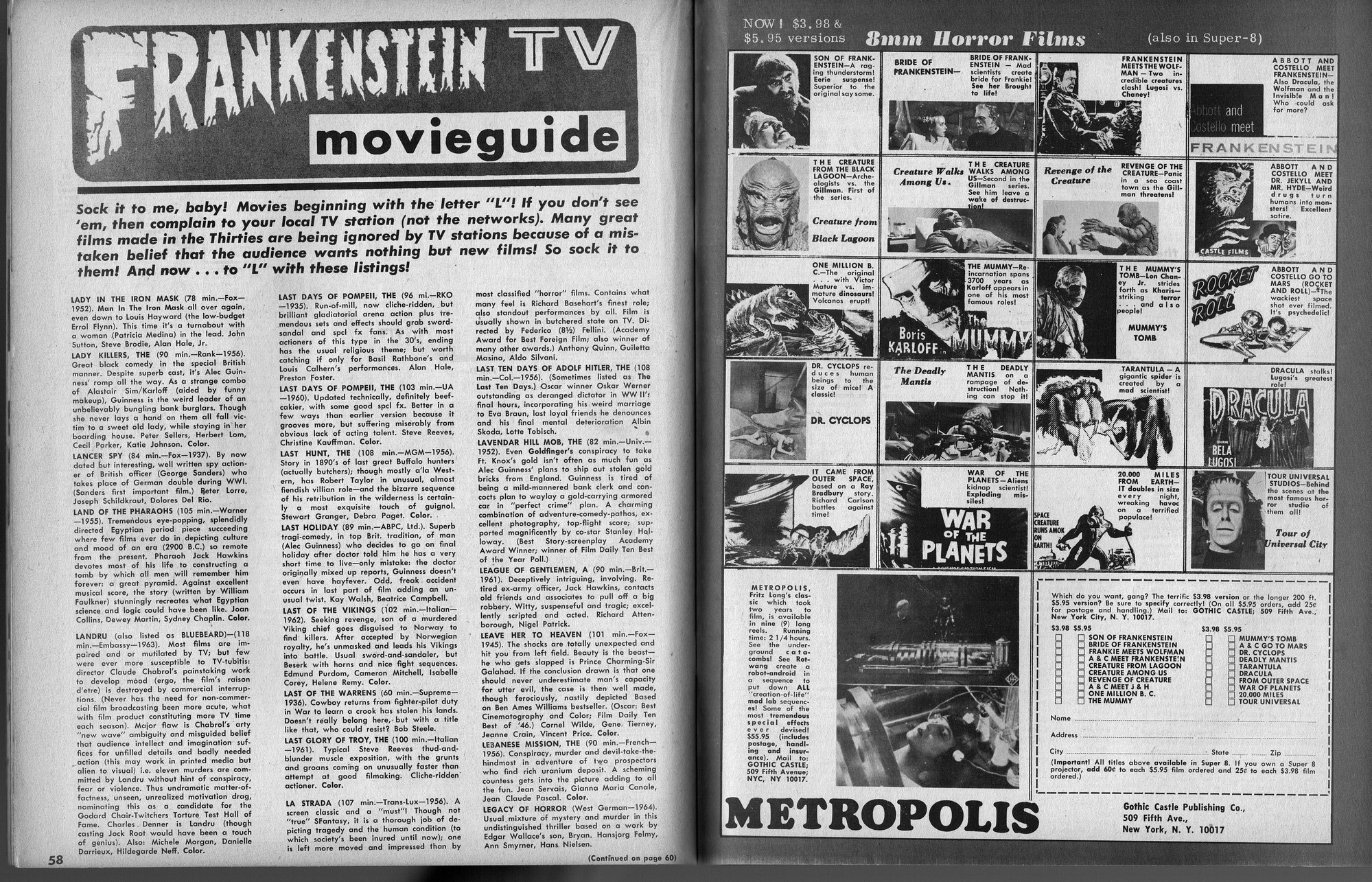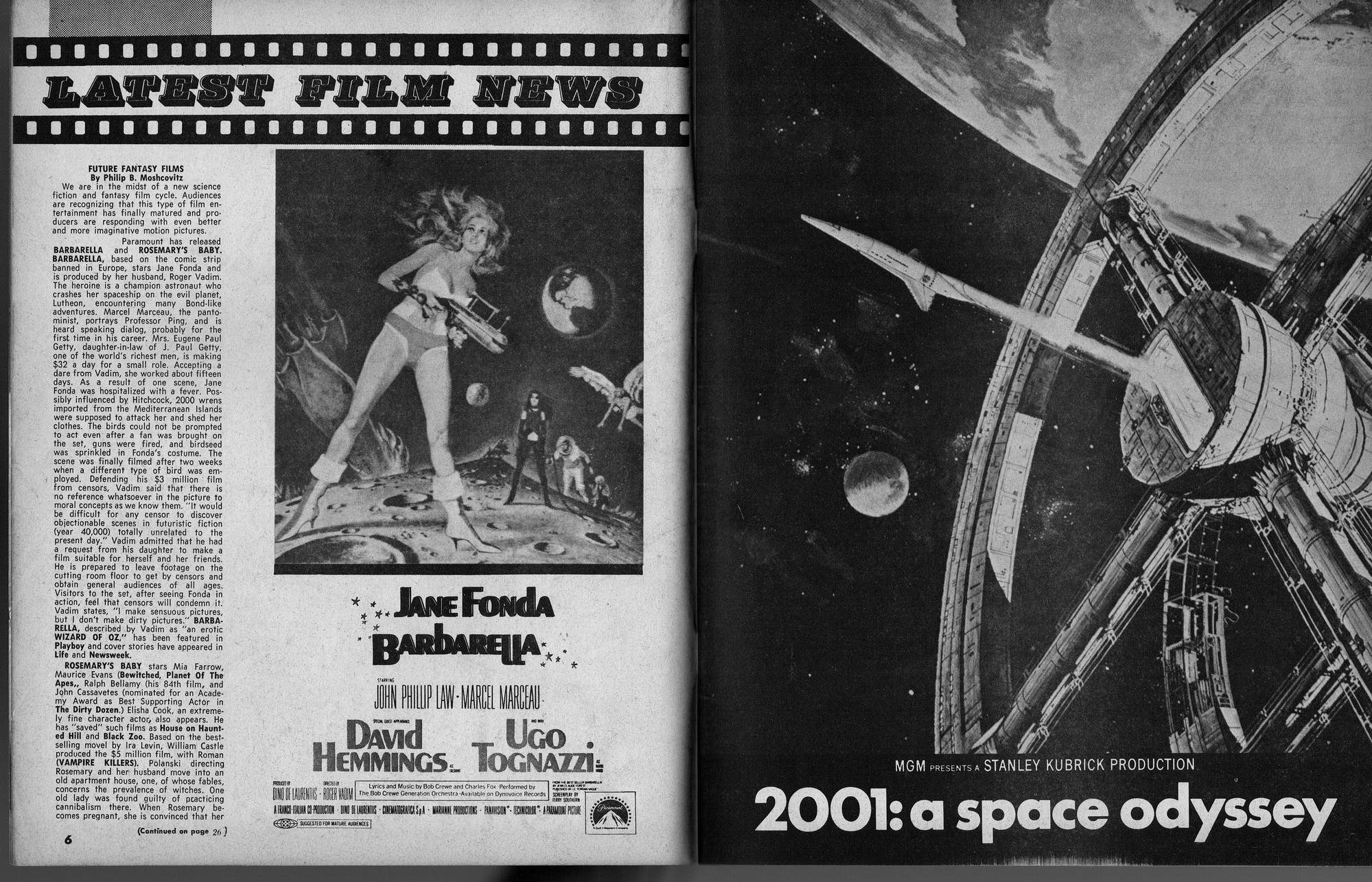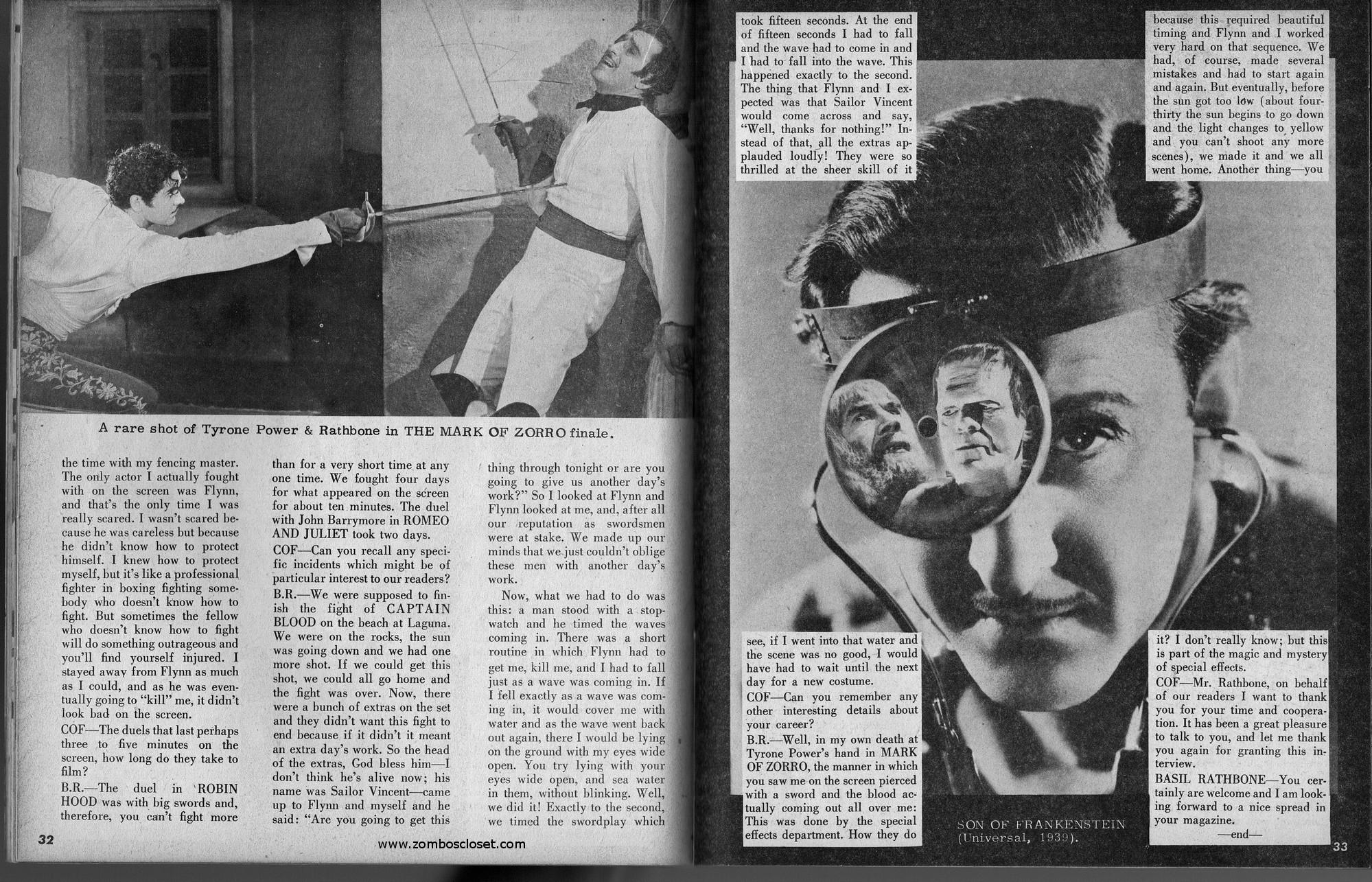 With Some Thoughts on Kubrick's 2001: A Space Odyssey, John Stanley's Interview with Ray Bradbury, and How They Filmed The Planet of the Apes, this would be a great issue already, but there's more. There's also An Interview With Basil Rathbone, fan magazines reviewed, and a fun on the set picture with Glenn Strange and comedian Ole Olsen on page 5. Here's the comic book reader version:  Download Castle of Frankenstein Issue 13