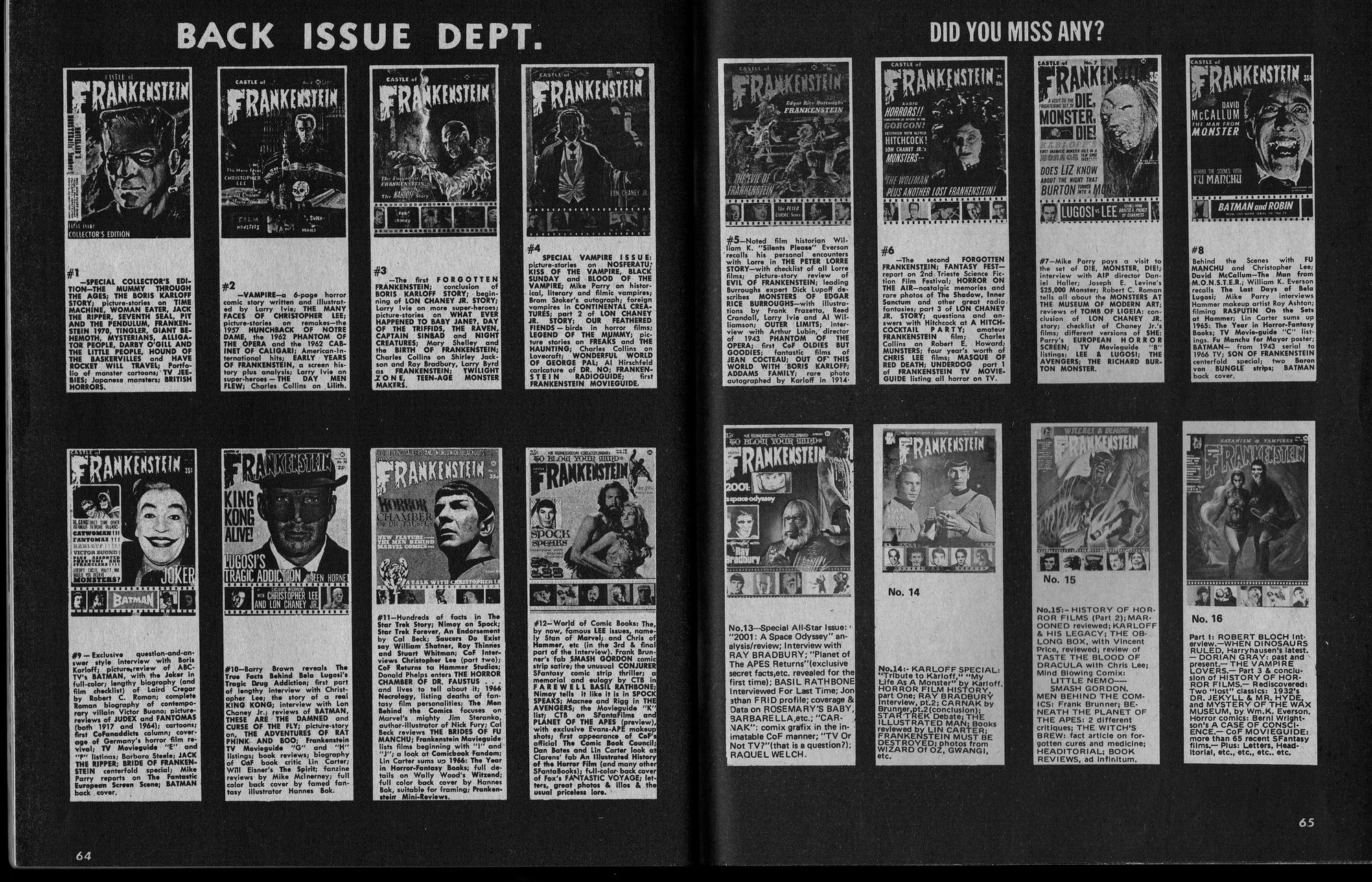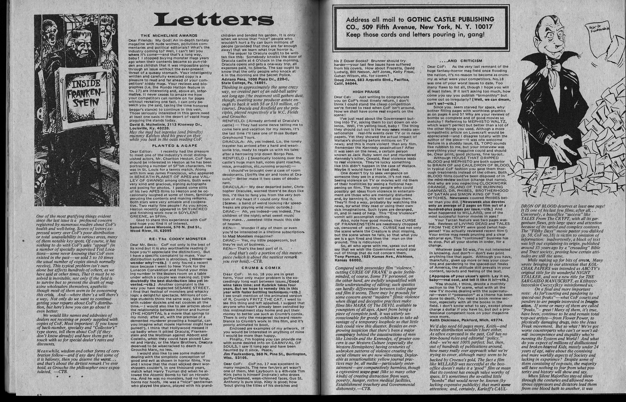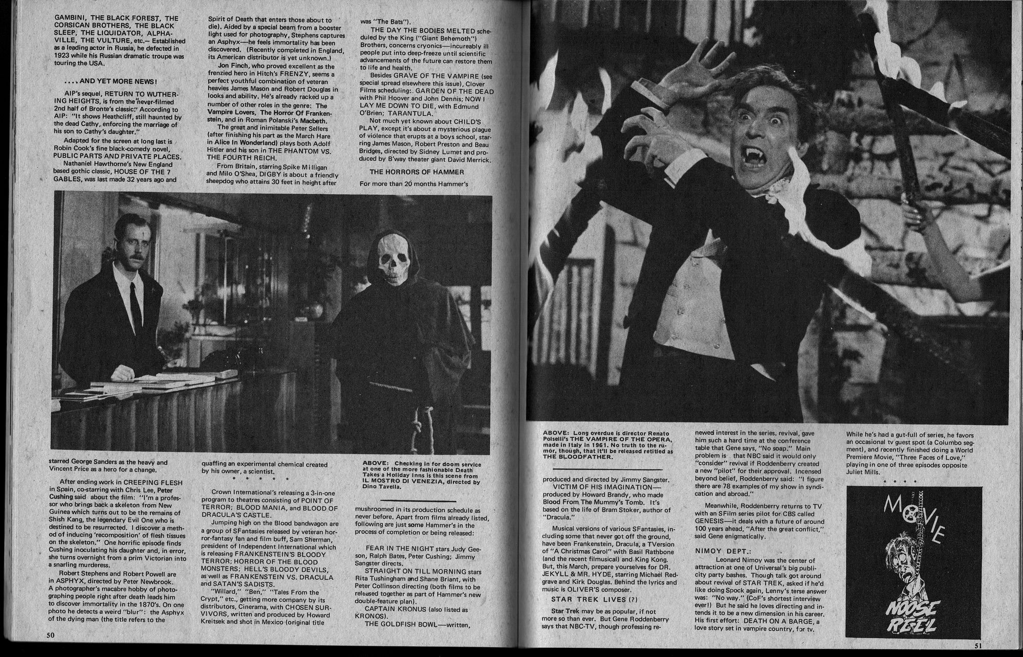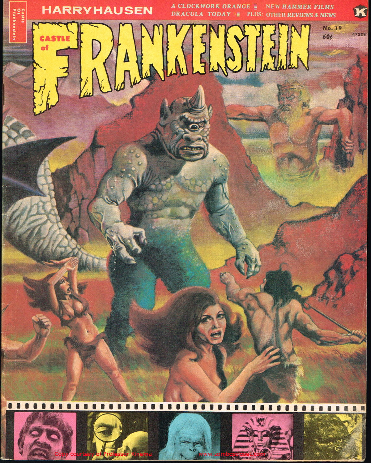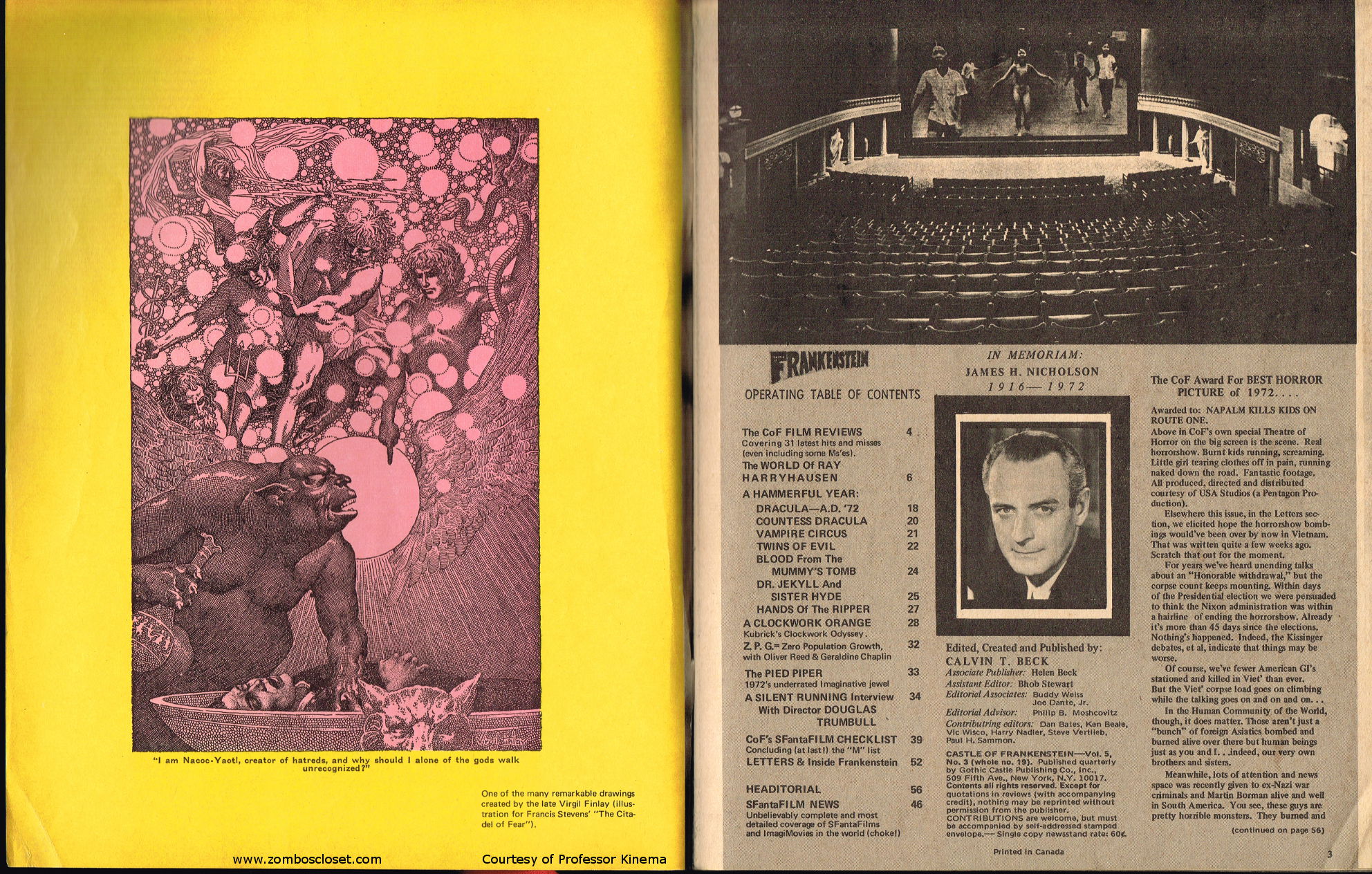 Issue 19 of Castle of Frankenstein contains the usual reviews (including Hammer Horror) and interviews (with Ray Harryhausen and Douglas Trumbull). Social commentary (this is the 1970s) enters with CoF's best horror film of the year choice: Vietnamese children running from a napalm attack.  A reader really dislikes issue 18 and wishes CoF would publish more frequently.