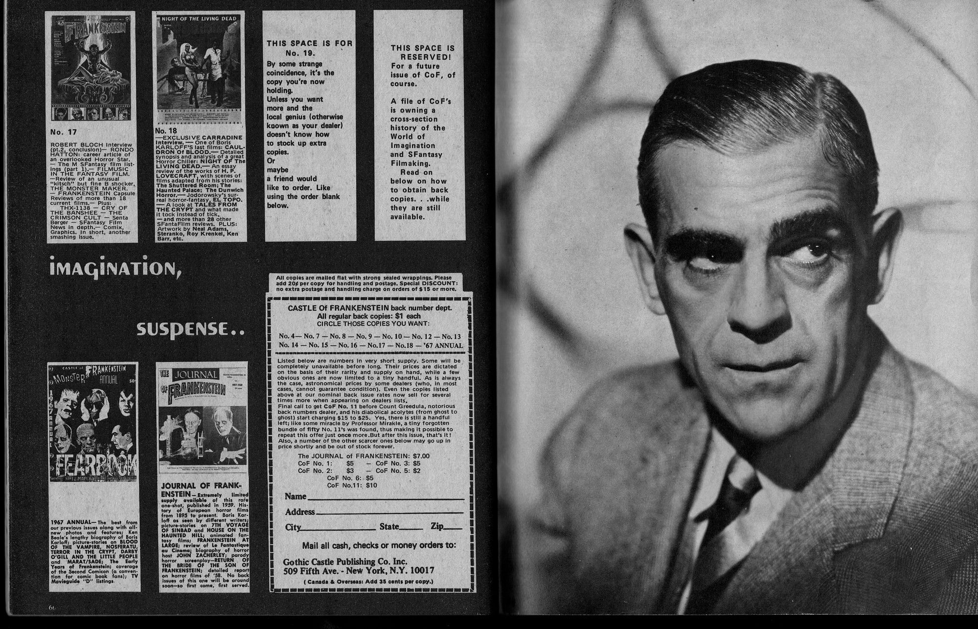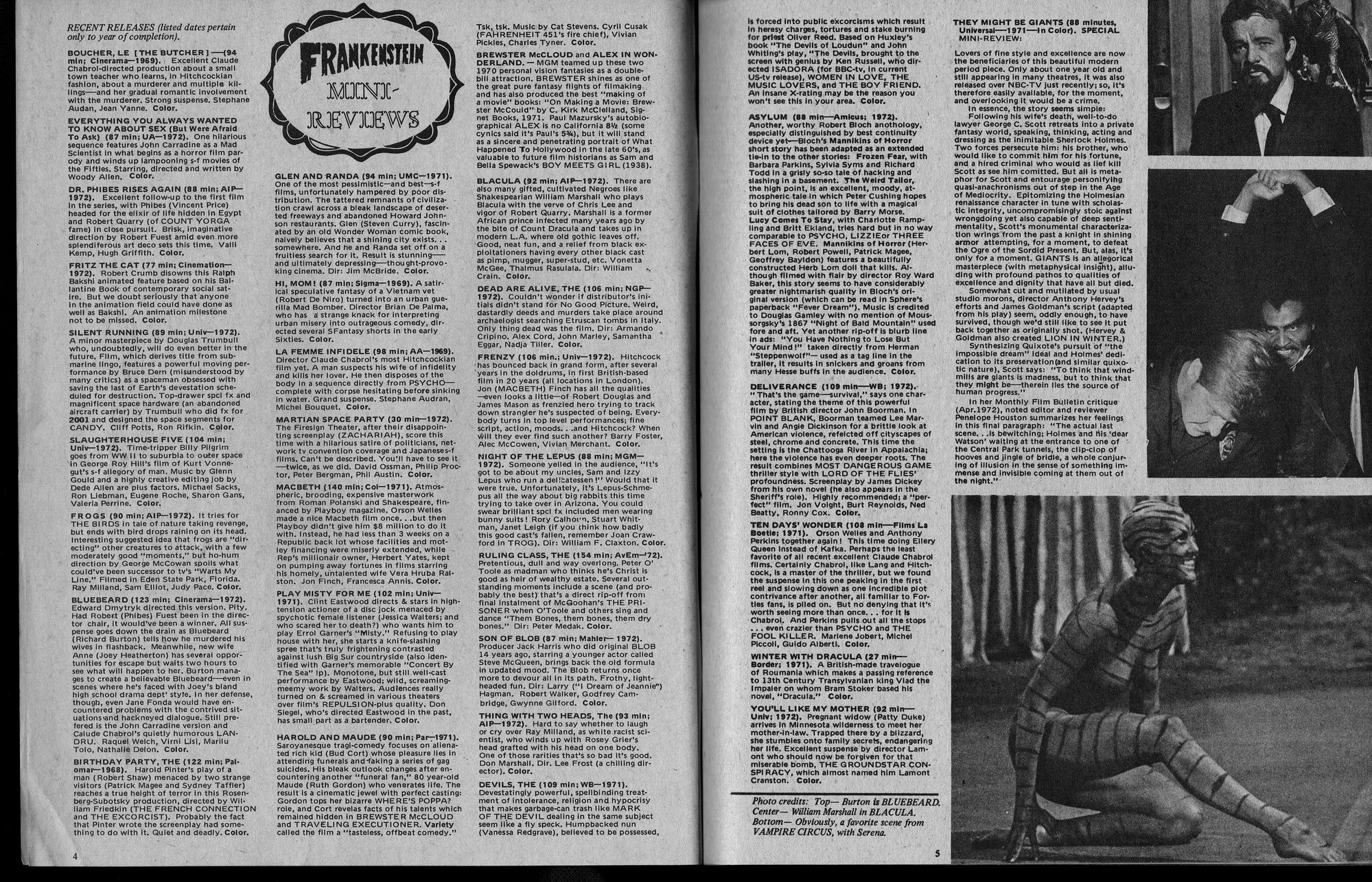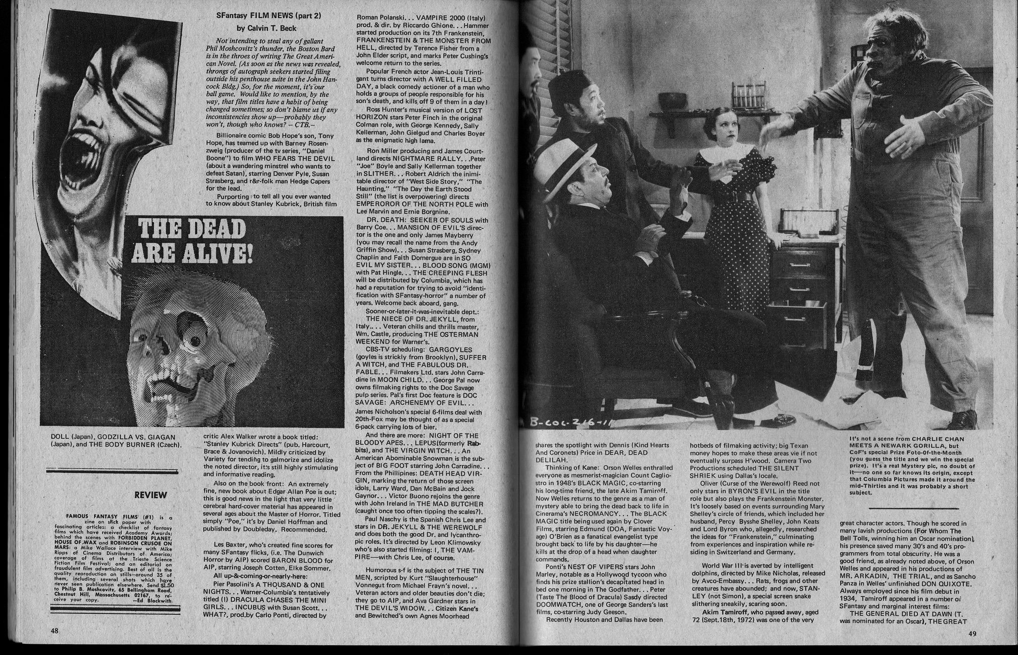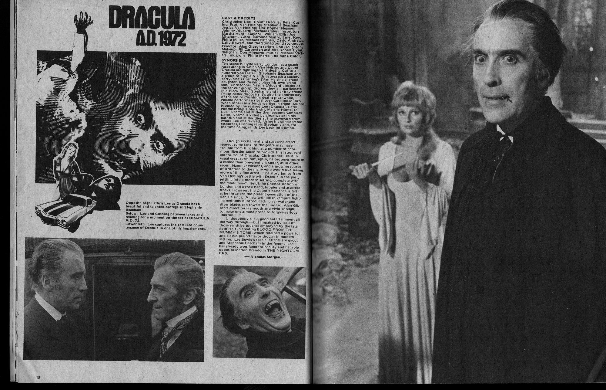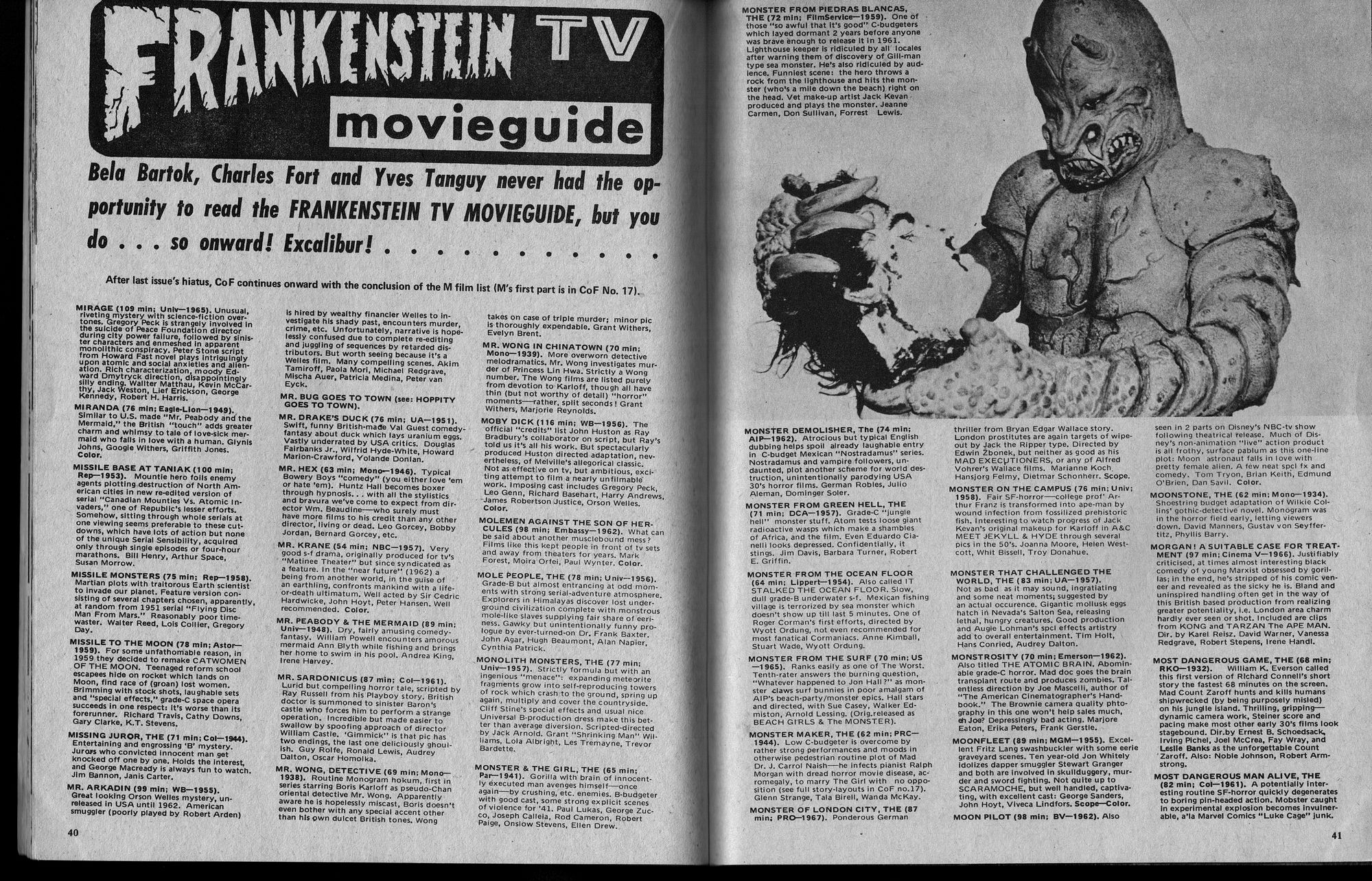 Issue 19 of Castle of Frankenstein contains the usual reviews (including Hammer Horror) and interviews (with Ray Harryhausen and Douglas Trumbull). Social commentary (this is the 1970s) enters with CoF's best horror film of the year choice: Vietnamese children running from a napalm attack.  A reader really dislikes issue 18 and wishes CoF would publish more frequently.